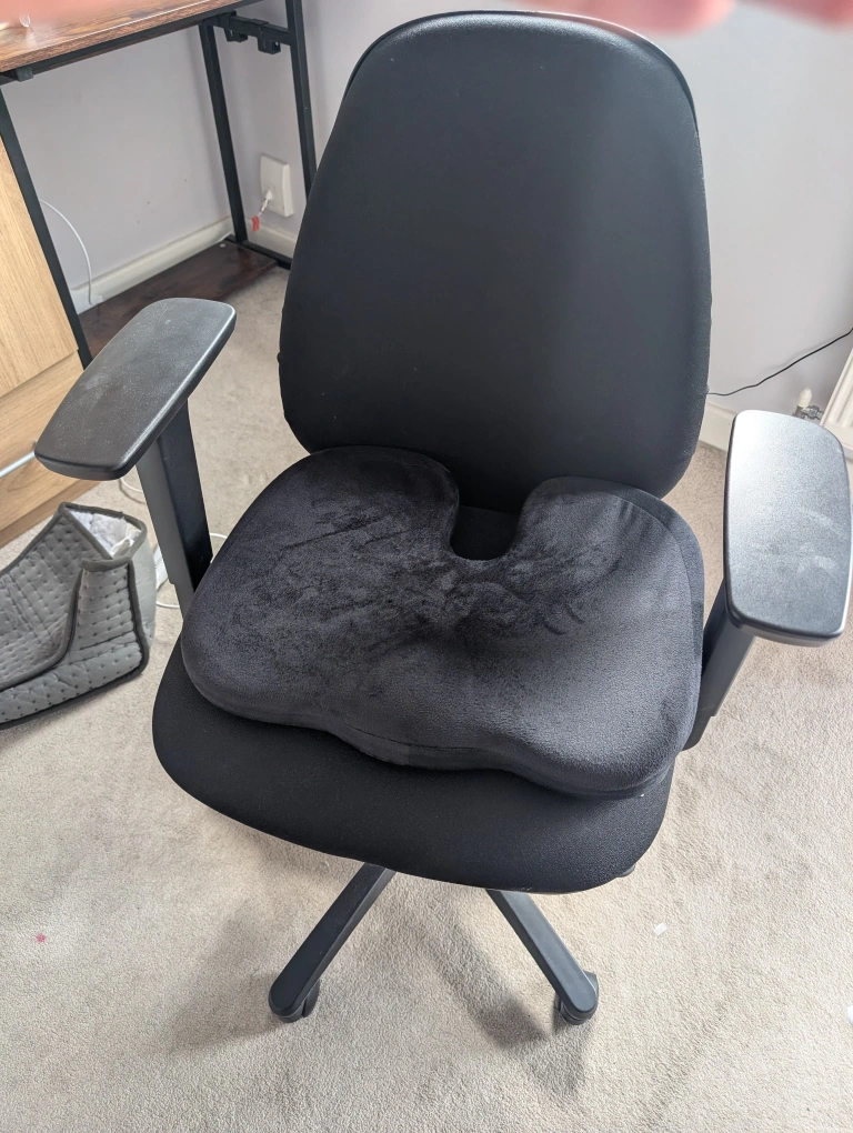 0 reviewsSelling a black office chair that's in good nick. It comes with a seat cushion for extra comfort. Perfect for working from home or gaming. It's a sturdy chair and ready for a new home