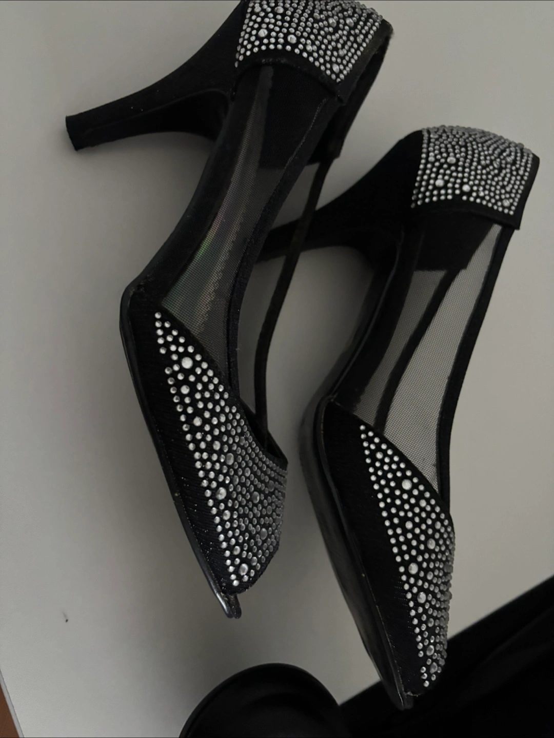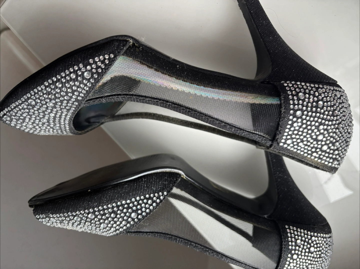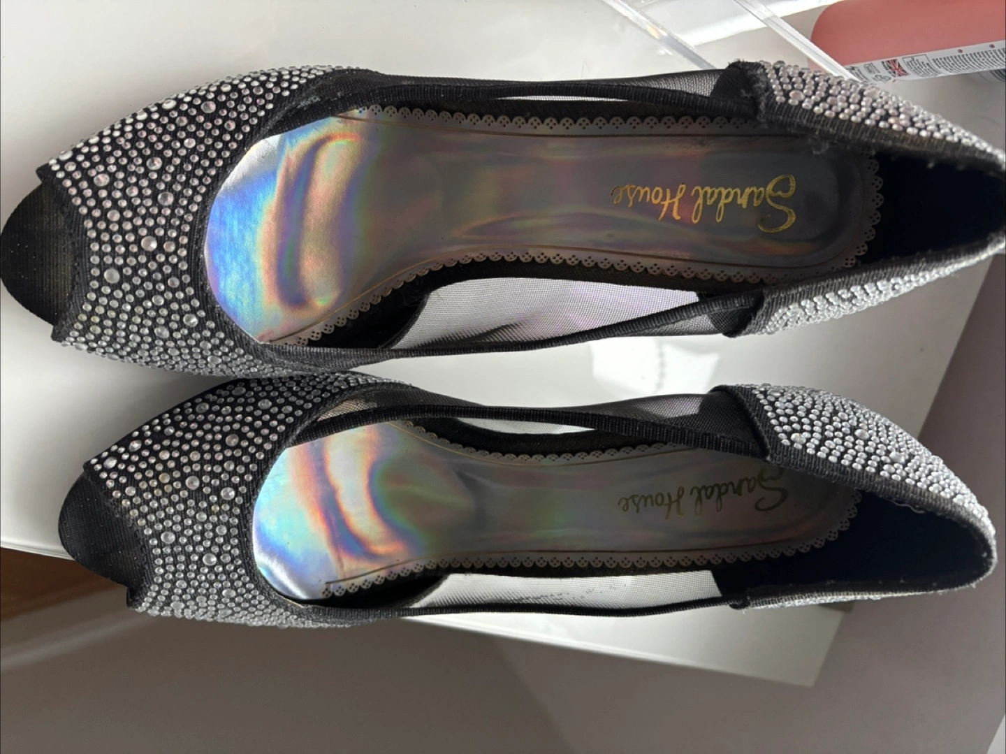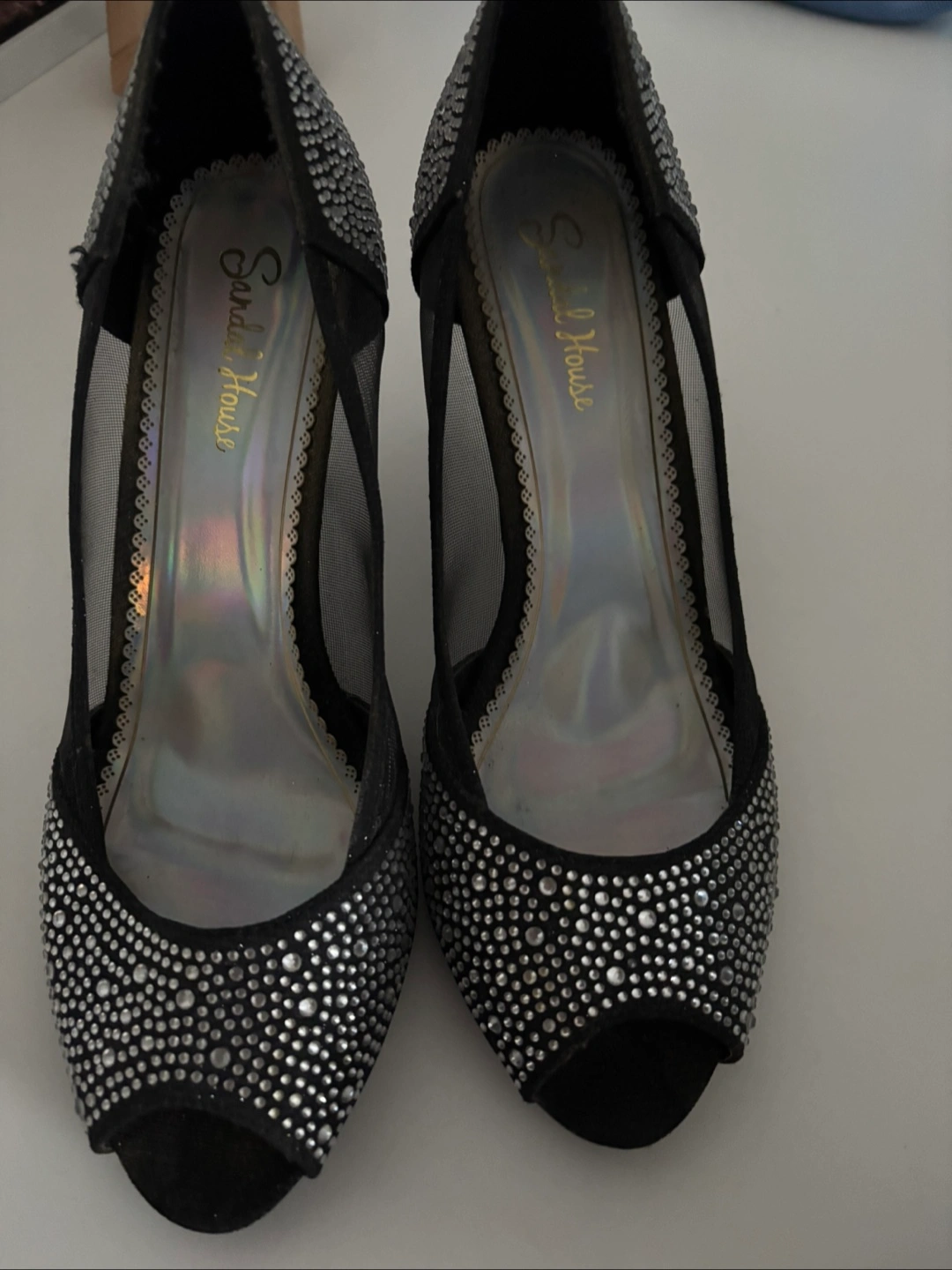 6 reviewsBlack open toe shoes Glittery heals Ideal for parties,weddings, special Occasions Sold as seen Buyer to collect Thank you for viewing