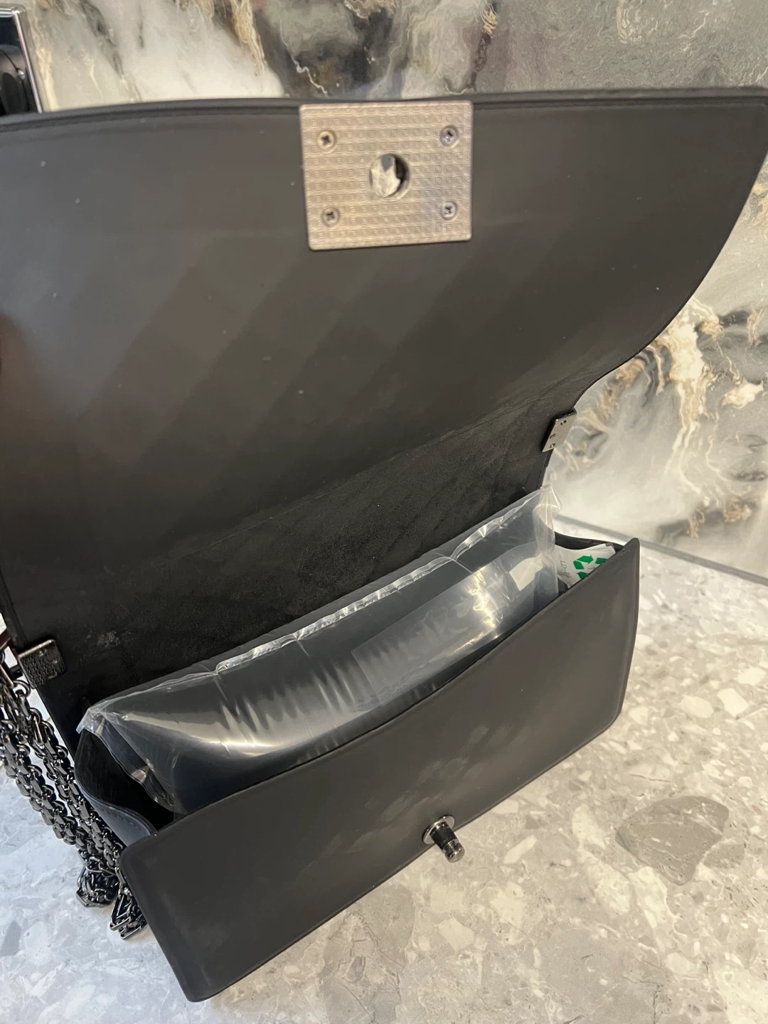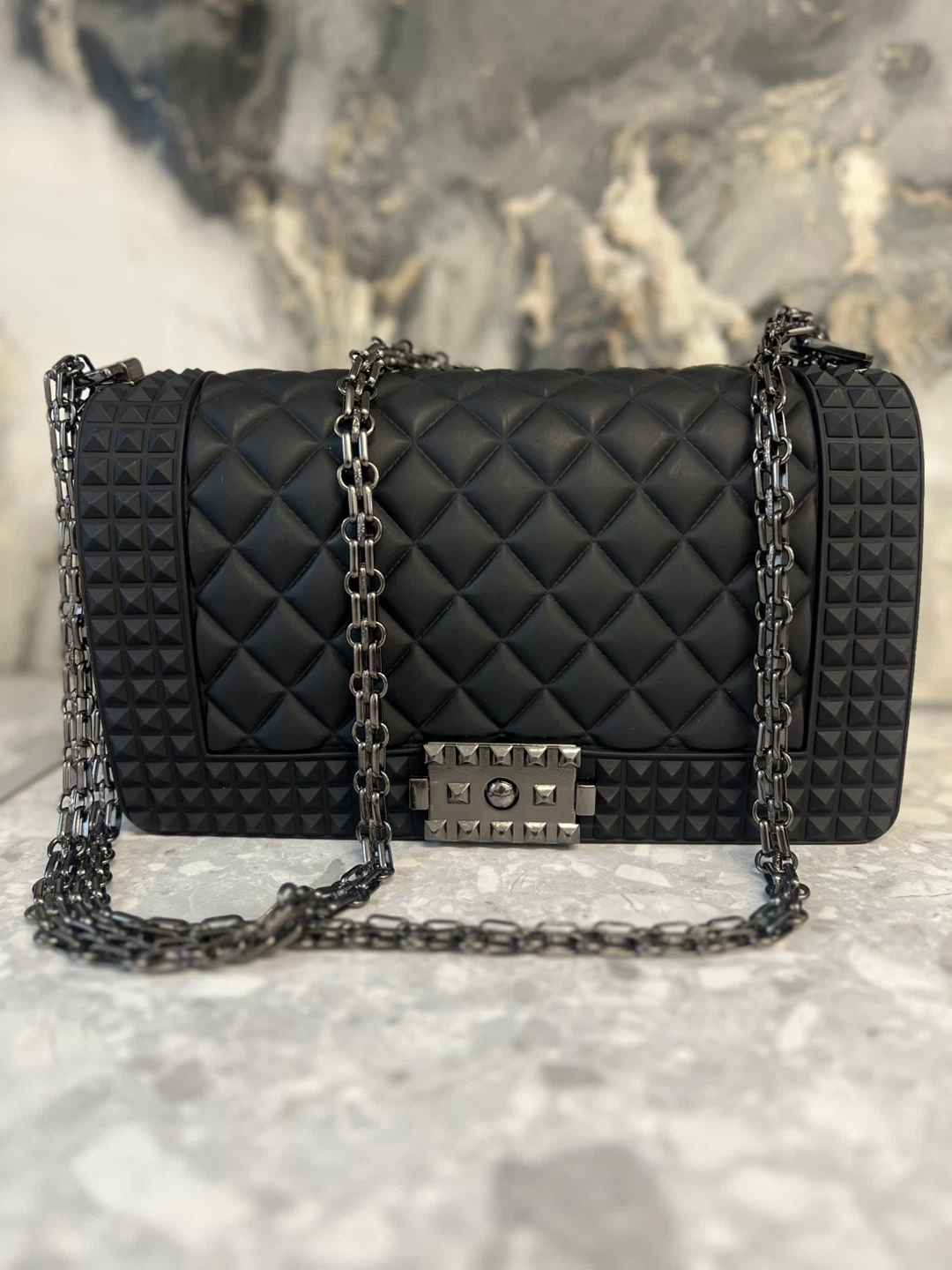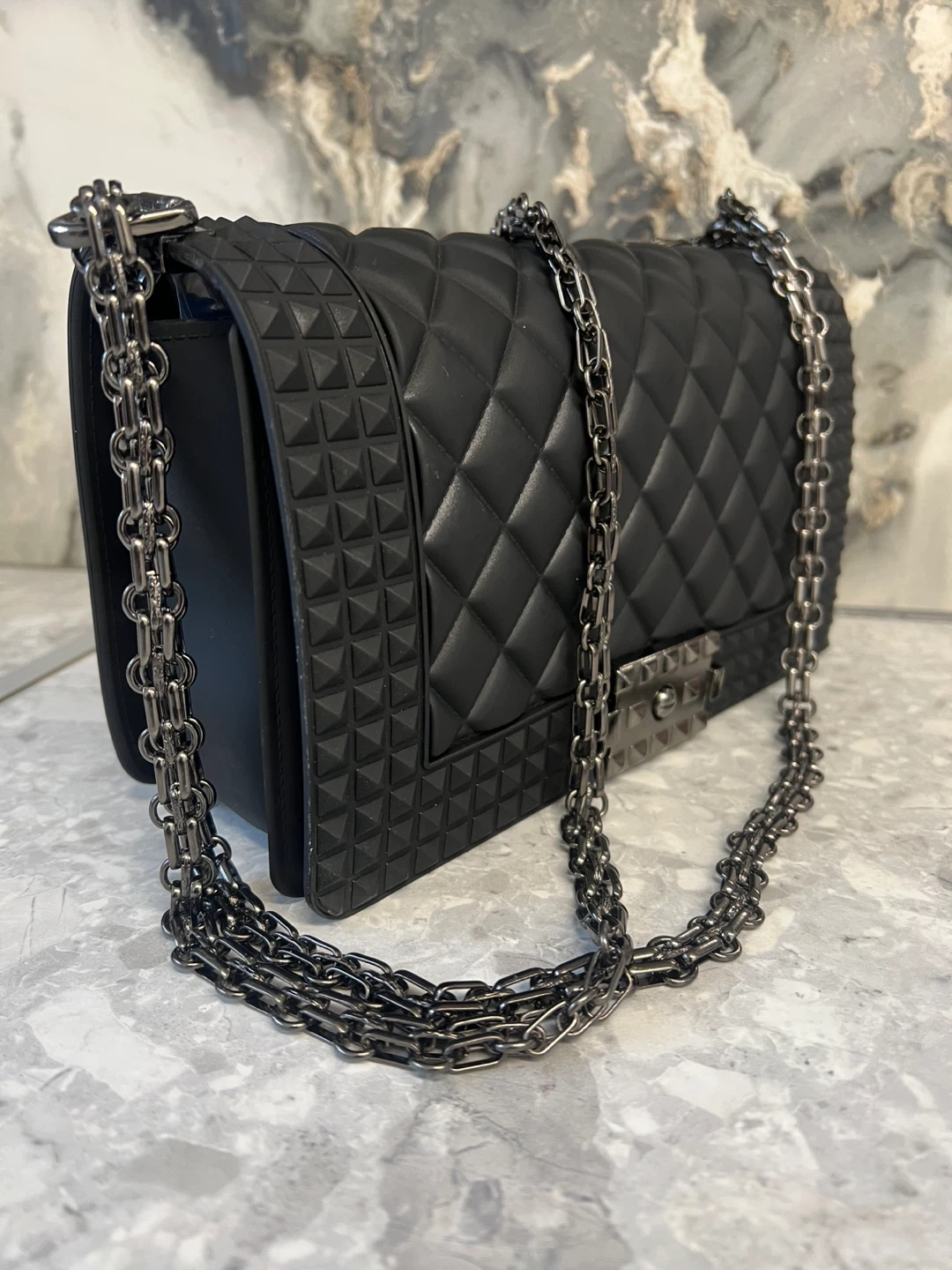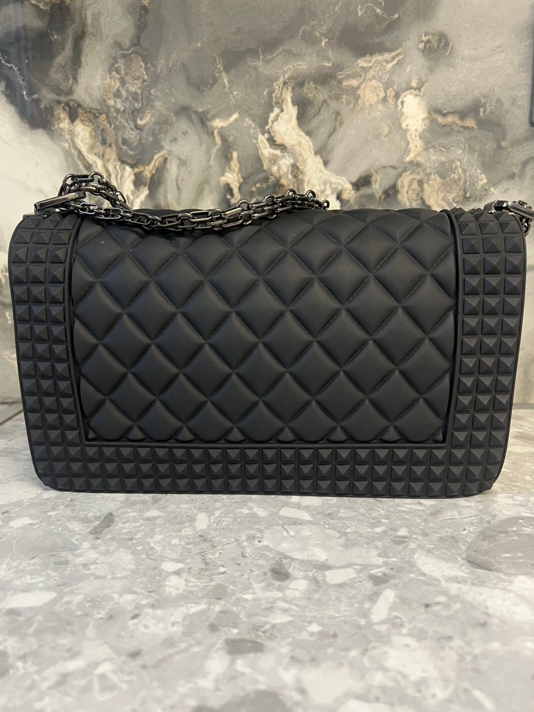 0 reviewsA stylish black quilted shoulder bag with a chain strap. This bag features a quilted pattern and studded detailing around the edges. It's perfect for adding a touch of edgy elegance to any outfit!