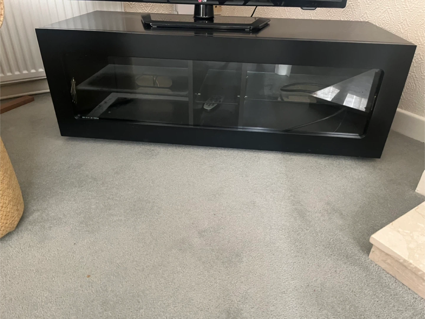 1 reviewHere's a sleek black TV stand. It has glass shelves, perfect for storing your media devices or displaying decorations. It's in good condition and ready to find a new home!
