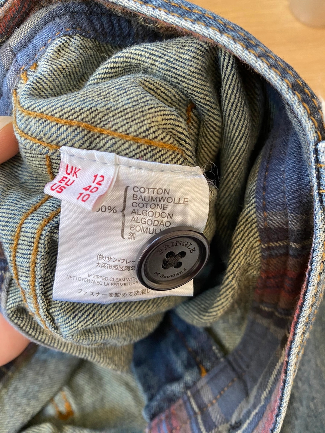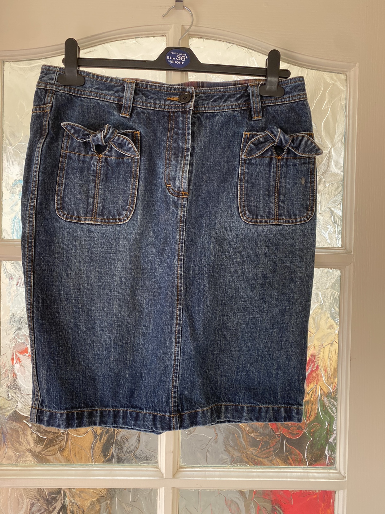 0 reviewsThis beautiful blue denim skirt by Pringle is a must-have addition to any wardrobe. With a button and zip closure, this skirt is both stylish and practical. Made from high-quality cotton, it is machine washable and perfect for all seasons. The skirt is a size 12, with a knee-length and a straight pencil style. It features bow decoration on the pockets, slit pockets, and is suitable for any occasion. The skirt is made from denim fabric, which gives it a durable and robust quality. It is perfect for women who want to look fashionable and stylish. There is small mark on 1 pocket please see pic