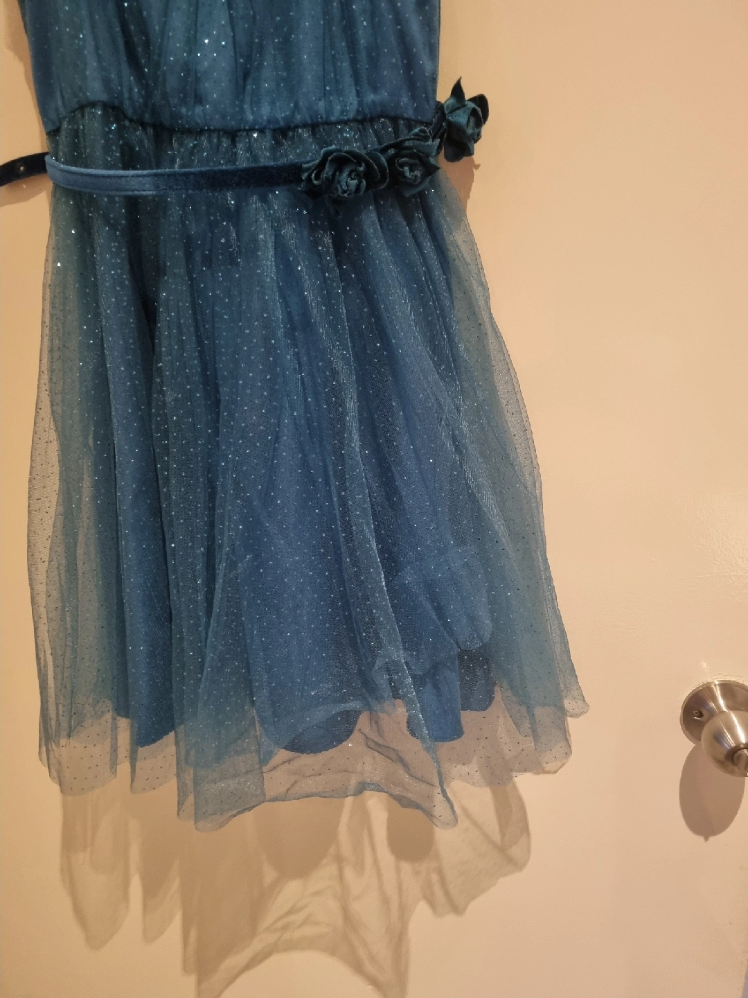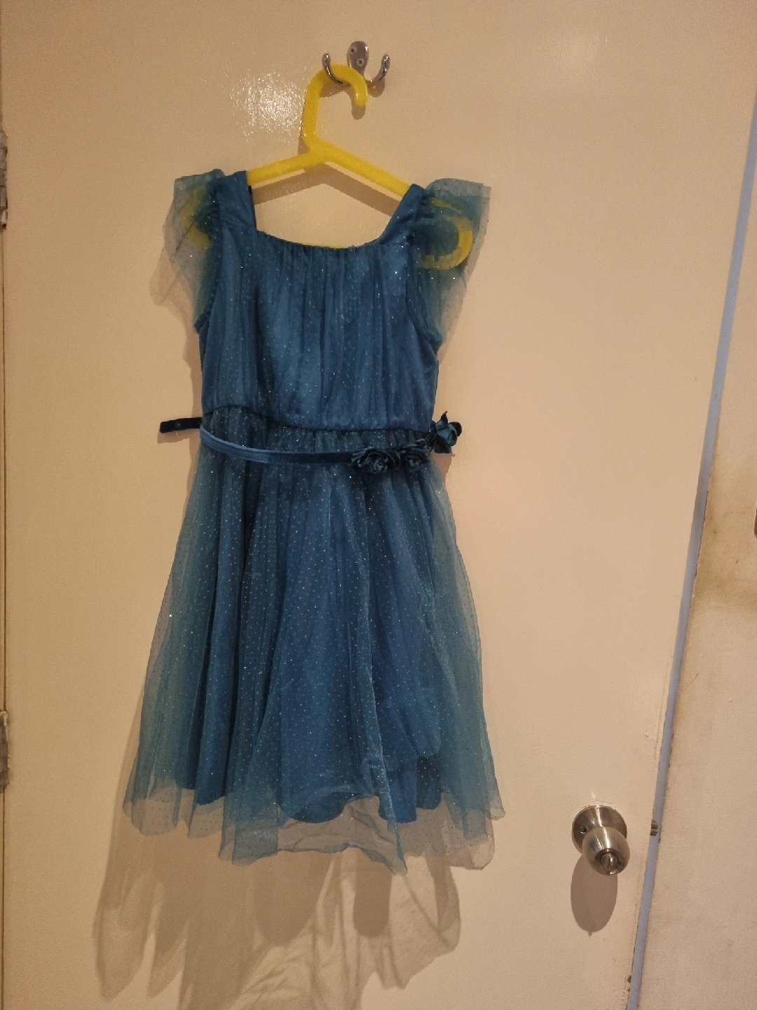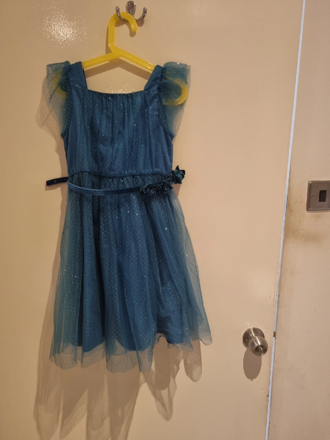 1 reviewA lovely blue dress for a special occasion. It features a tulle overlay with sparkly details and a cute flower embellishment at the waist. Perfect for parties or dressing up! Collection only