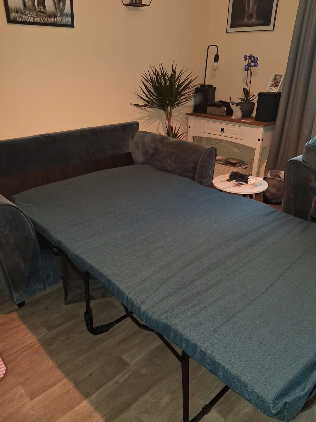 11 reviewsSelling a sofa bed and armchair set in a lovely blue colour. It's in good condition and would be perfect for a living room or spare room. The sofa easily converts into a bed, making it ideal for guests. The armchair is also super comfy!