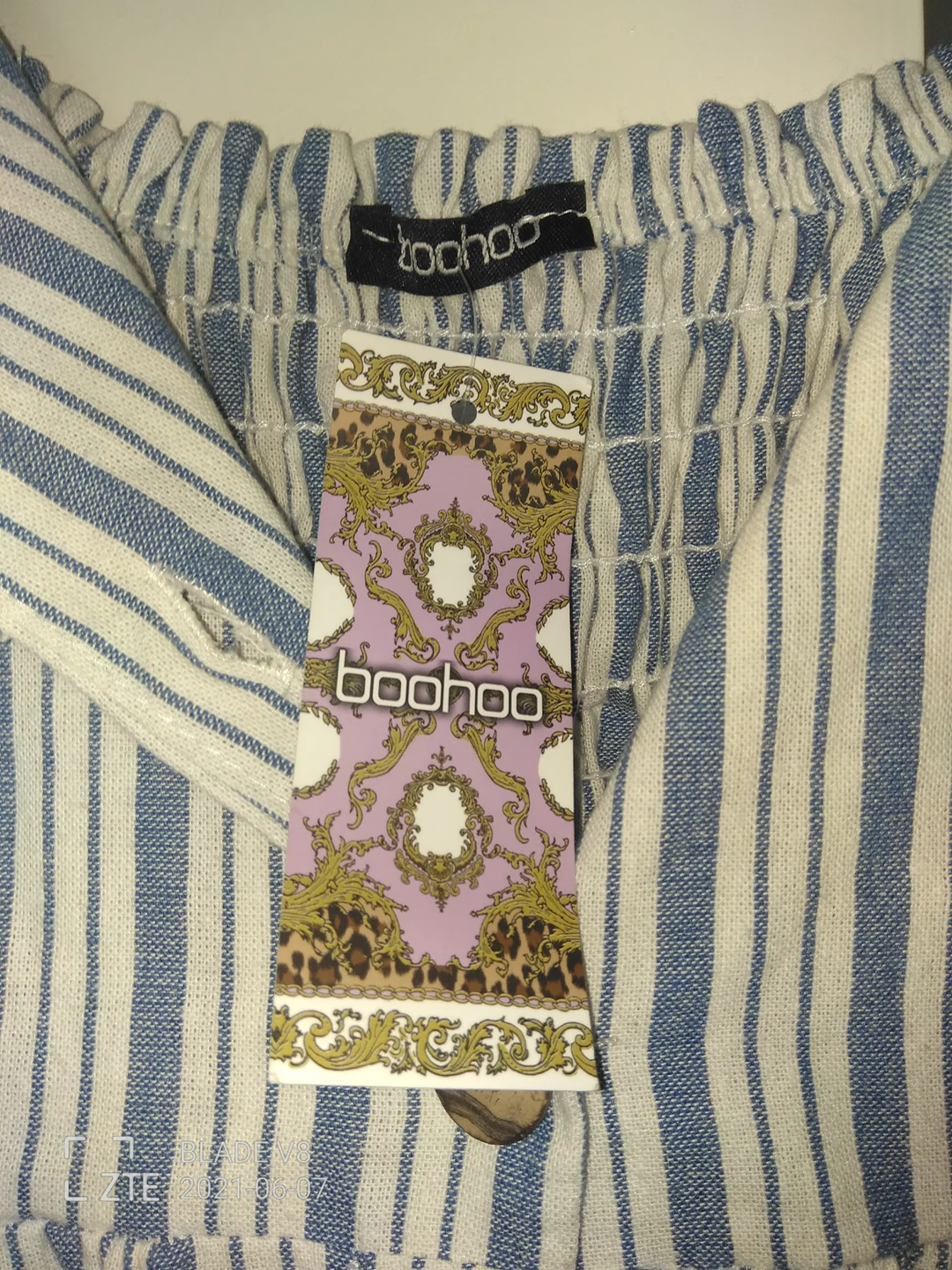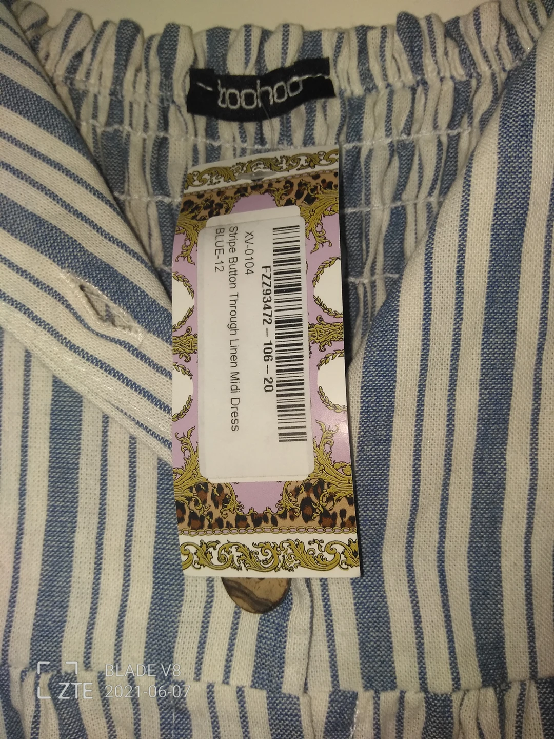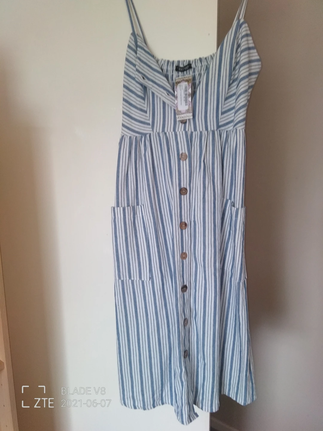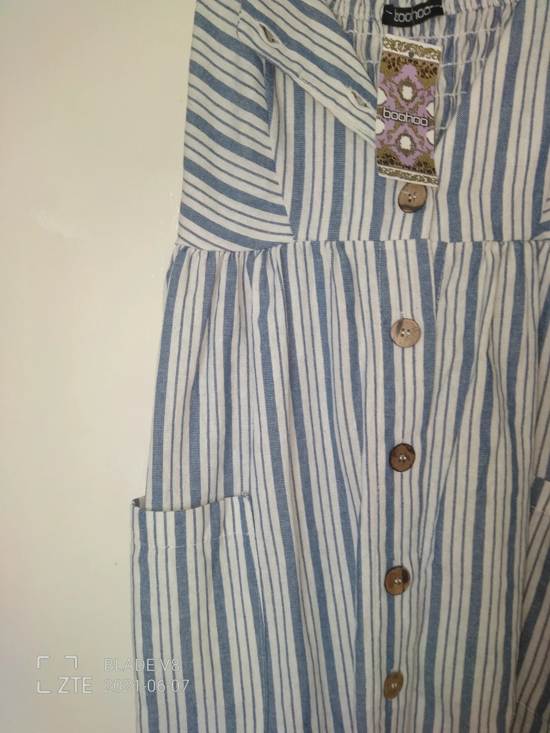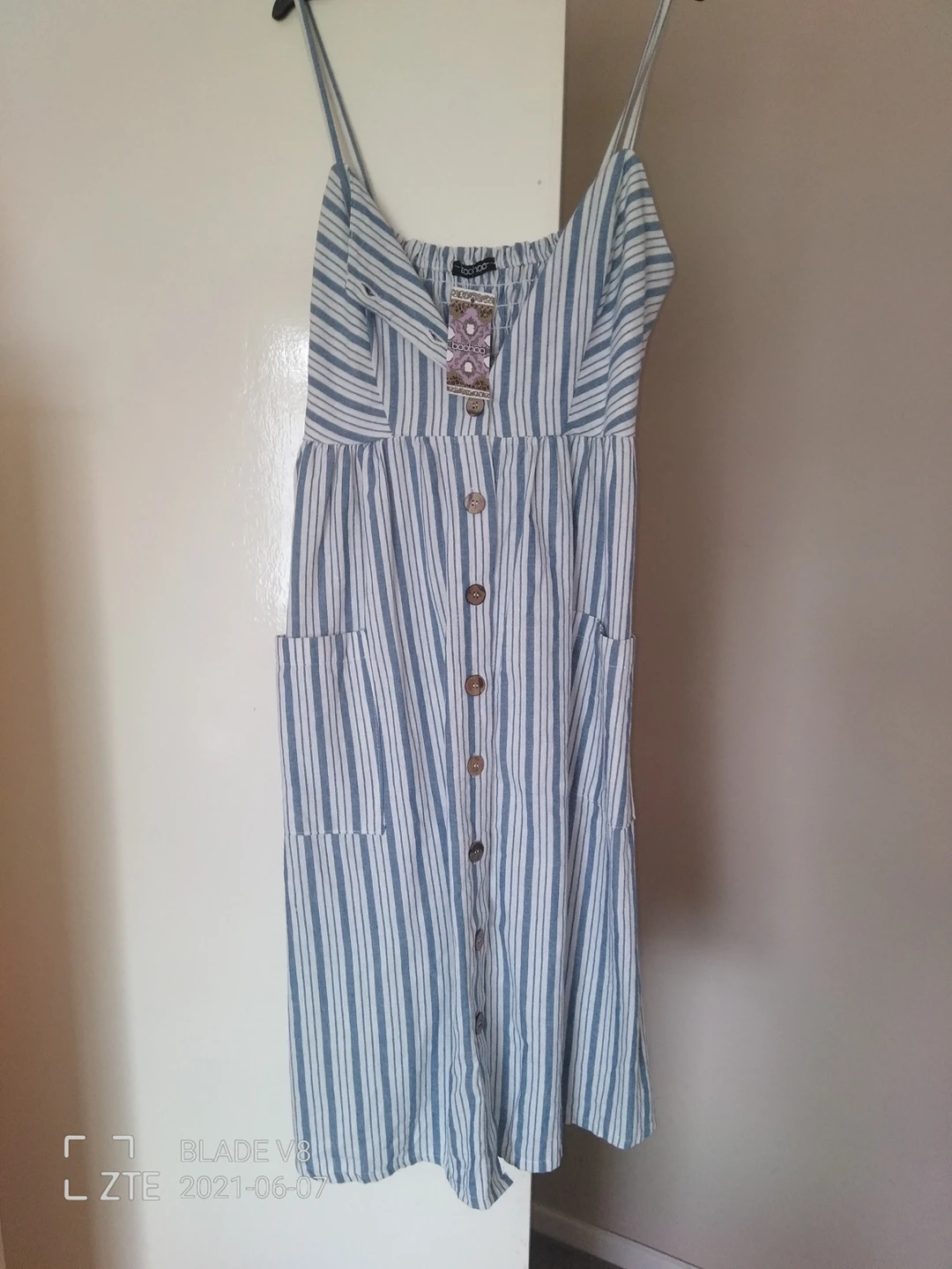 3 reviewsLovely blue/ white linen striped summer dress with two pockets and buttons down front. From Boohoo .com and a size 12 has original tags and is Brand New.