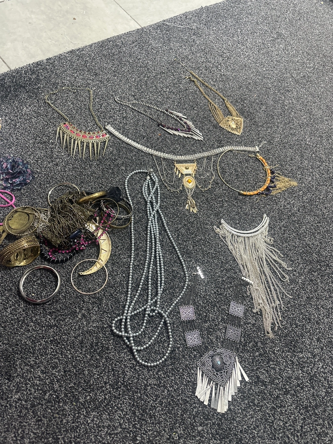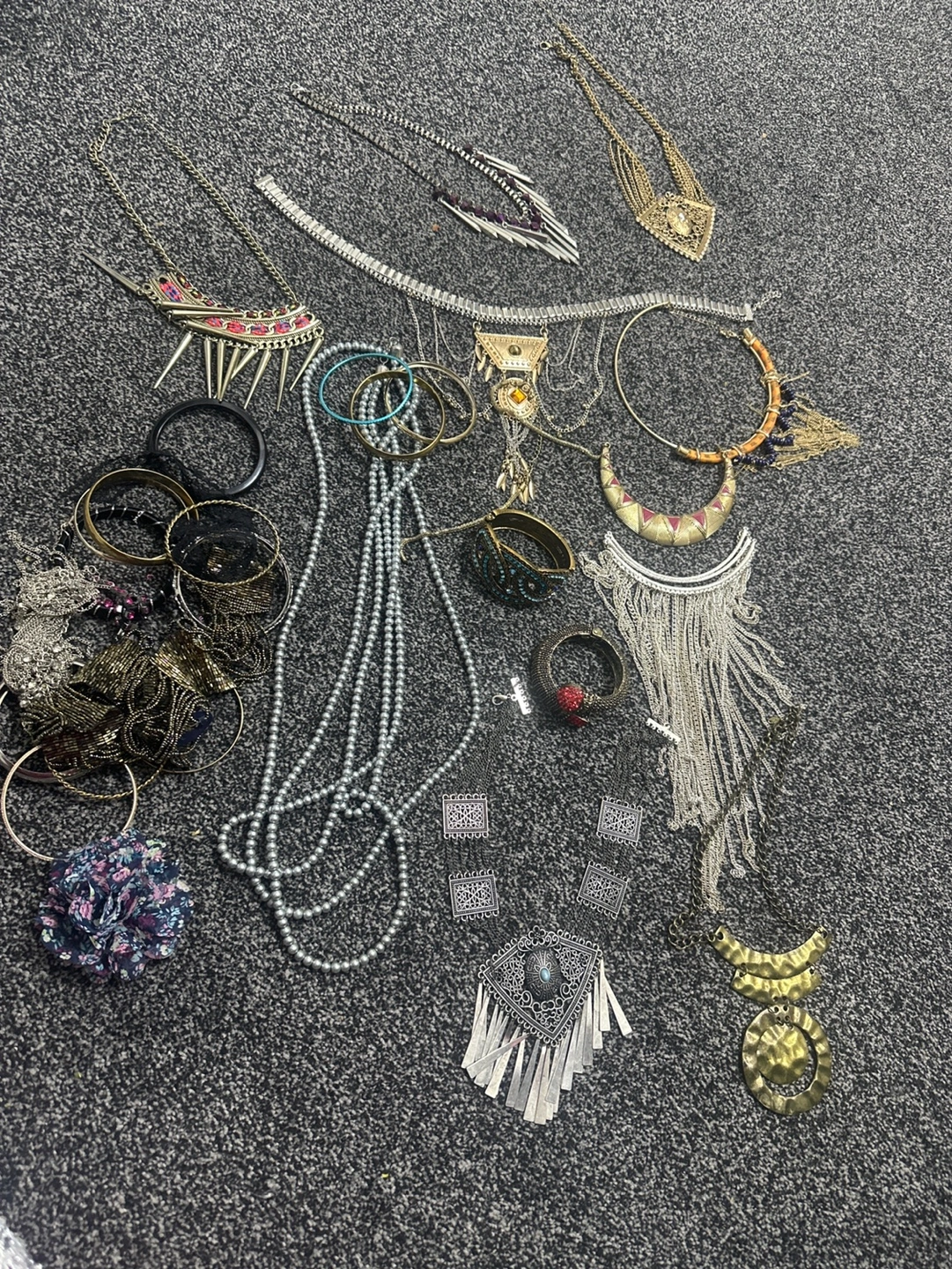 7 reviewsBoho jewellery set. Includes a long silver chain necklace, a silver necklace with a large square pendant, a silver chain necklace with a large triangular pendant, a beaded silver necklace, a long silver chain necklace with a fringed pendant, a gold necklace with a triangular pendant, a gold choker with a beaded fringe, and a silver choker with a fringed pendant. A variety of bracelets and earrings are also included. 3 each or £15 altogether