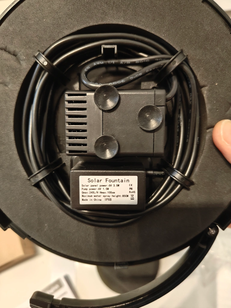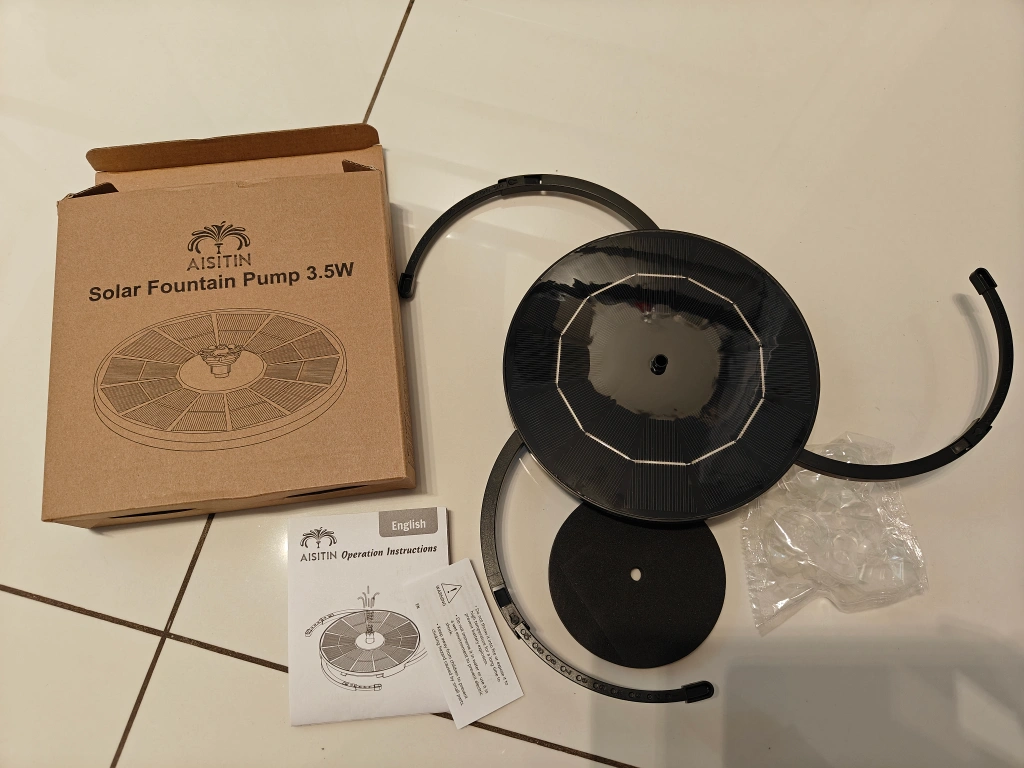 275 reviewsSelling an AISITIN solar fountain pump. It's a 3.5W model and comes with all the bits and bobs you see in the pictures, including the box and operation instructions extpandable strings. 3.5 watts output power is good enough even for coming winter days