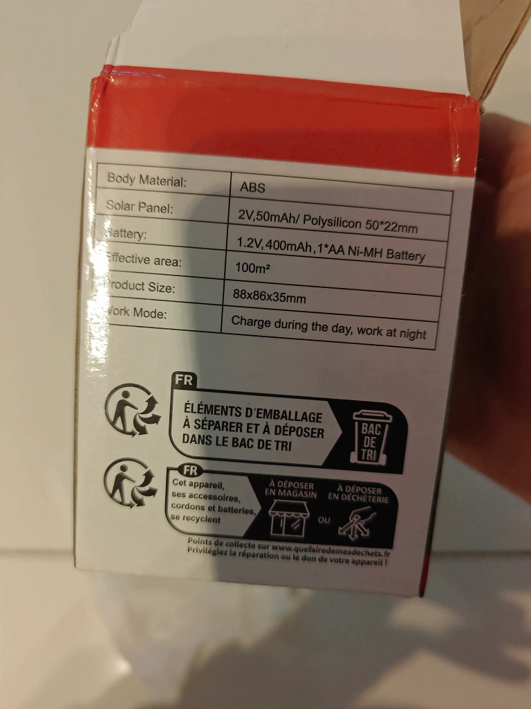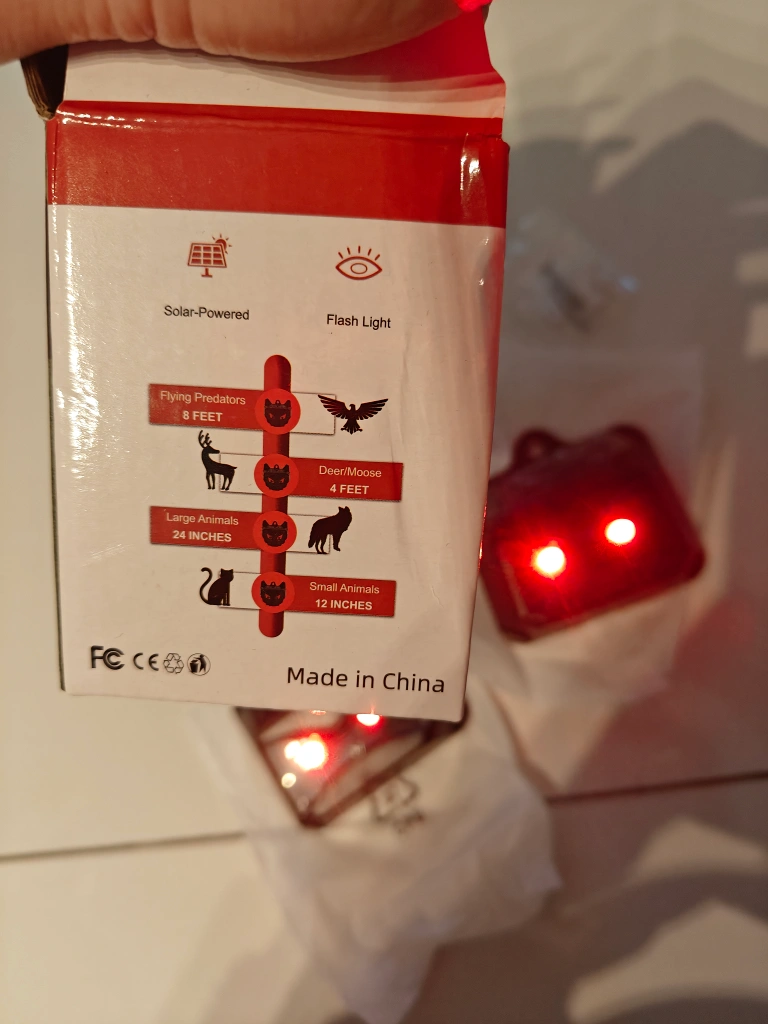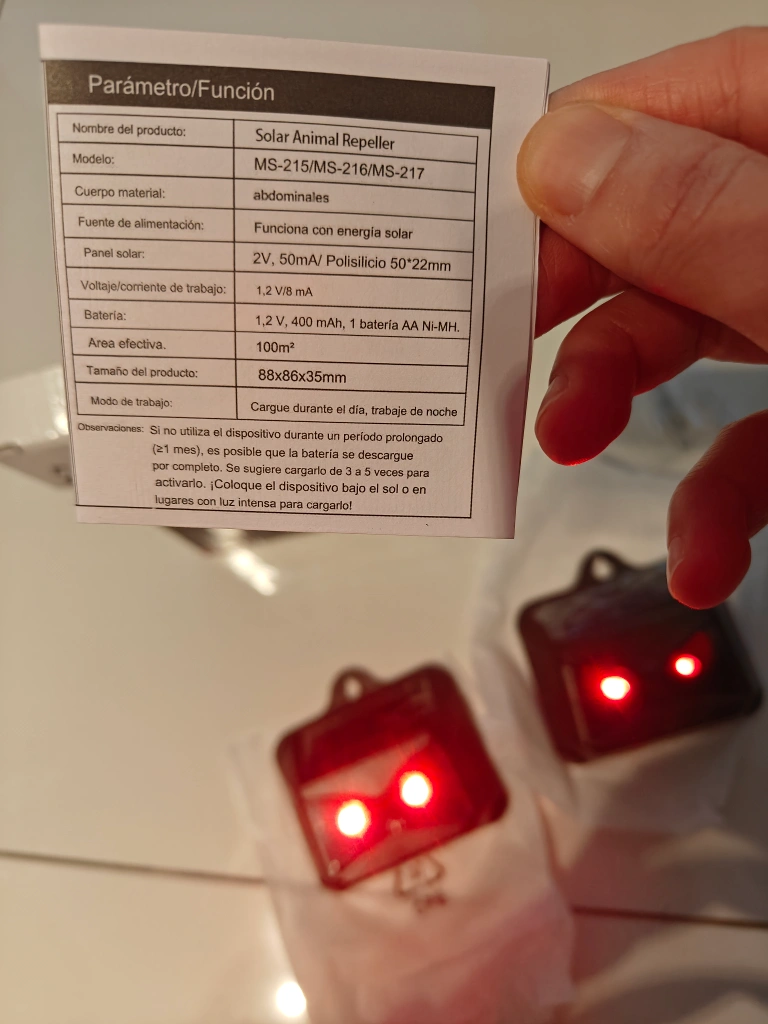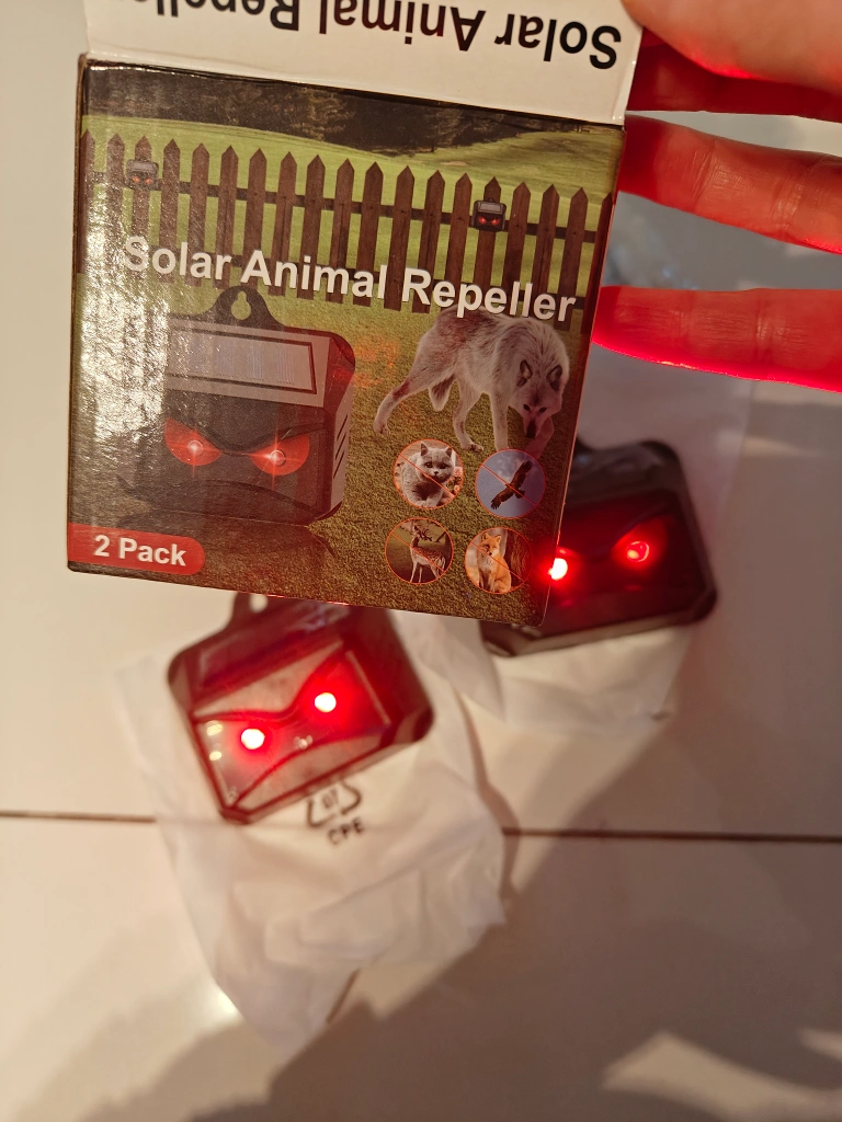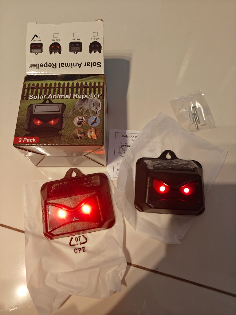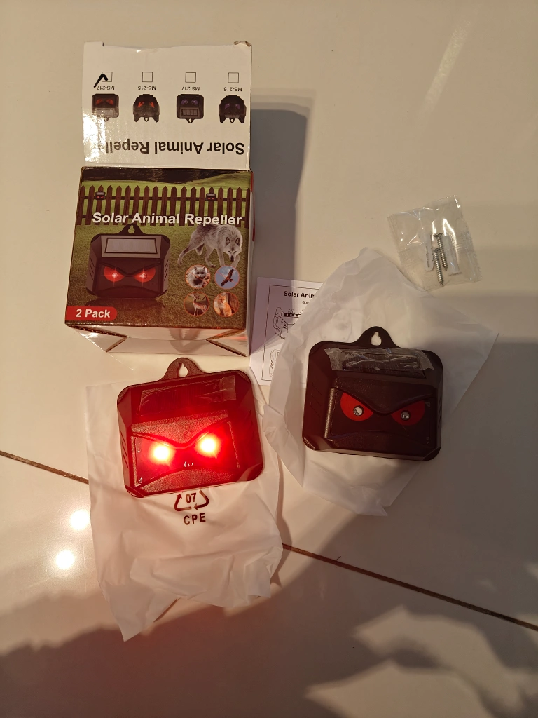 275 reviewsSelling a pack of two solar animal repellers. These are designed to keep unwanted critters out of your garden using solar power and flashing lights. They are new, still in their original packaging. The box includes the repellers and screws. The body material is ABS, and the solar panel is 2V, 50mAh polysilicon. Effective area is 100m². These charge during the day and work at night