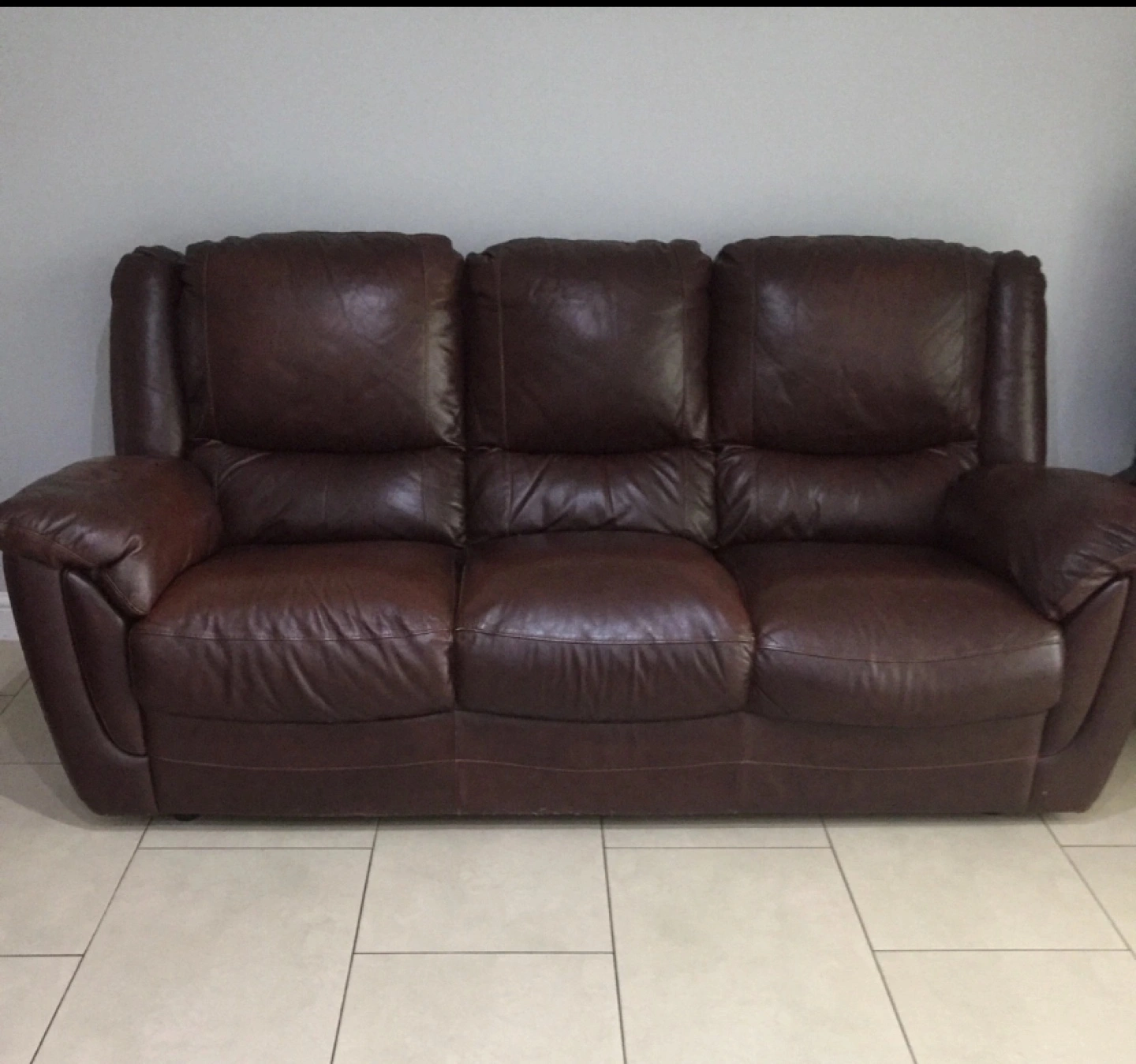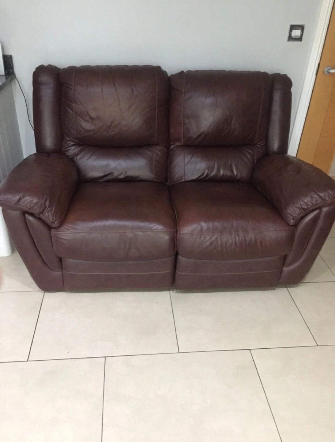 Italian leather three seater sofa and a two seater reclining sofa. Looks okay.