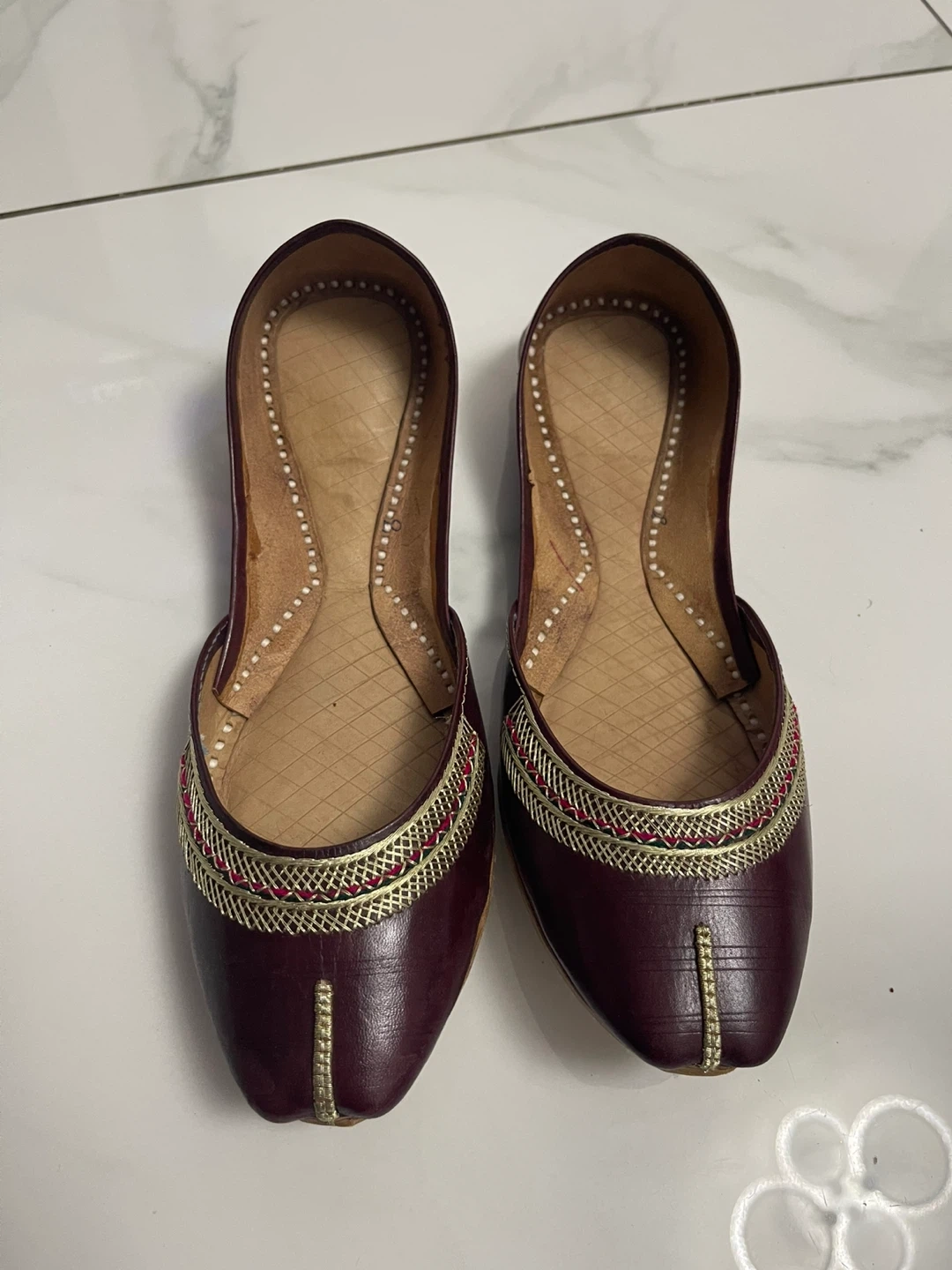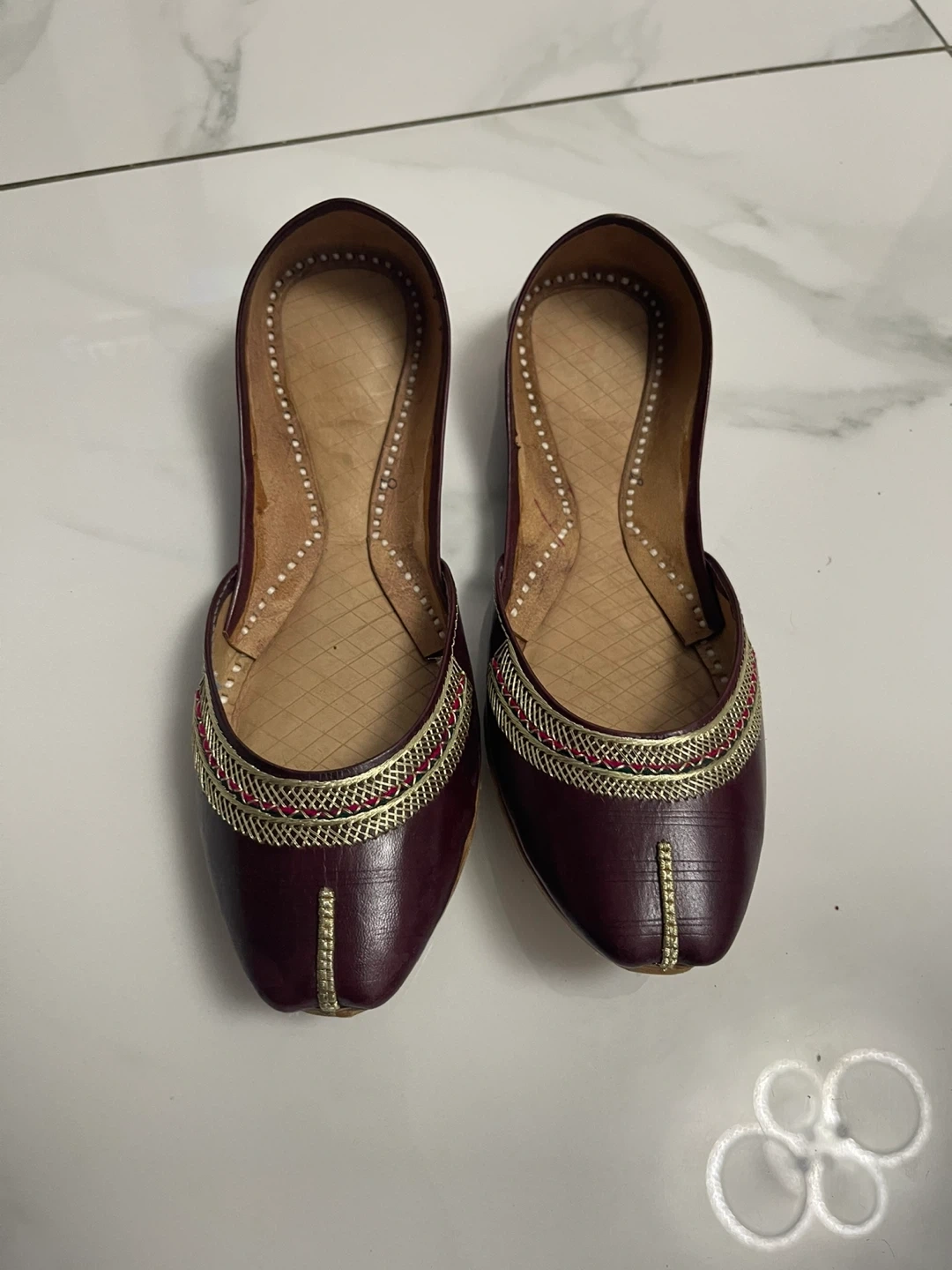 0 reviewsHere are a pair of burgundy leather juttis shoes. They feature intricate detailing around the edges, adding a touch of elegance. These shoes are perfect for adding a unique flair to your outfit.