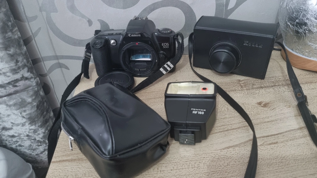 24 reviewsUNTESTED! Selling a Canon EOS 500 camera along with a Kodak Instamatic 33. Both cameras are in good condition and come with their respective cases. Also included is a Pentax AF160 flash. UNTESTED.
