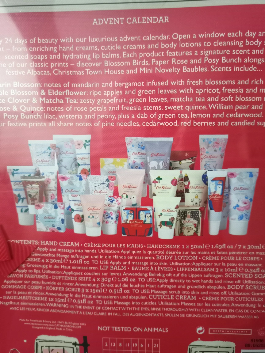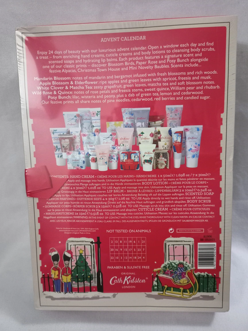 Enjoy 24 days of beauty with our luxurious advent calendar. Open a window each day and find a treat - from enriching hand cream, cuticle cream and body lotions to cleansing body scrubs, scented soaps and hydrating lip balms. Each product features a signature scent and one of our classic prints - discover Blossom Birds, Paper Rose and Posy Bunch alongside festive Alpacas, Christmas Town House and Mini Novelty Baubles. Scents include... Mandarin Blossom: notes of mandarin and bergamot infused with fresh blossoms and rich woods. Apple Blossom & Elderflower: ripe apples and green leaves, sweet quince, soft pear and white Clover & Matcha Tea: zesty grapefruit, green stems, matcha tea and William pear. Posy Bunch: lilac, wisteria and peony, plus a dab of green tea, lemon and cedarwood. Our festive prints all share notes of pine needles, cedarwood, red berries and candied sugar.