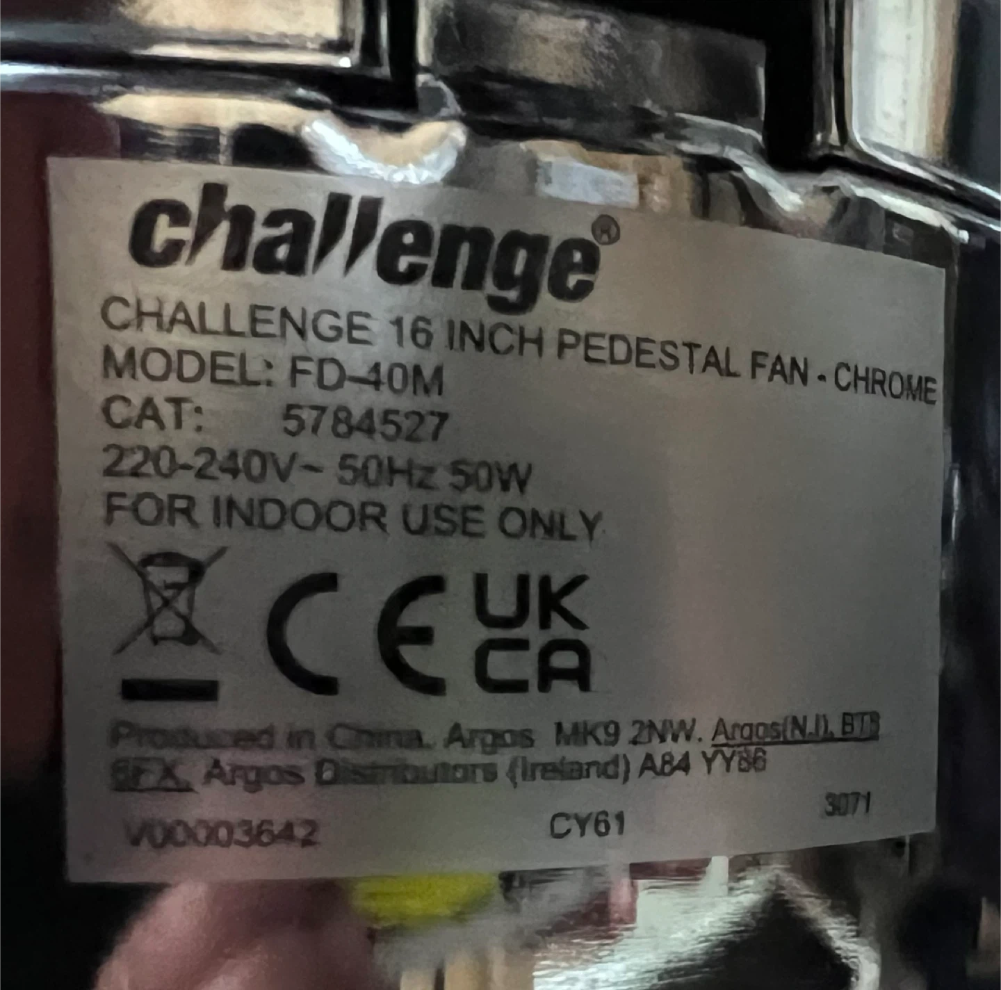 13 reviewsHere's a Challenge 16 inch pedestal fan in chrome. The model number is FD-40M. It's for indoor use only. 16 Inch Challenge Metal Pedestal Fan Chrome Used and good working Collection from b12