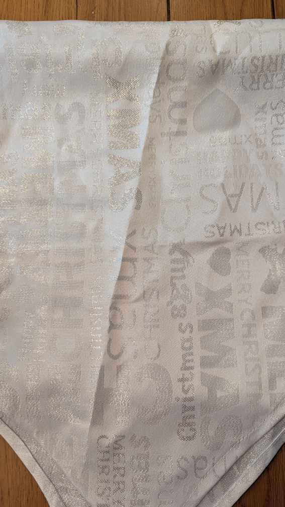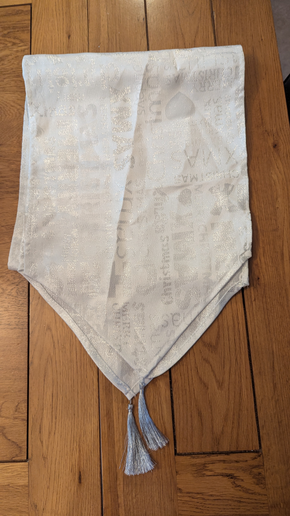 13 reviewsWhite & sparkly silver table runner with silver glitter finish and tassels. Christmas wording, looks brand new, hardly used £5, more things on my profile, Yardley bham