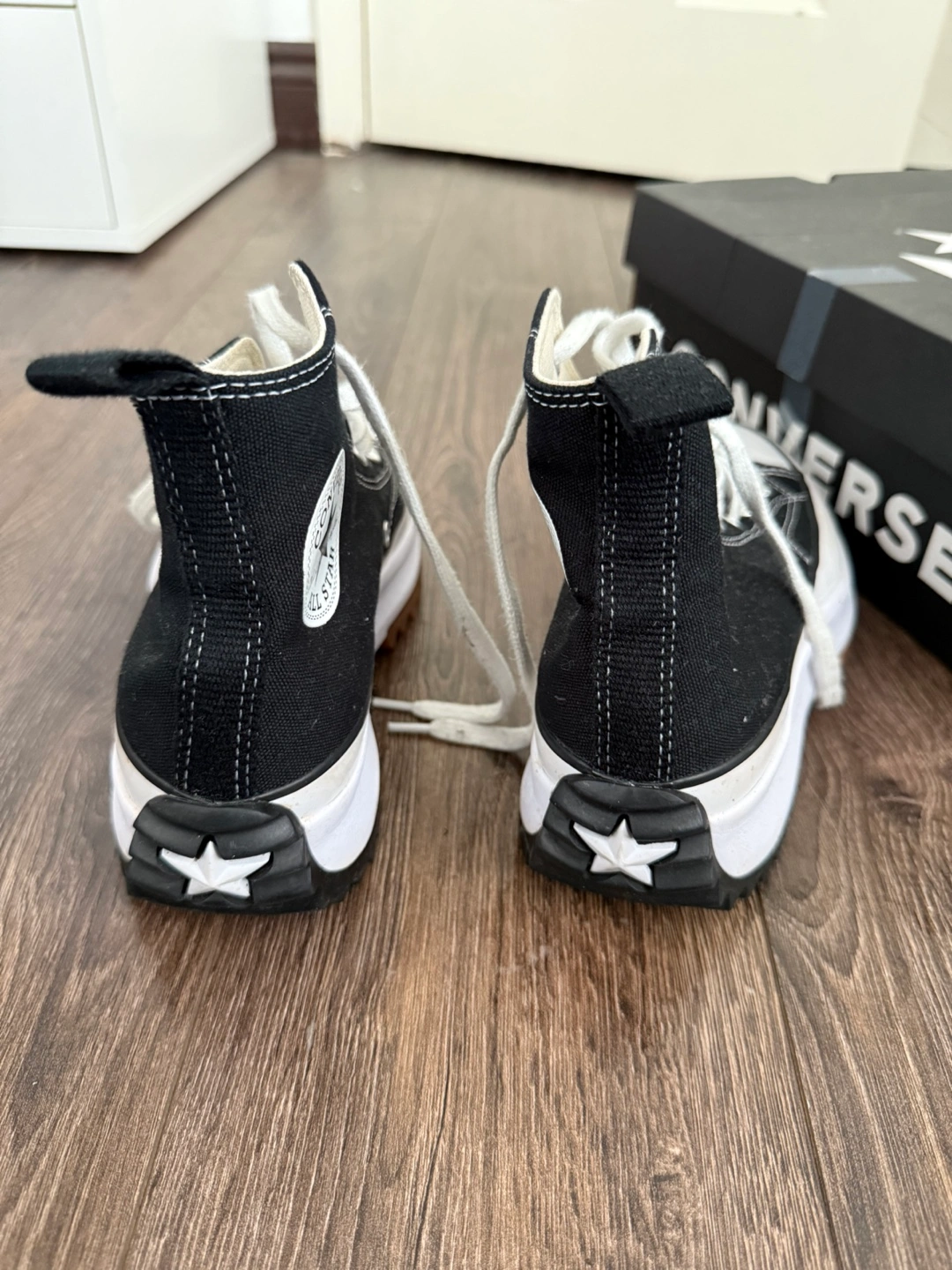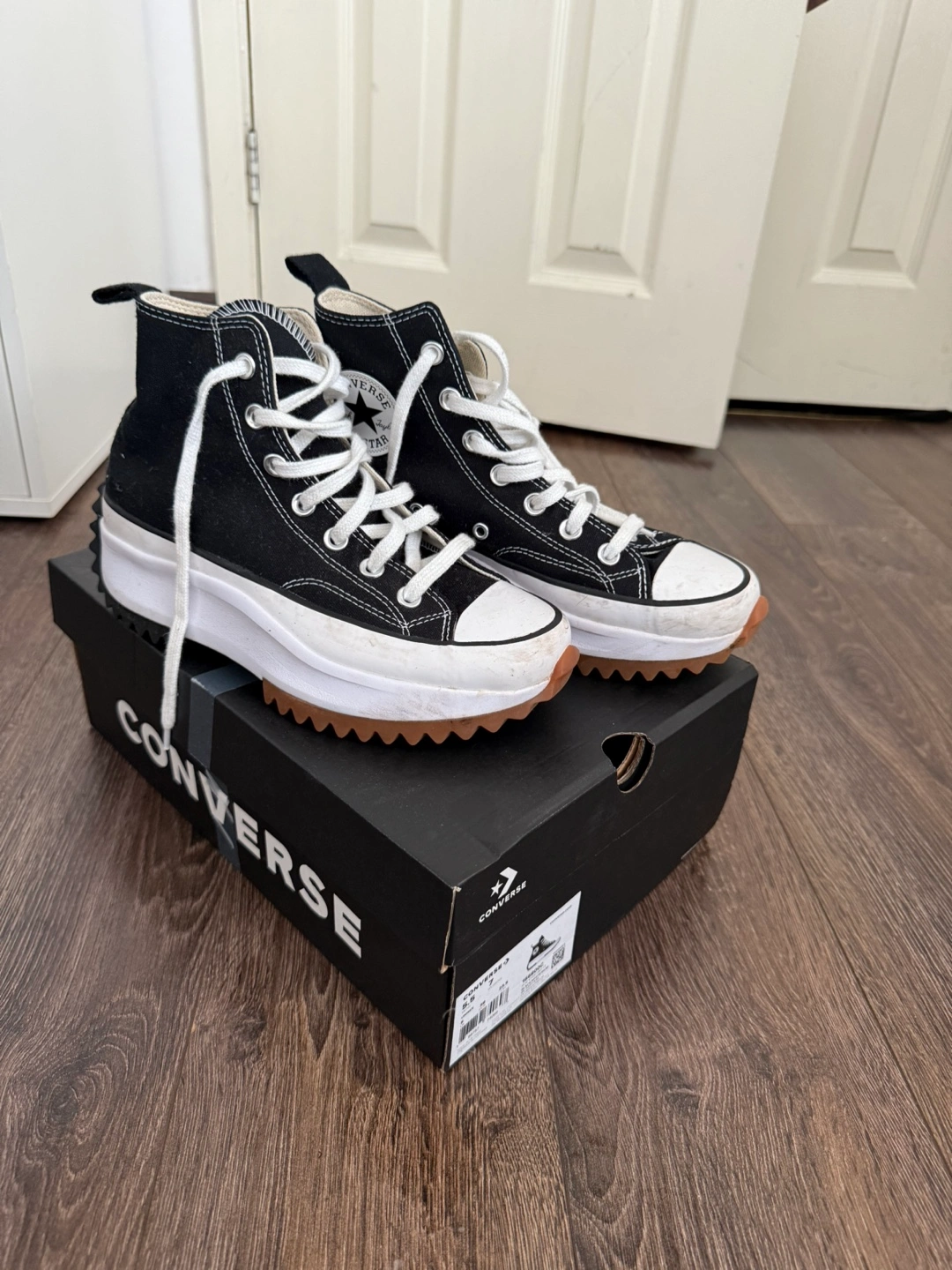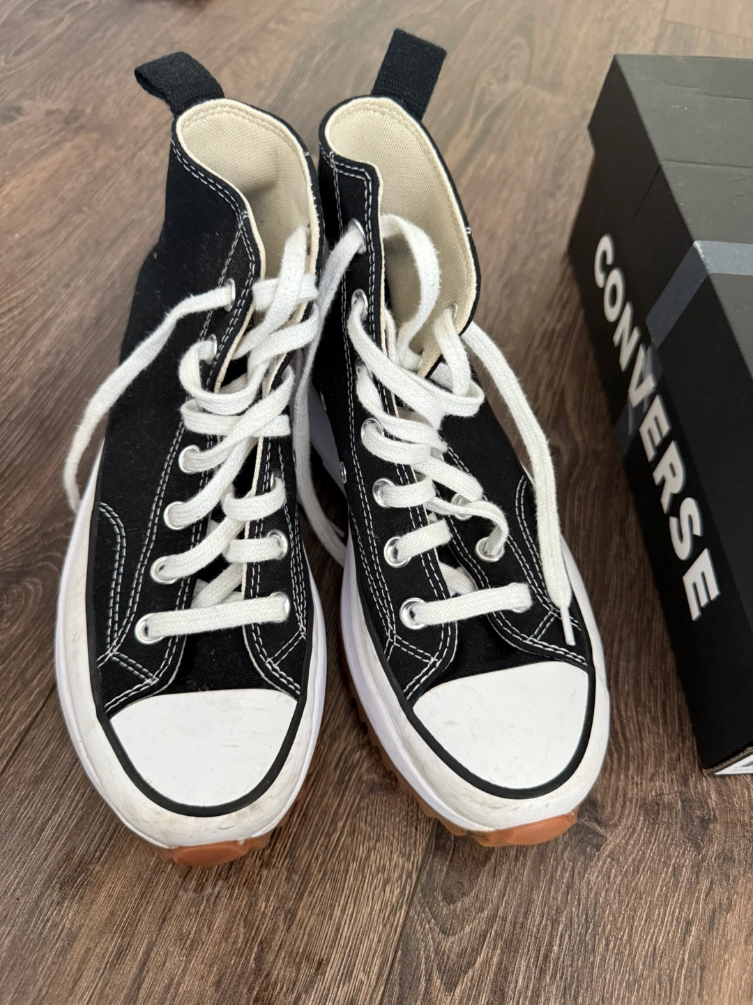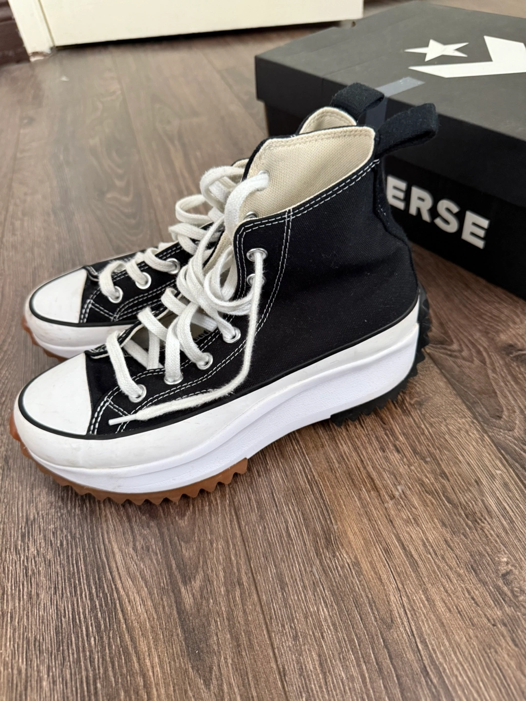 23 reviewsBlack high-top trainers with white laces. They have a white platform sole with a brown outsole and a star on the heel. The trainers come with the original box. Size 5 good used condition
