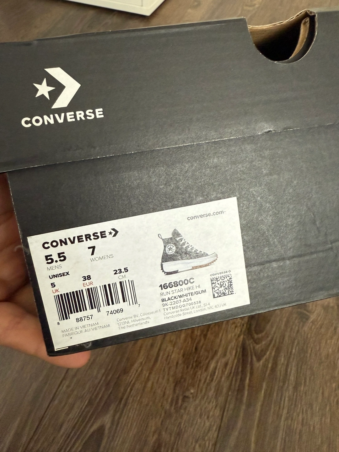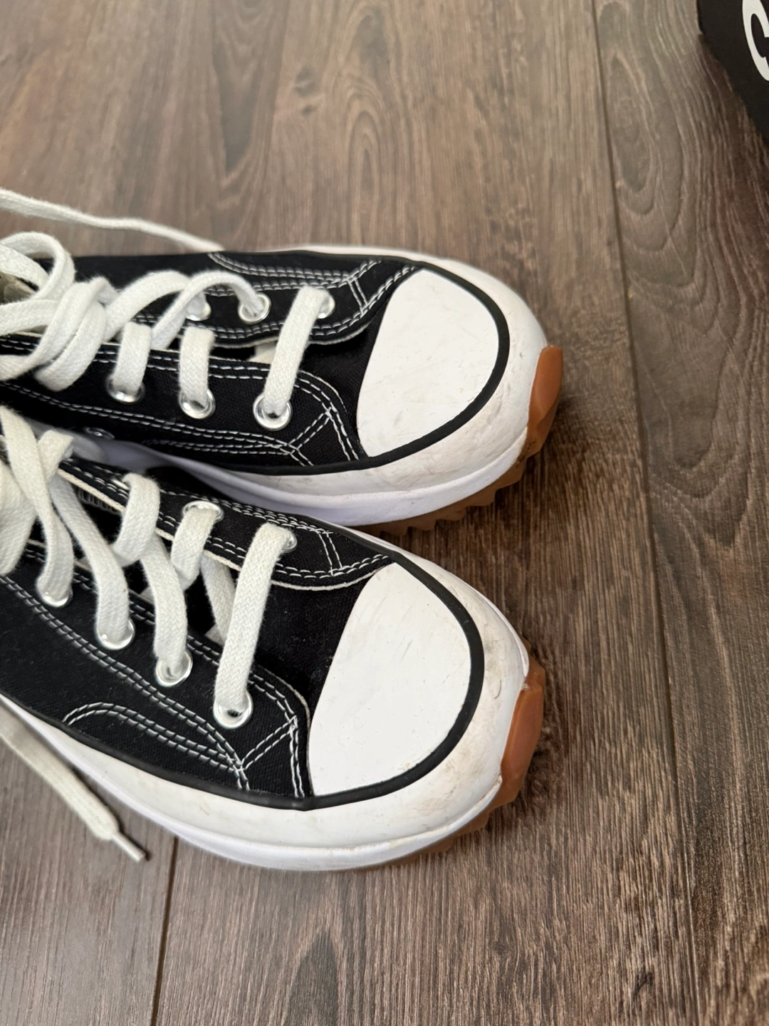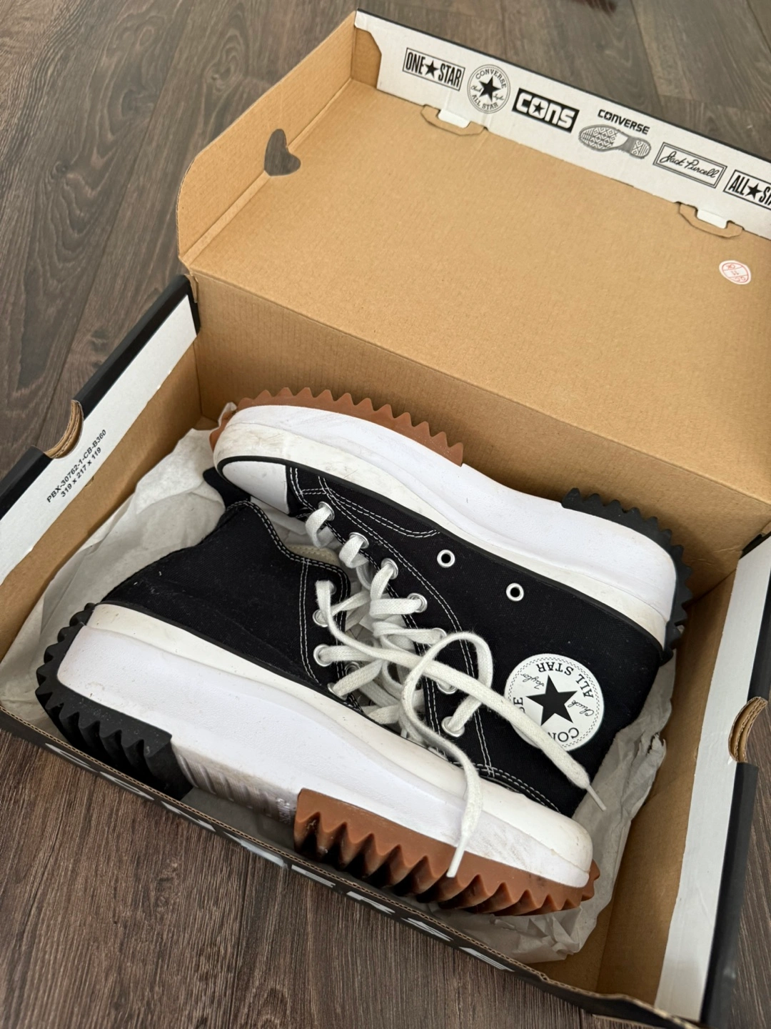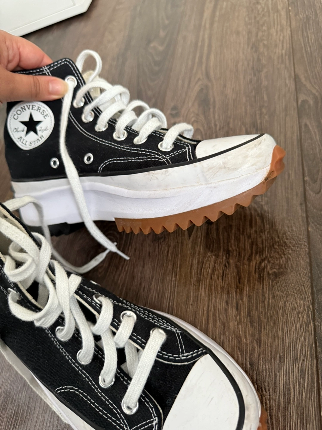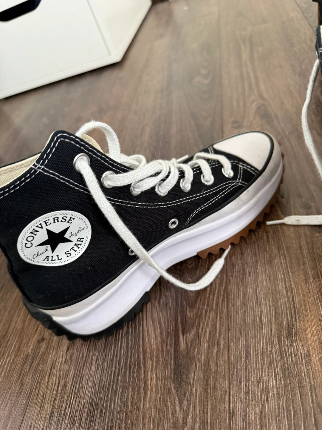 23 reviewsBlack high-top trainers with white laces. They have a white platform sole with a brown outsole and a star on the heel. The trainers come with the original box. Size 5 good used condition