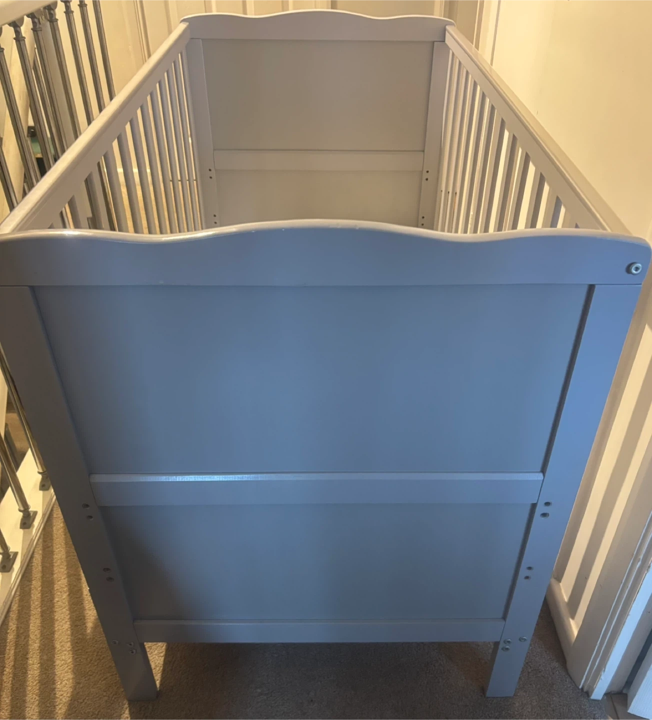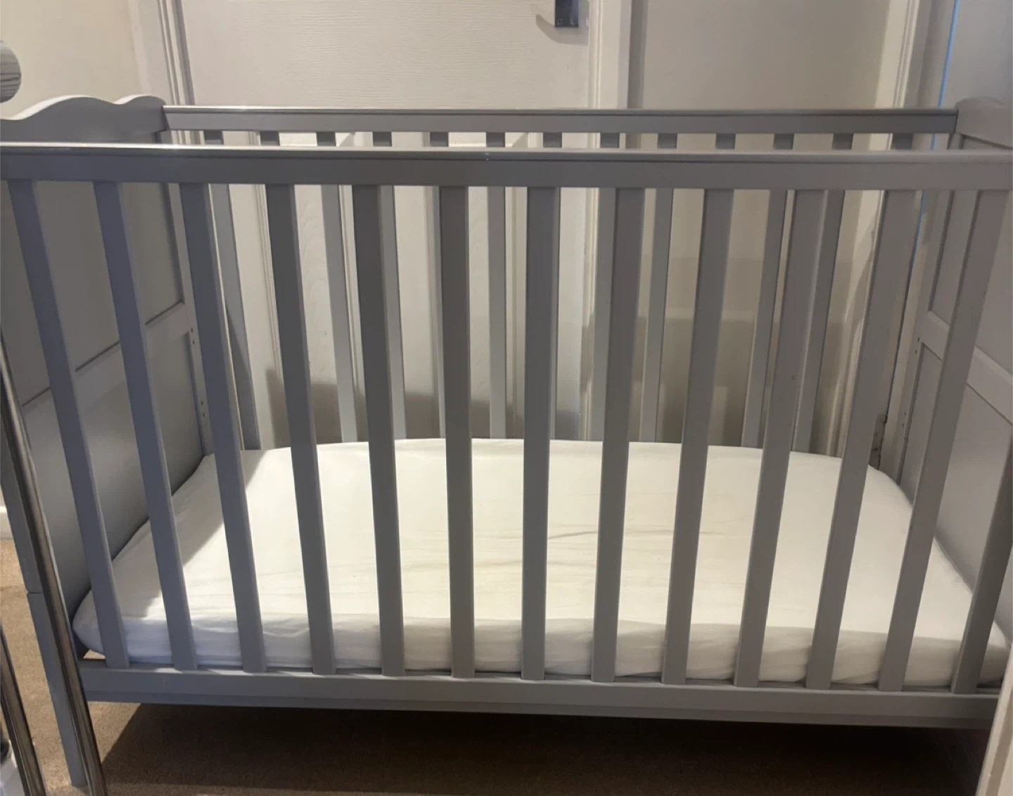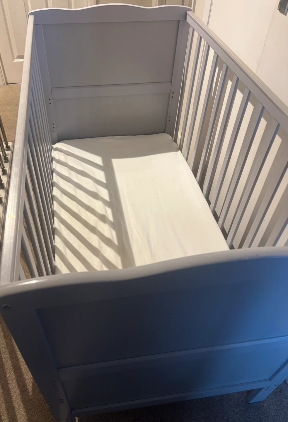 2 reviewsSelling a Mack + Milo Escondido Cot with Mattress in grey. Overall dimensions are 80cm H x 124cm W x 64cm L. It's made from solid and manufactured wood. Originally bought for £156.99 Bargain £50 . Collection Only. Changing Station also available.