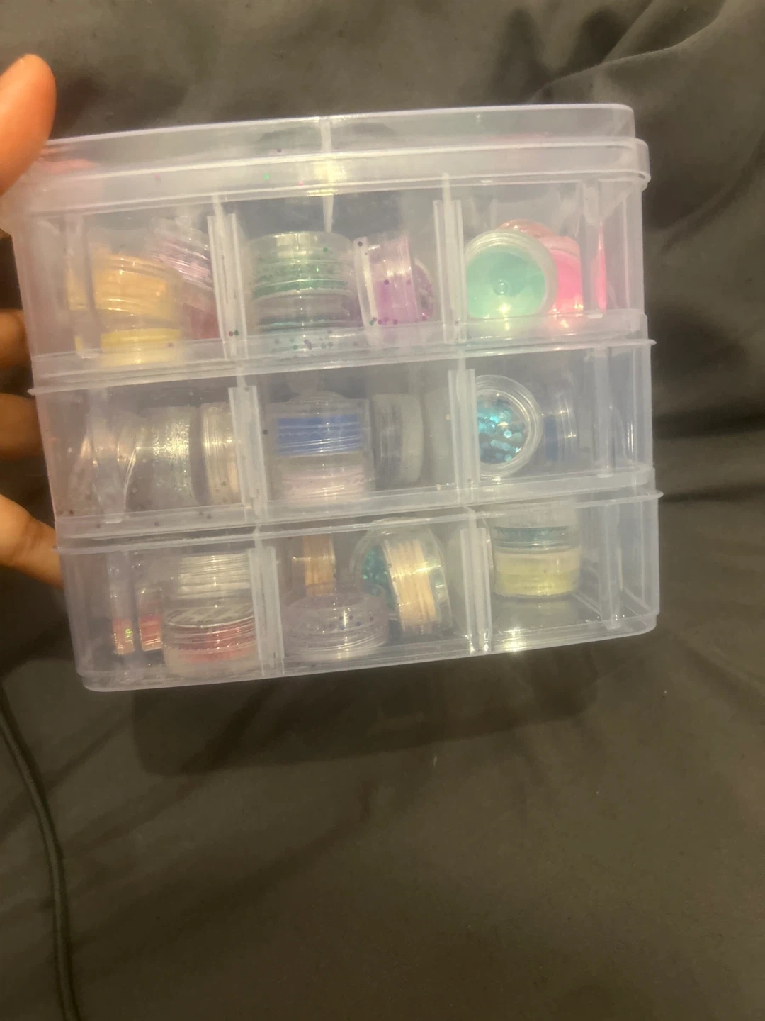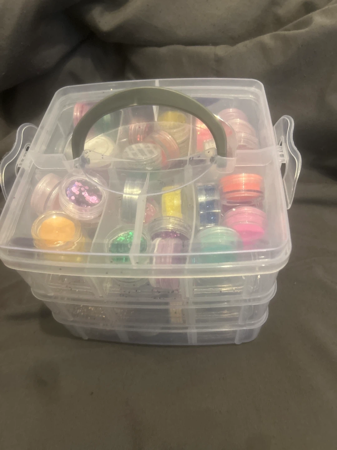 0 reviewsSelling a craft glitter set. It comes in a clear plastic storage container with multiple compartments. Each compartment holds a small jar of glitter in various colours. Perfect for all your crafting needs