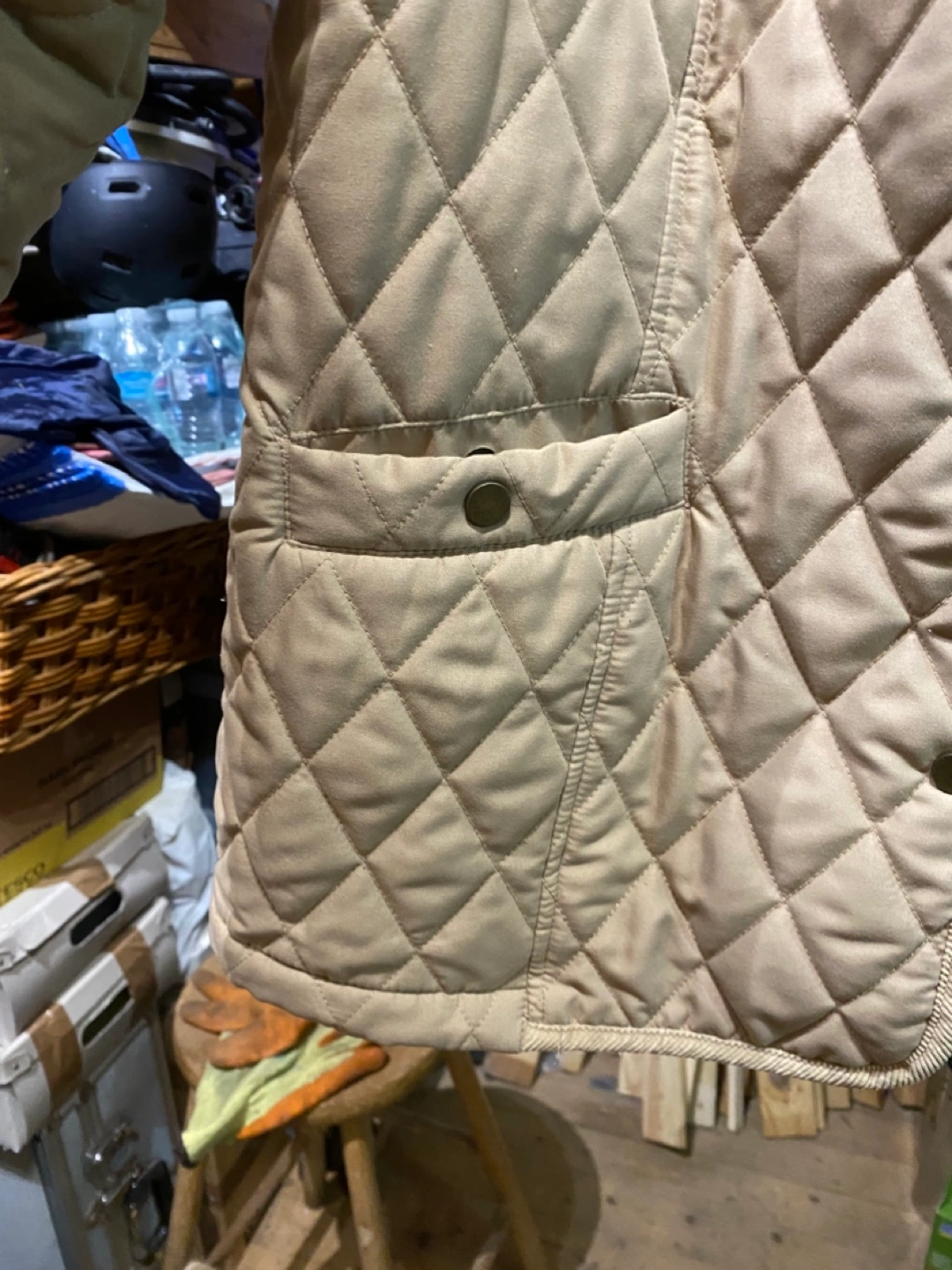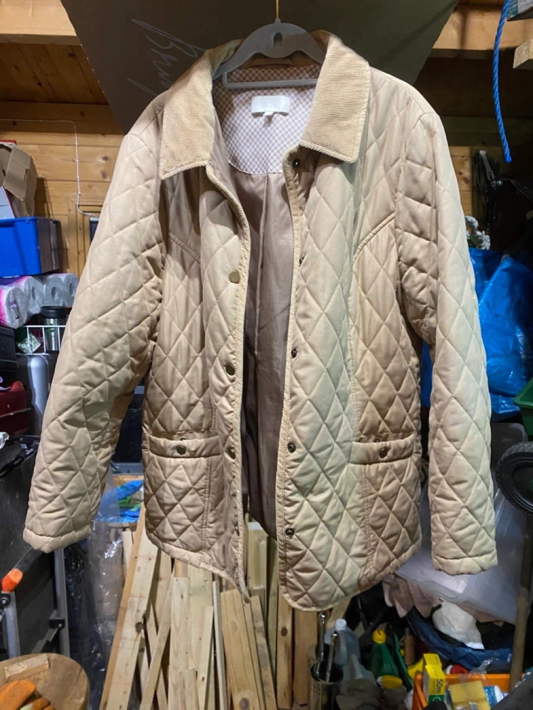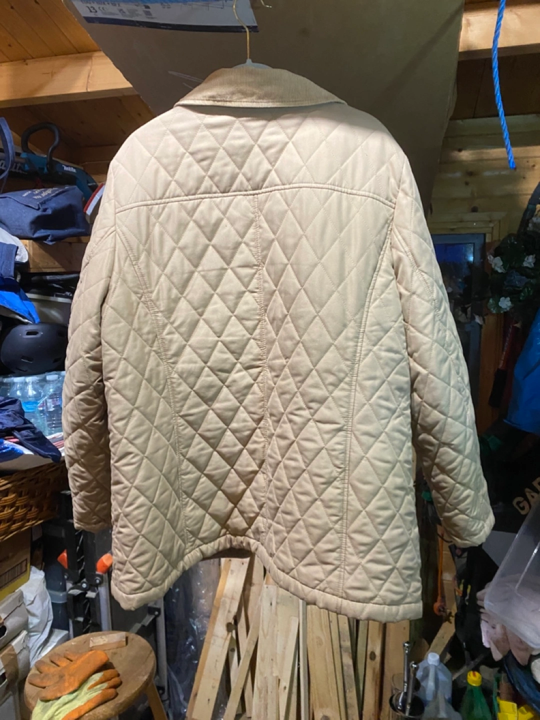 1 reviewCream quilted jacket with corduroy collar and pockets. Button fastening.