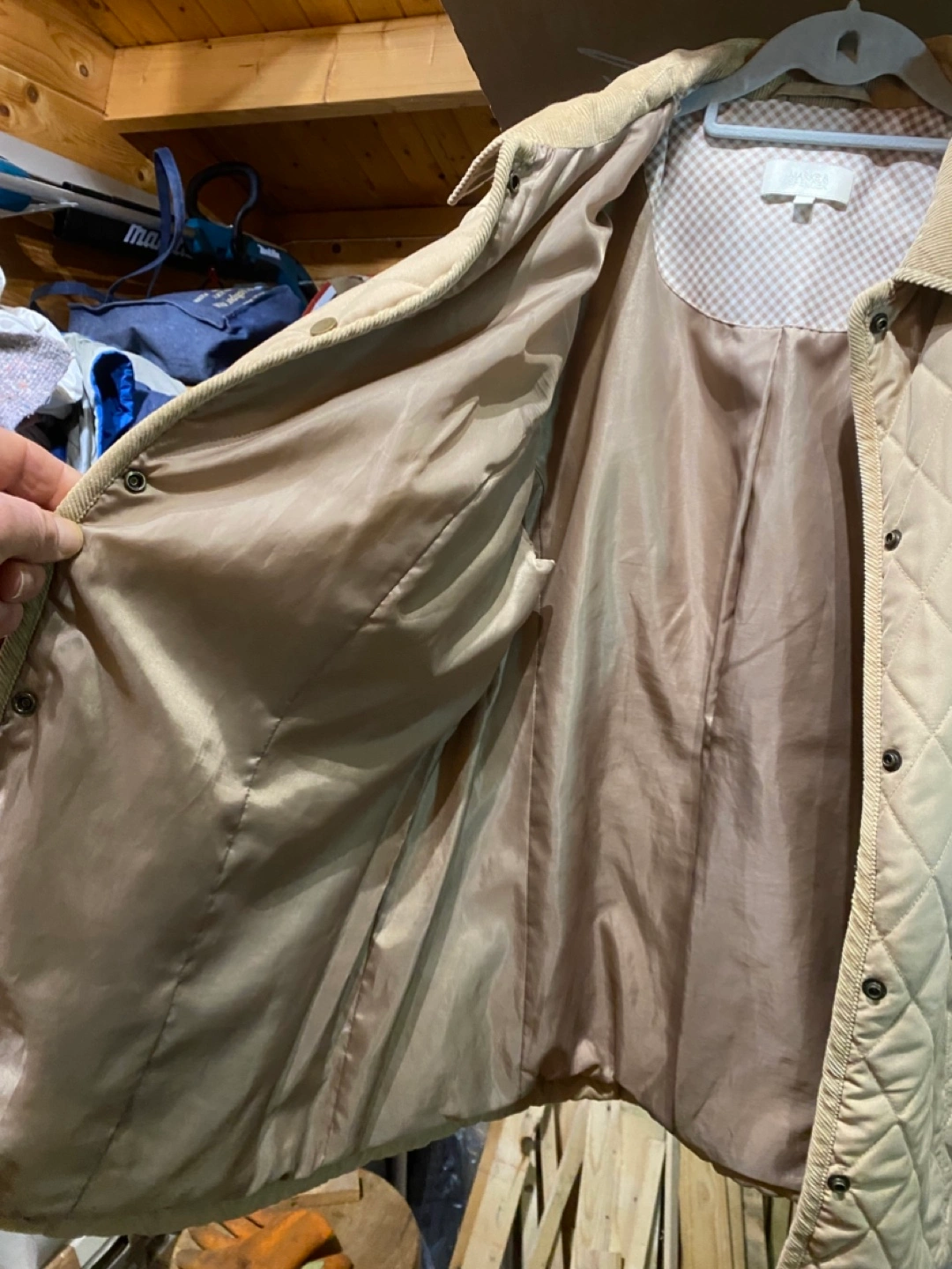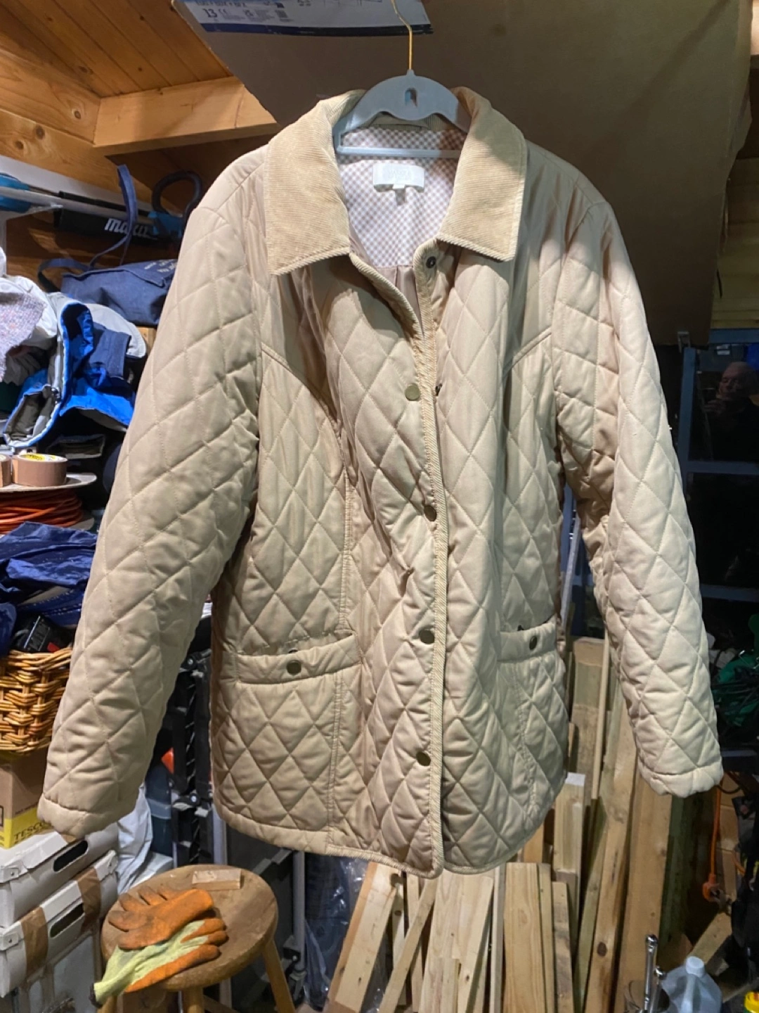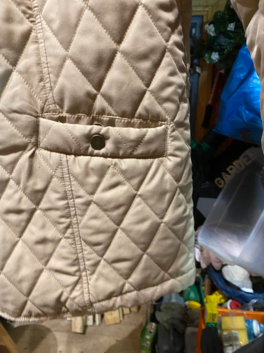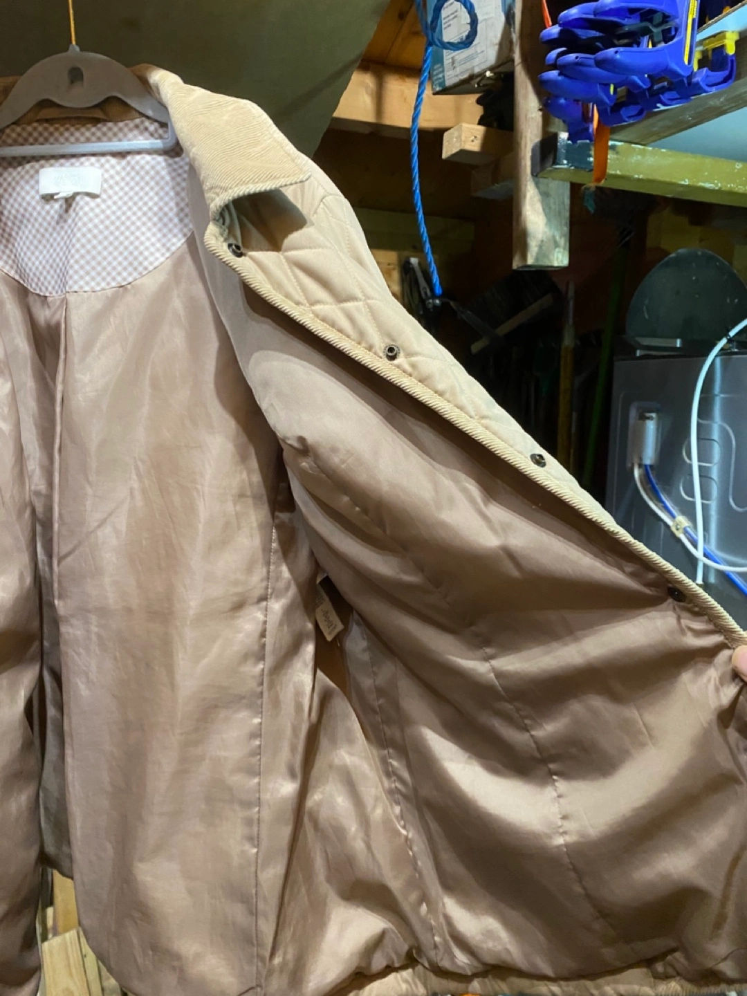 1 reviewCream quilted jacket with corduroy collar and pockets. Button fastening.