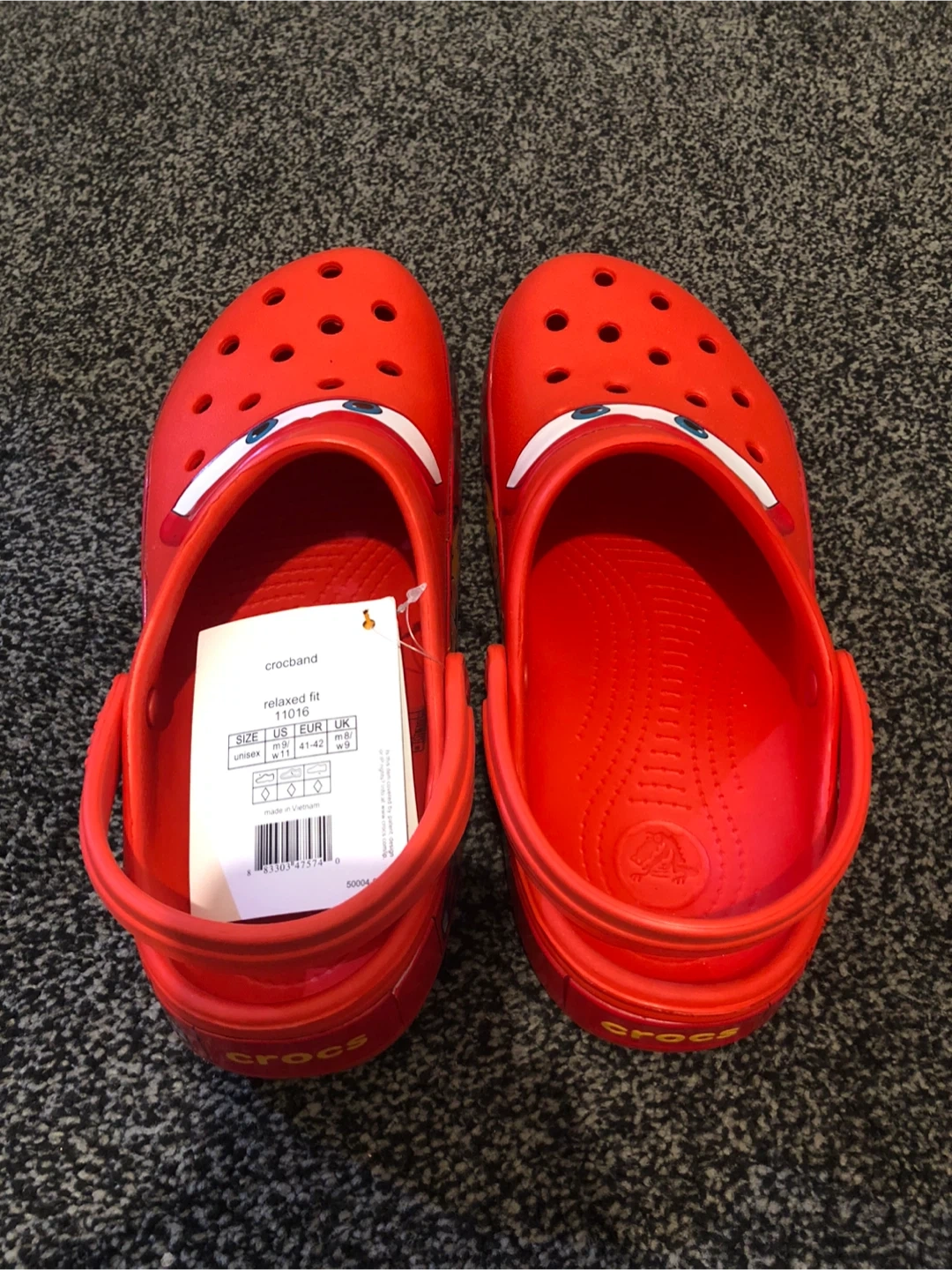 0 reviewsHave a pair of bright red Crocs featuring Lightning McQueen from 'Cars'! They're in great condition. But we don’t have size 10 for men we have all other sizes.