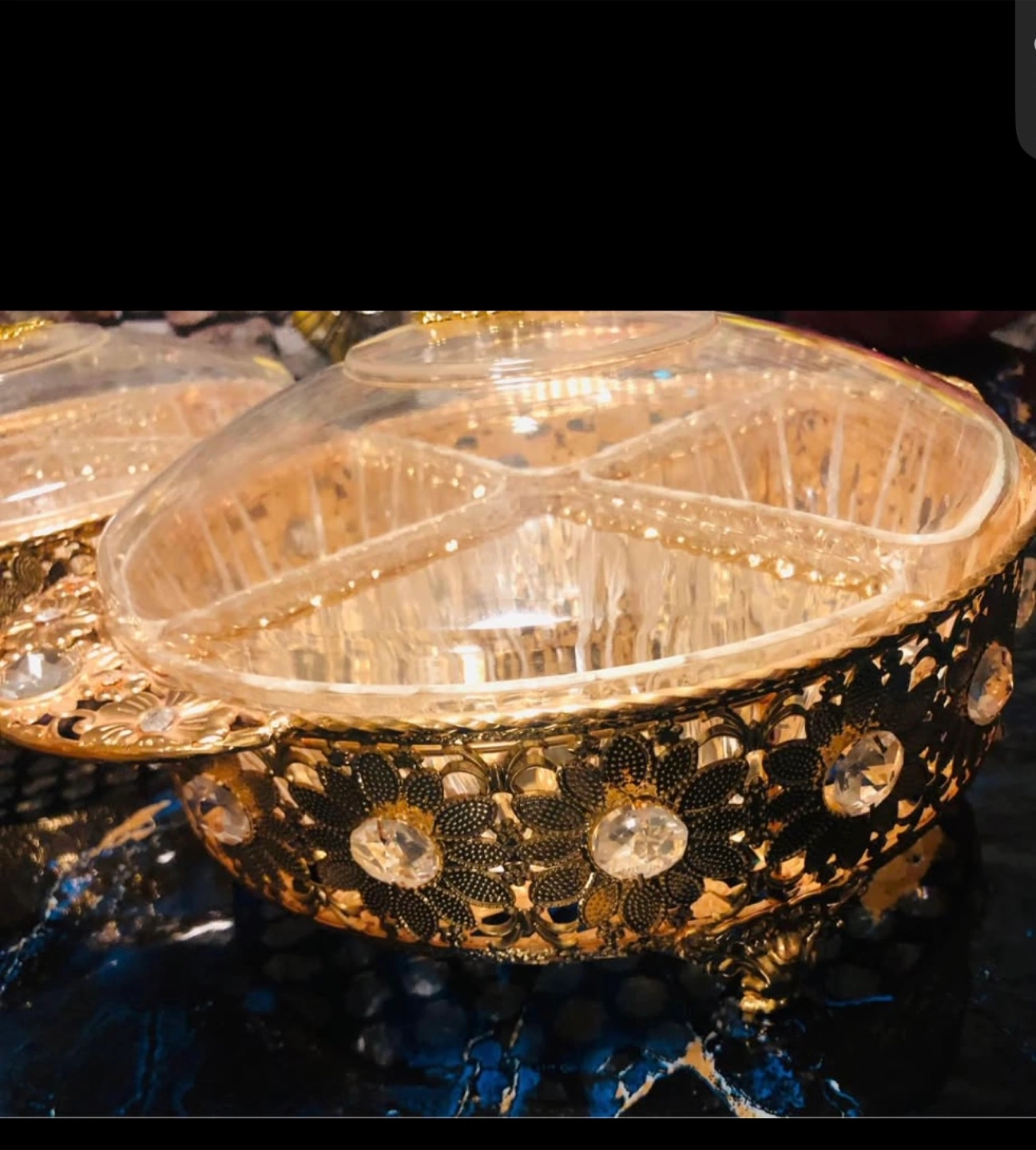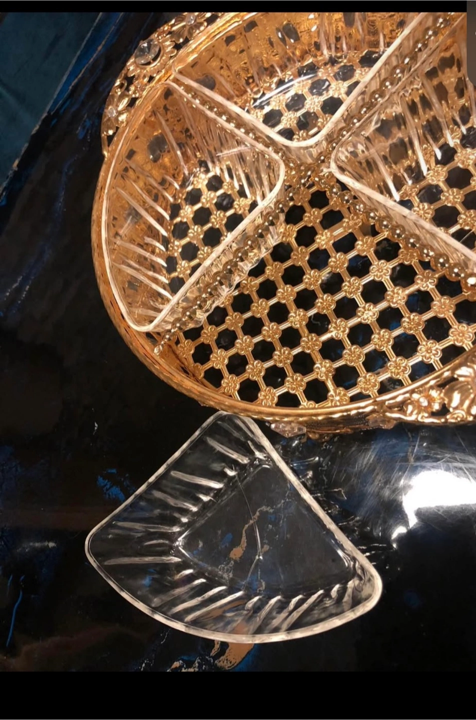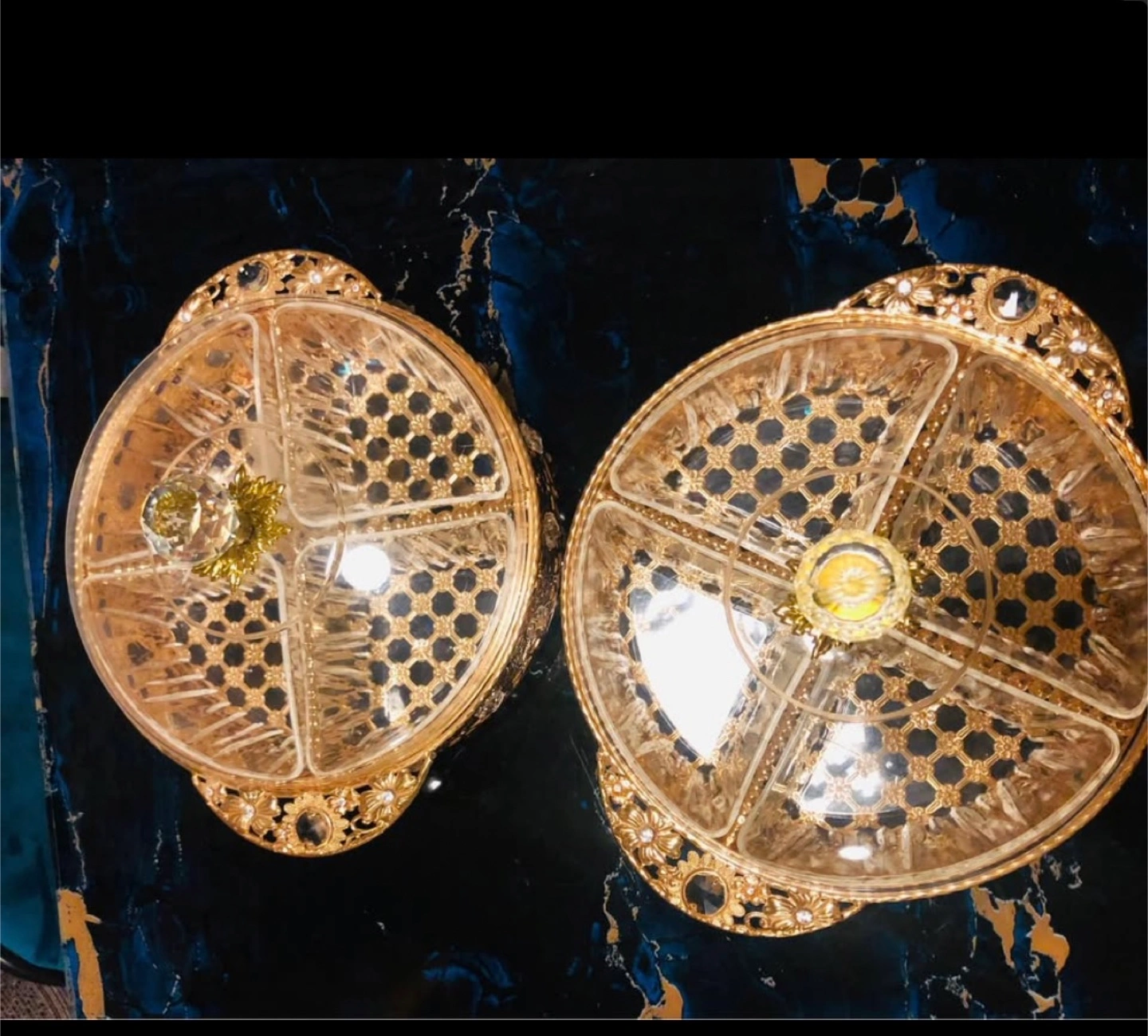 3 reviewsSelling a pair of lovely decorative gold serving dishes. Perfect for presenting snacks or treats in style. They have a beautiful ornate design and are in good condition.