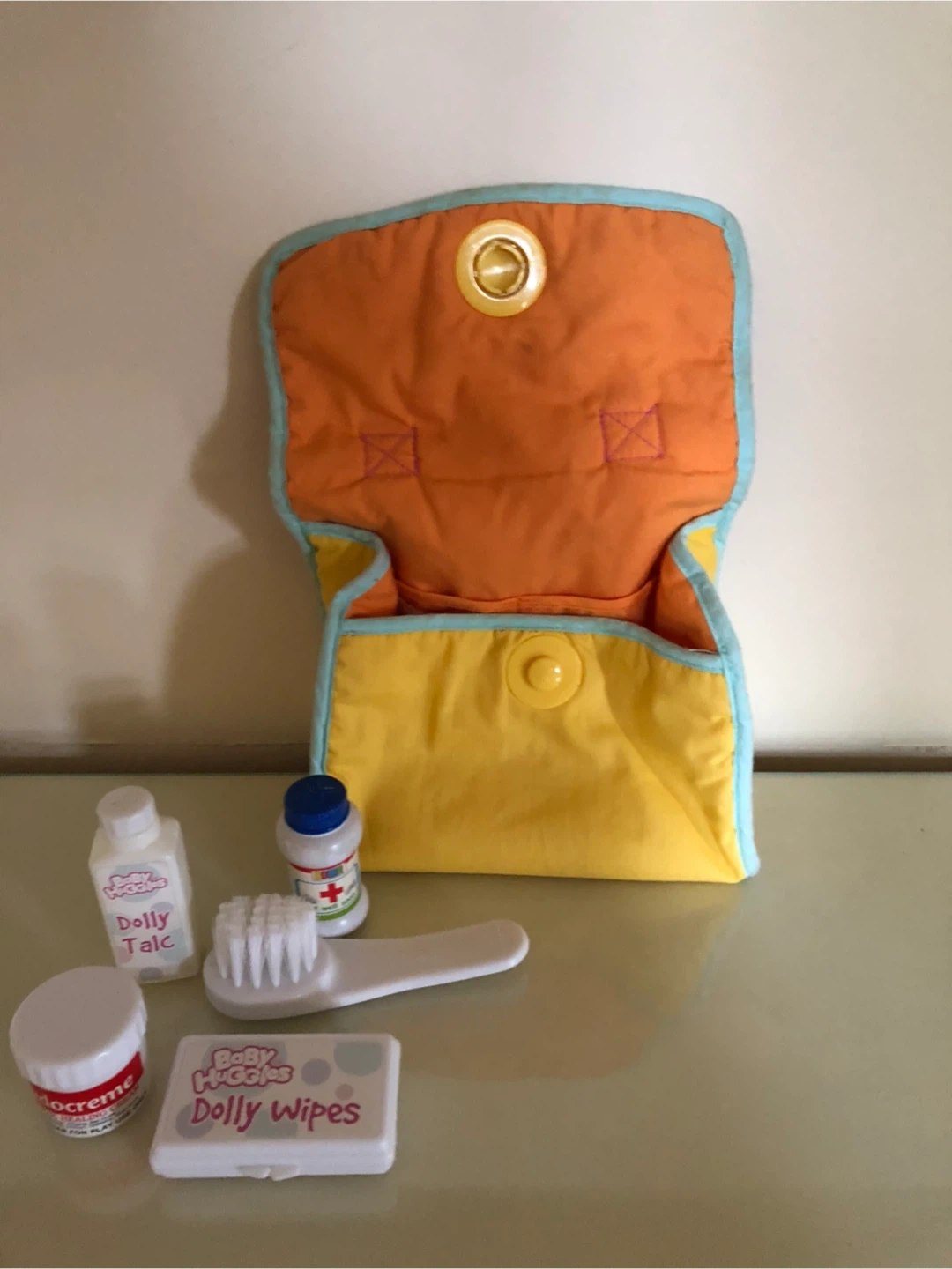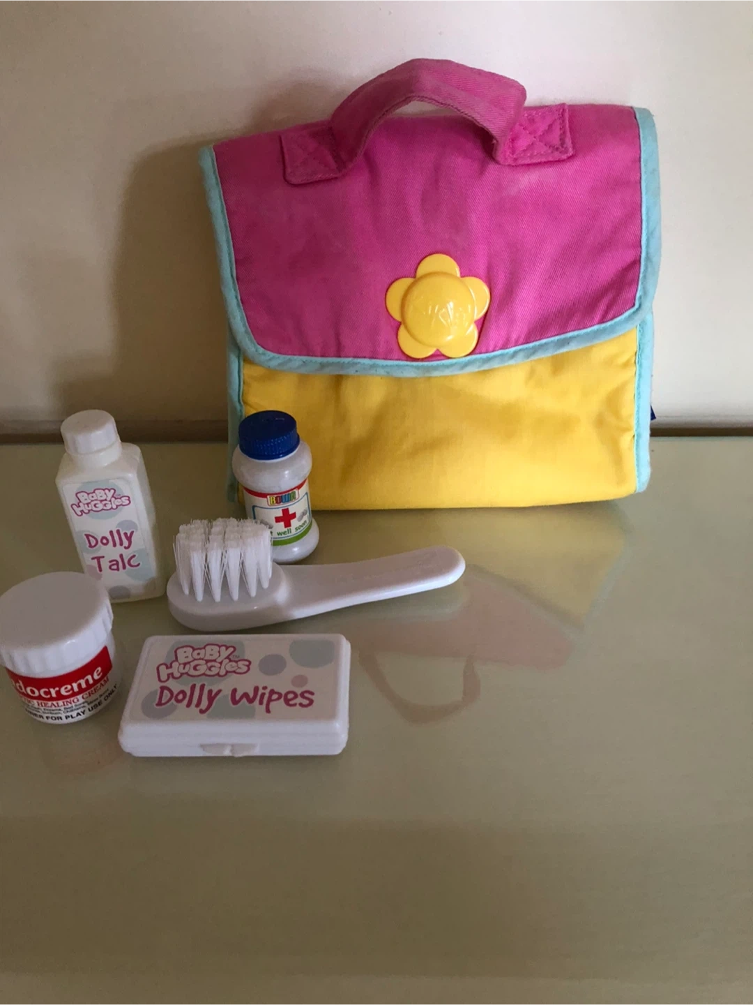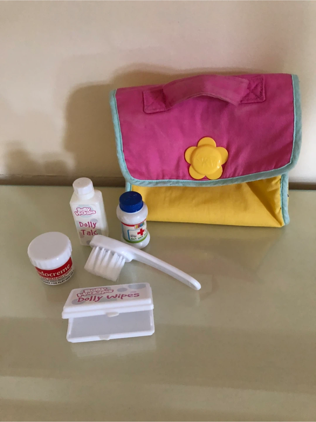 11 reviewsA cute Dolly Bag with accessories. Includes a bag, bottle, bowl, spoon, dolly wipes, talc, cream and brush