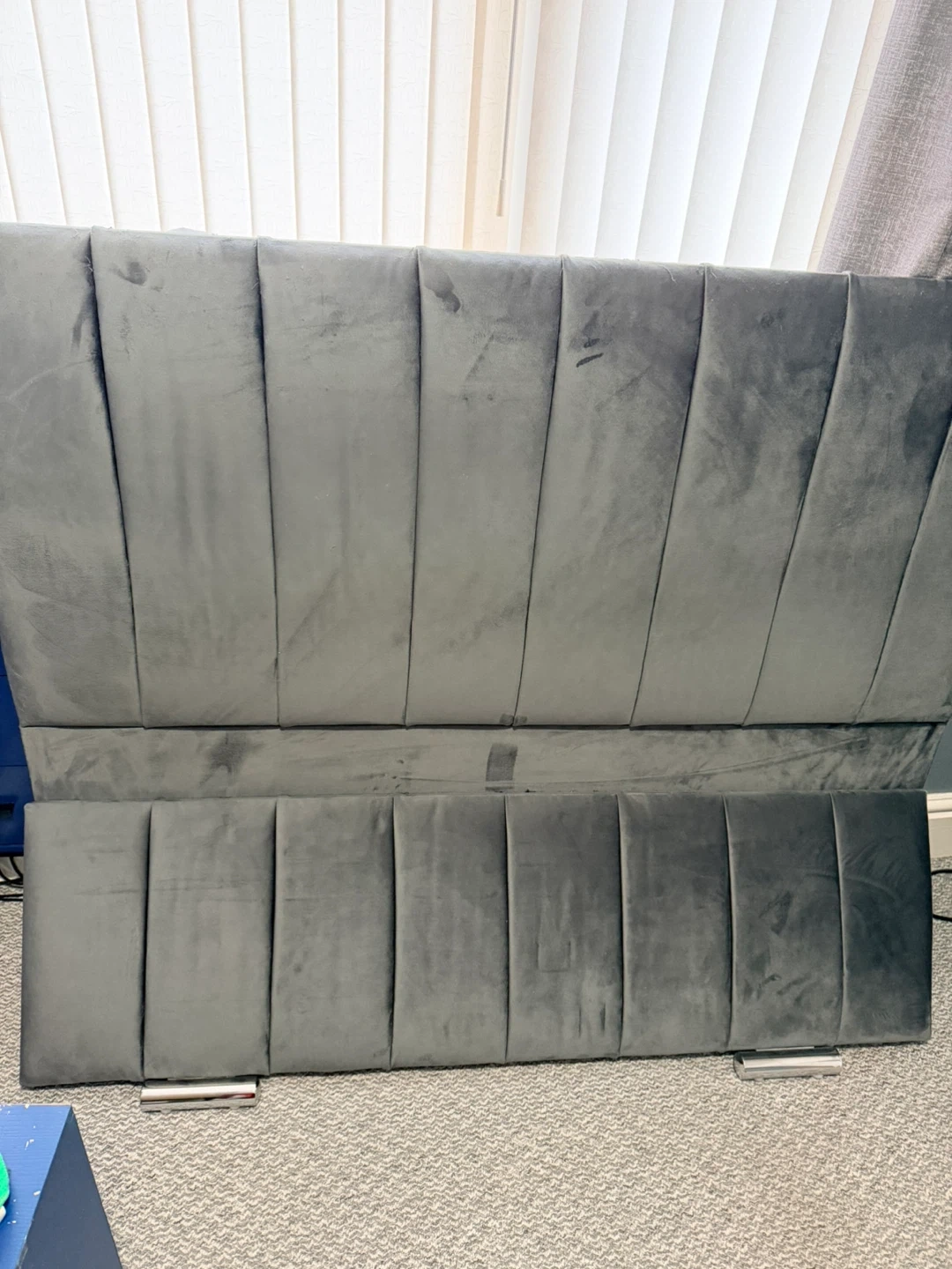 40 reviewsGrey plush double bed frame Less than 12 months old excellent condition minus one beam has snapped. Please see pic Have duct taped so can be used but however will need to be replaced Needs to go asap no transport available so it’s collection only fully dismantled ready to go
