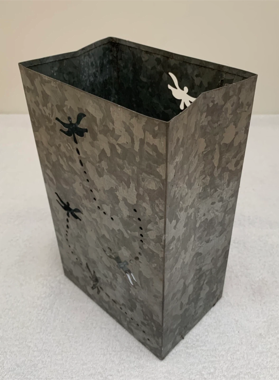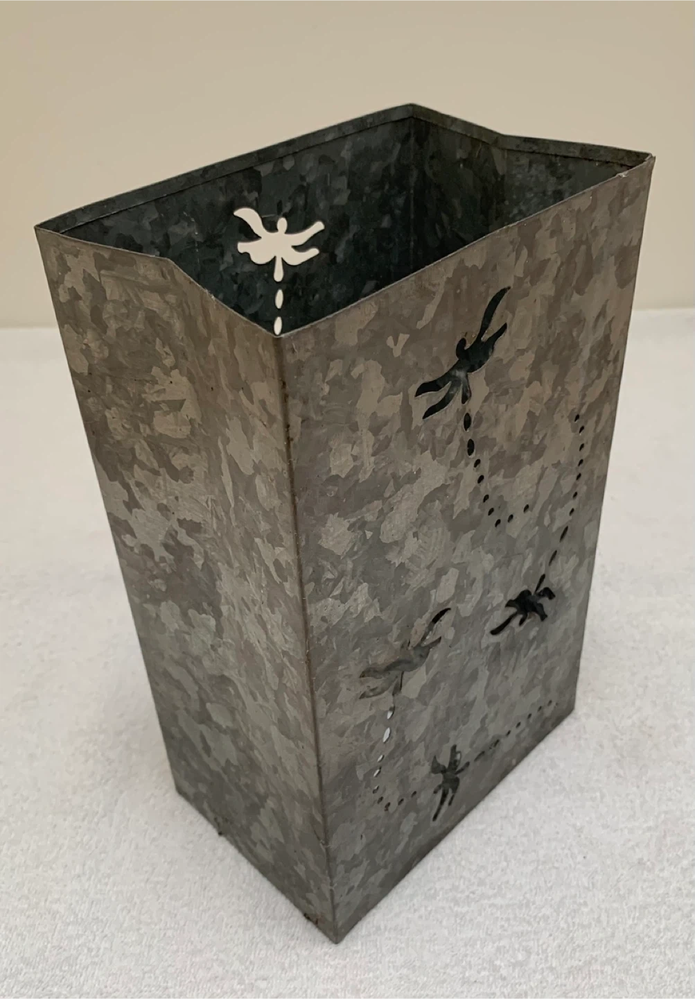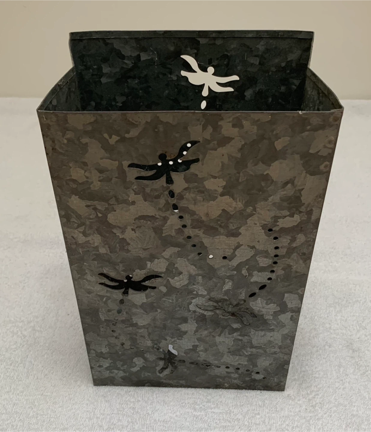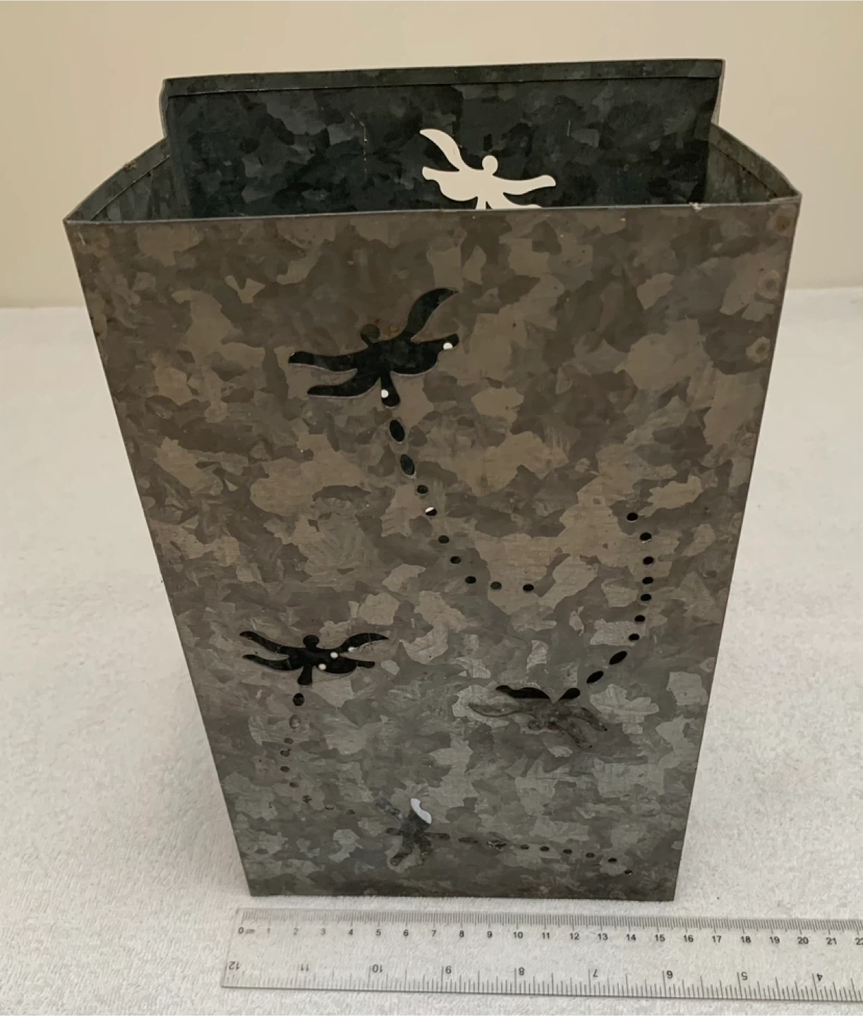 0 reviewsMetal candle feature with dragonfly-shaped holes. Measures roughly 15 x 10 x 25 cm.