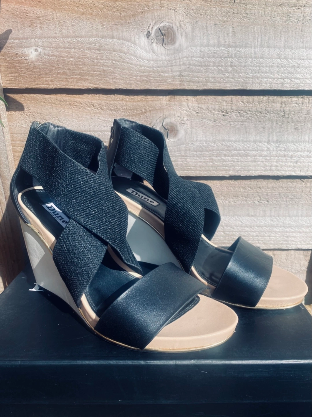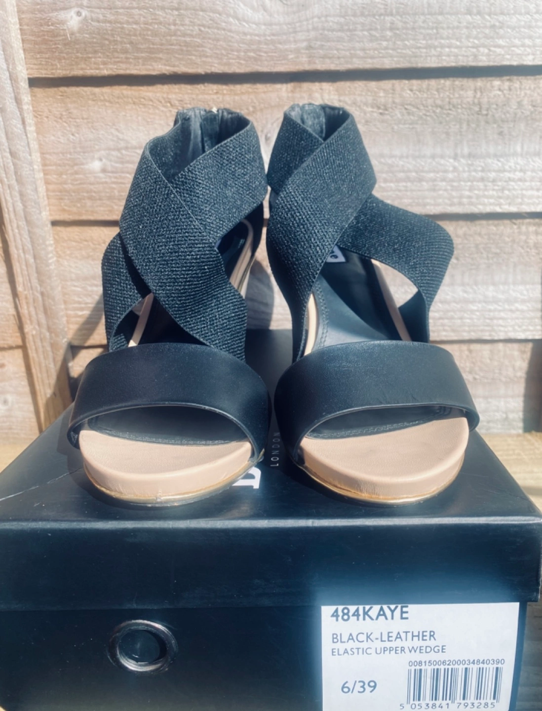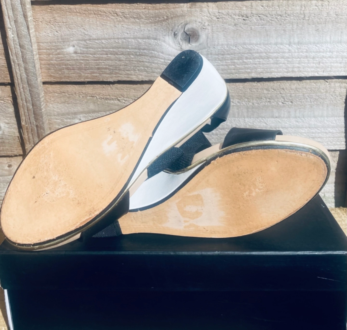 55 reviewsWedge sandals. Black leather and elastic upper. Size 6. Beige coloured sole and heel. Zip fastening.