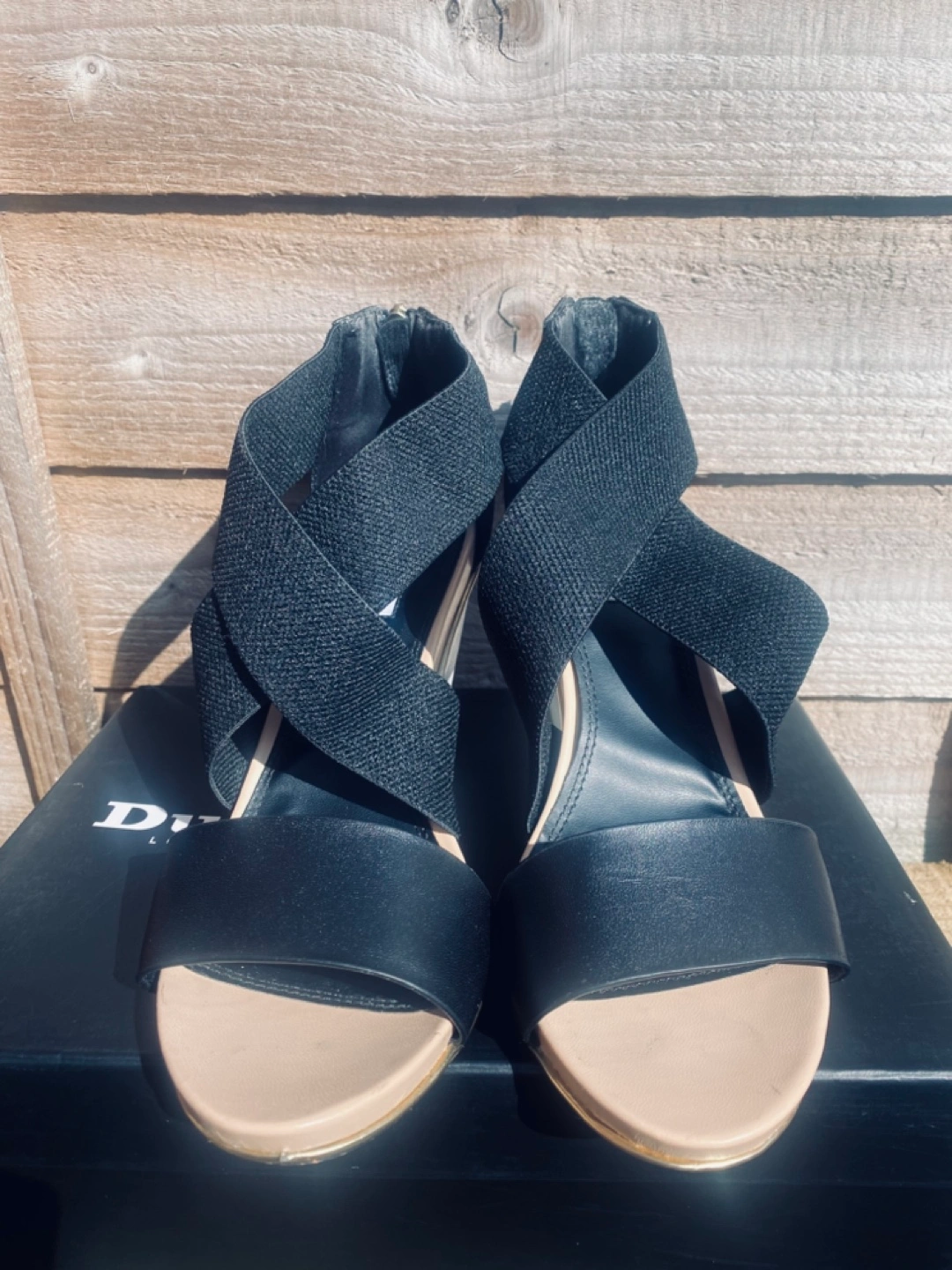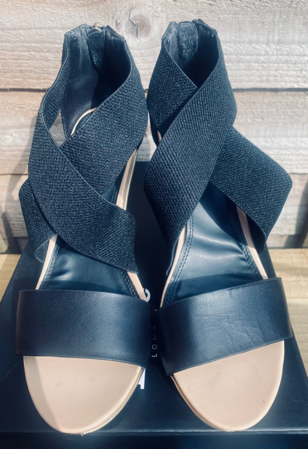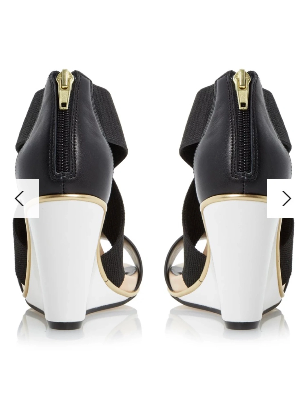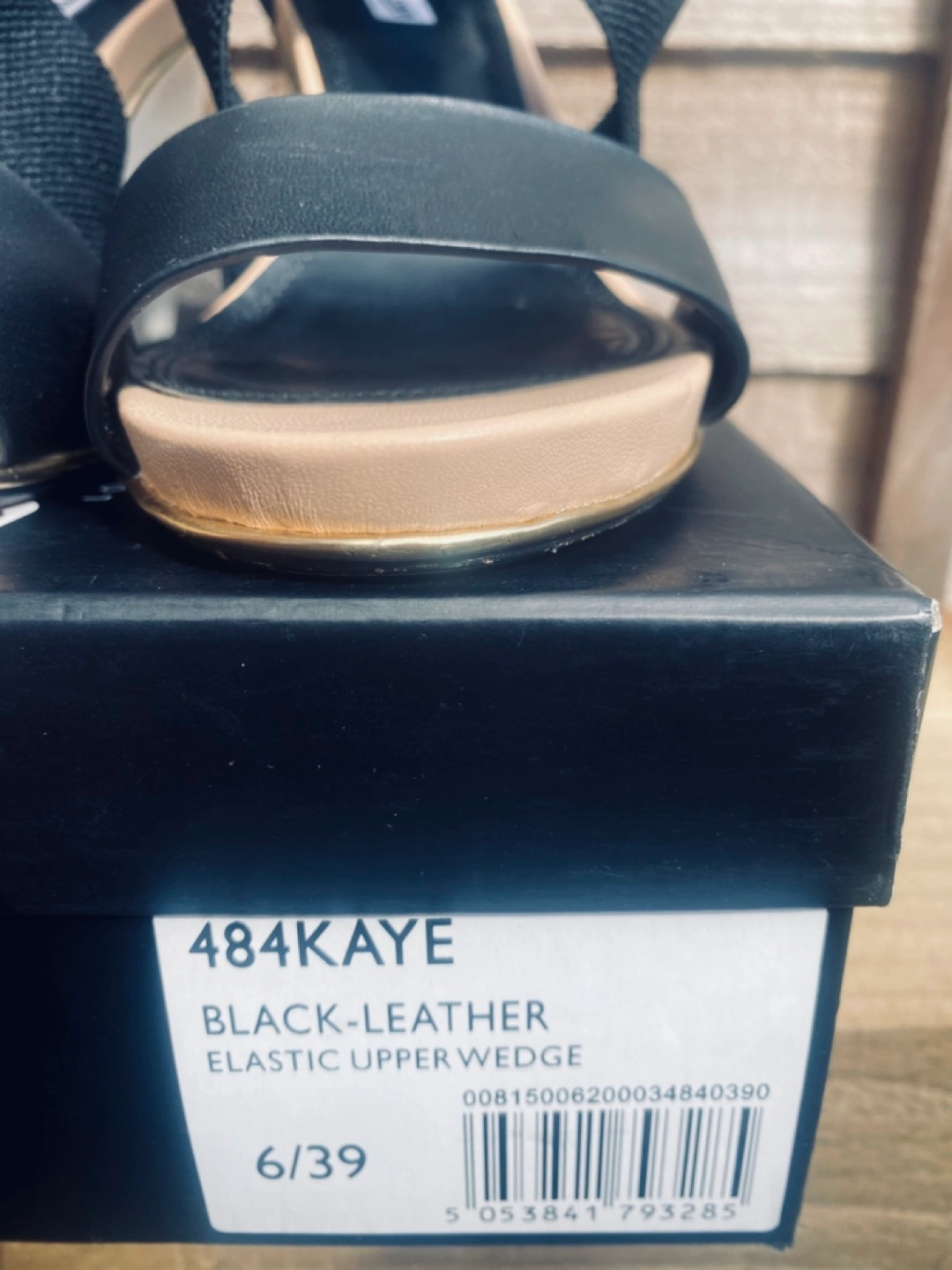 55 reviewsWedge sandals. Black leather and elastic upper. Size 6. Beige coloured sole and heel. Zip fastening.