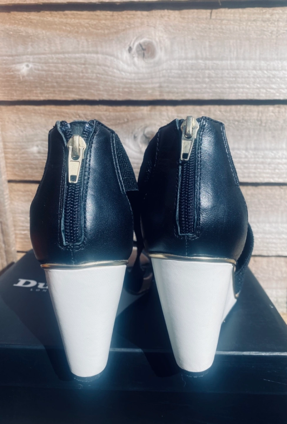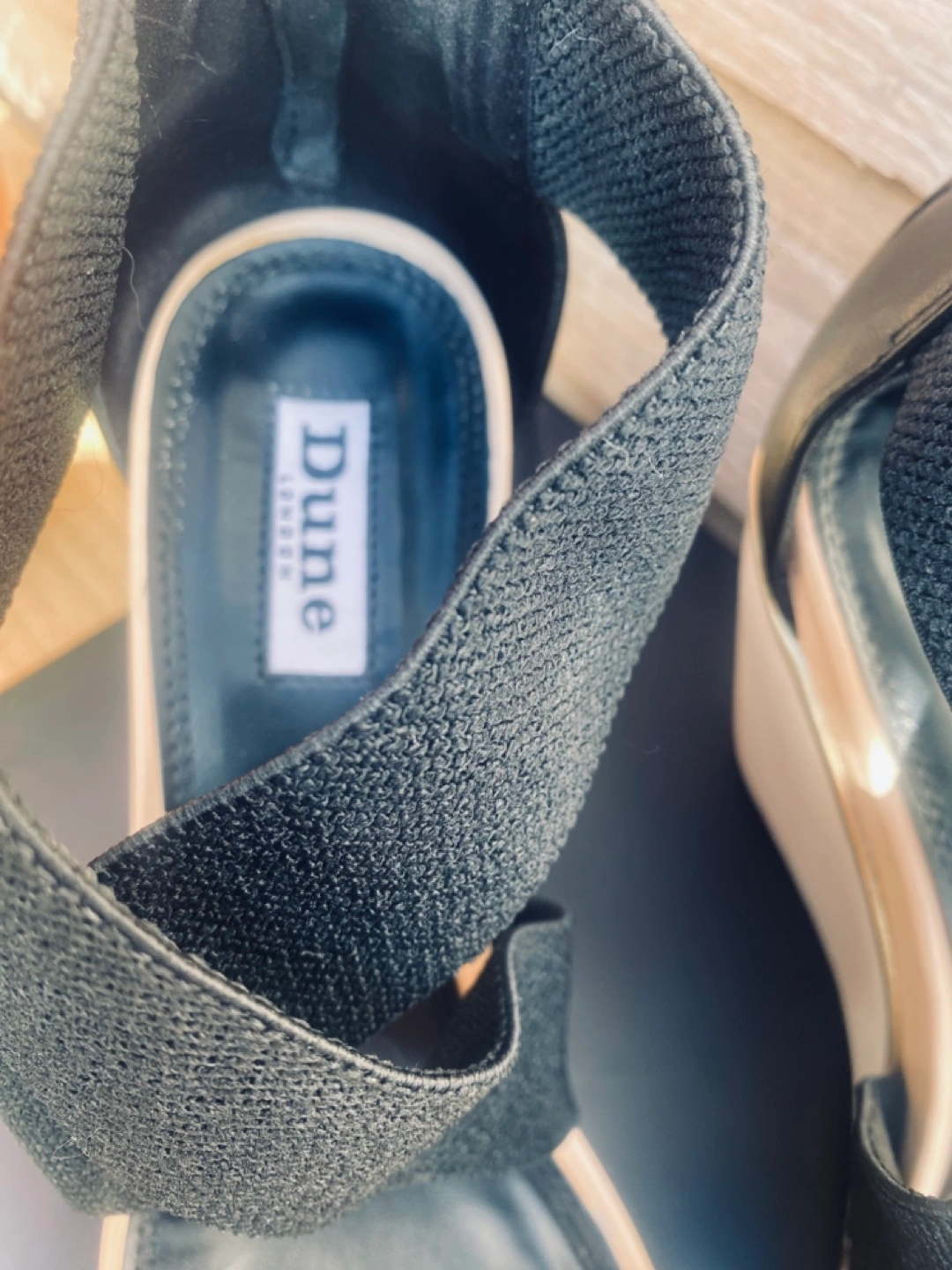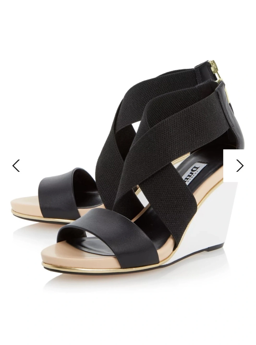Show allDune Black Leather Elastic Upper Wedge Sandals - Size 6