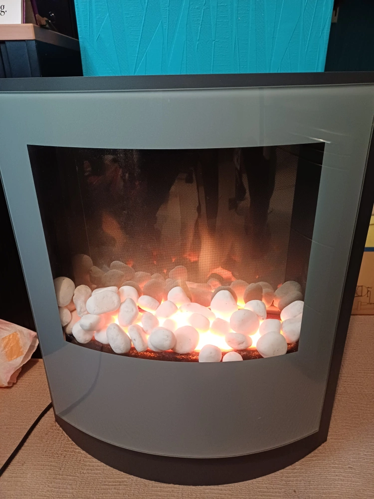 1 reviewCurved electric fire. Grey and black finish. White pebbles. Good condition. With remote.