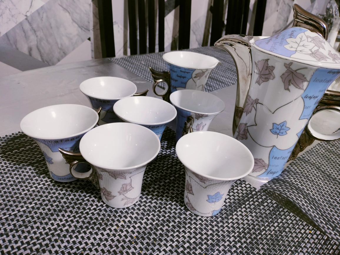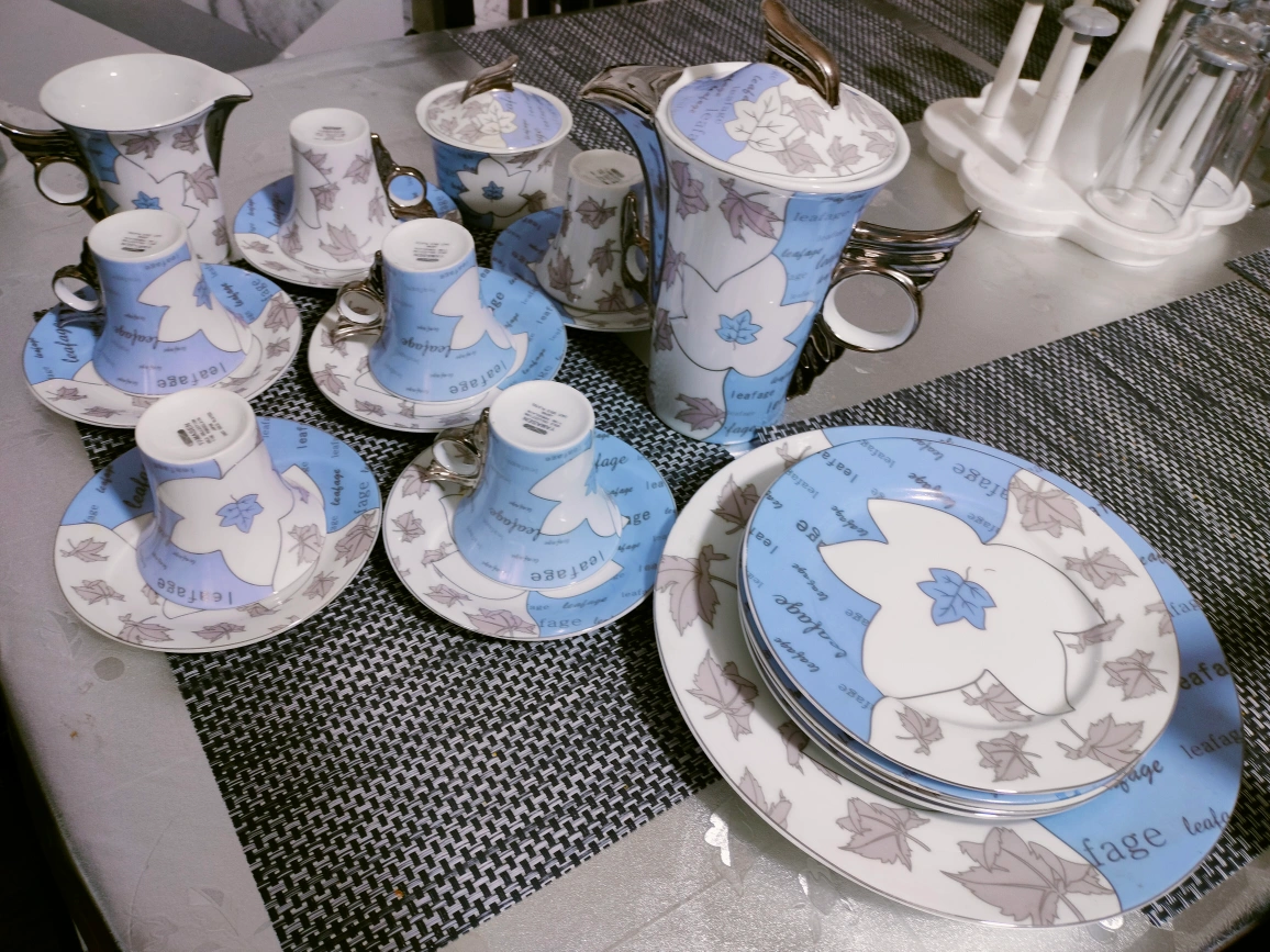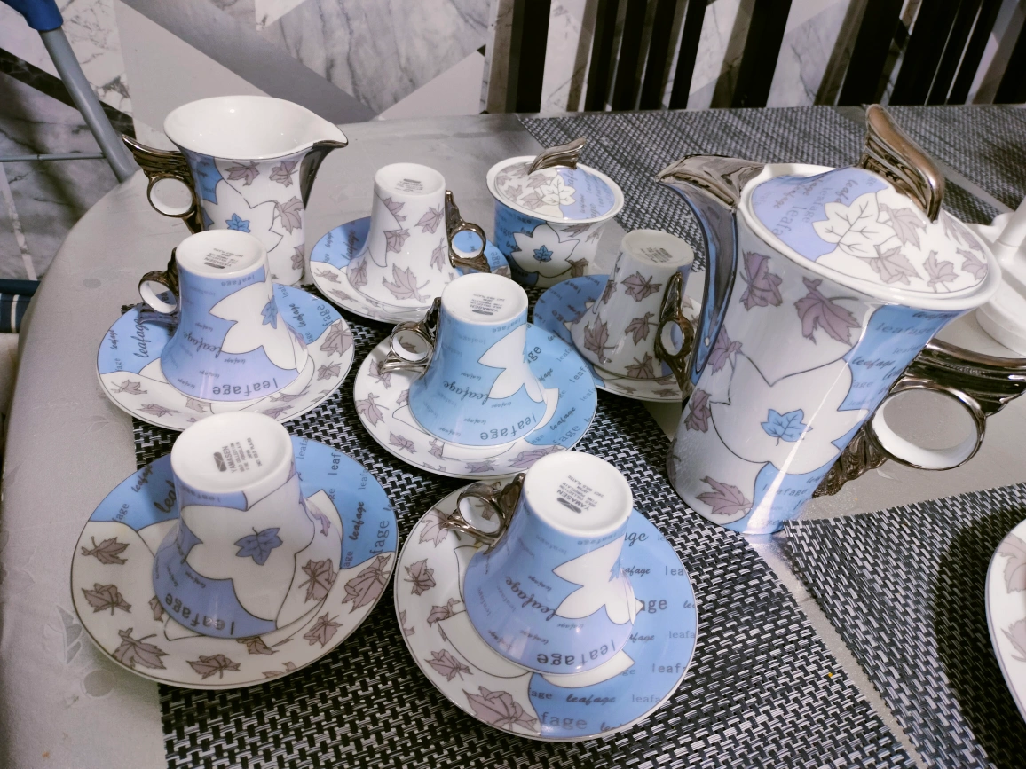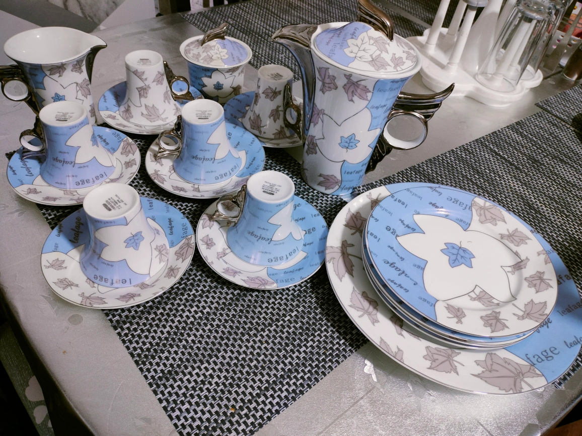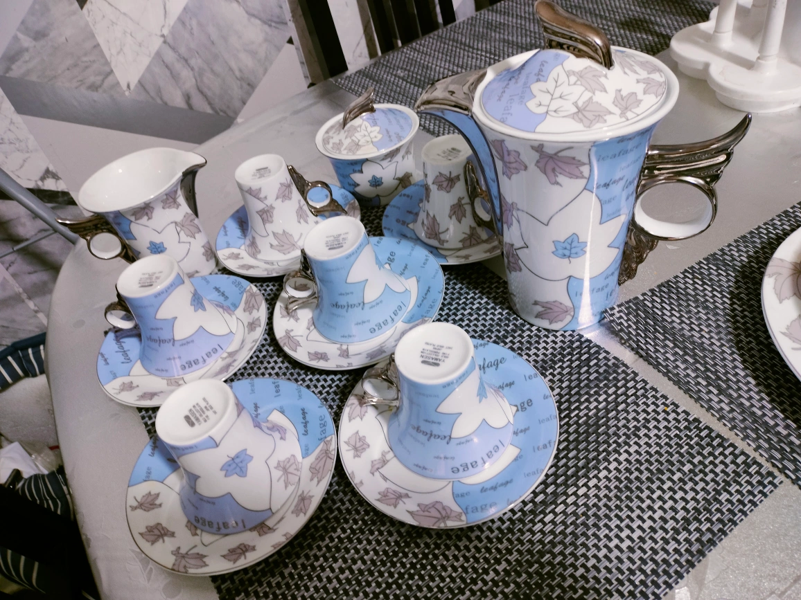 0 reviewsBeautiful coffee set, six cups and saucers, teapot, milk jug and sugar bowl. Leaf pattern, blue and grey tones. Silver detailing on handles and teapot spout. Looks unused.