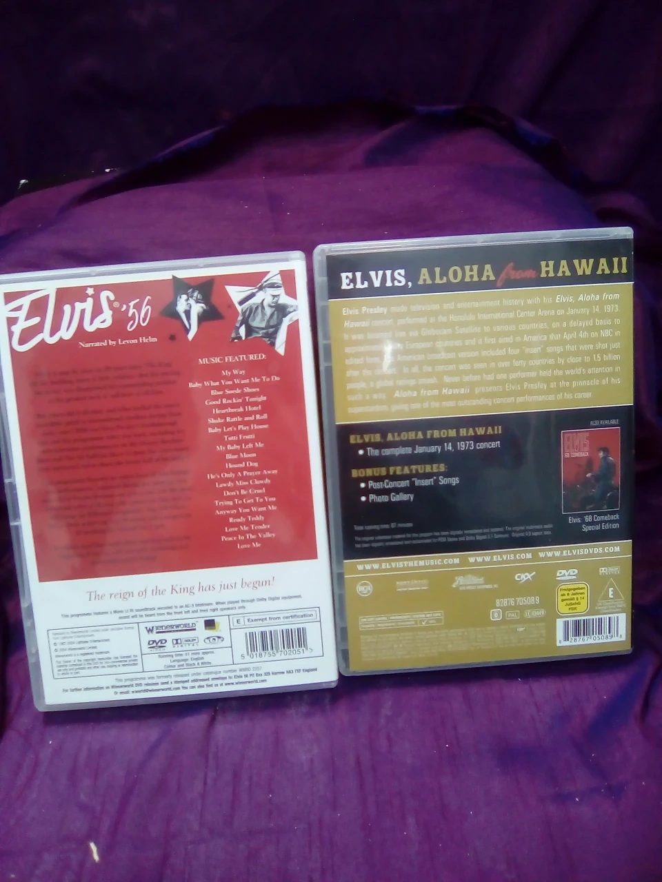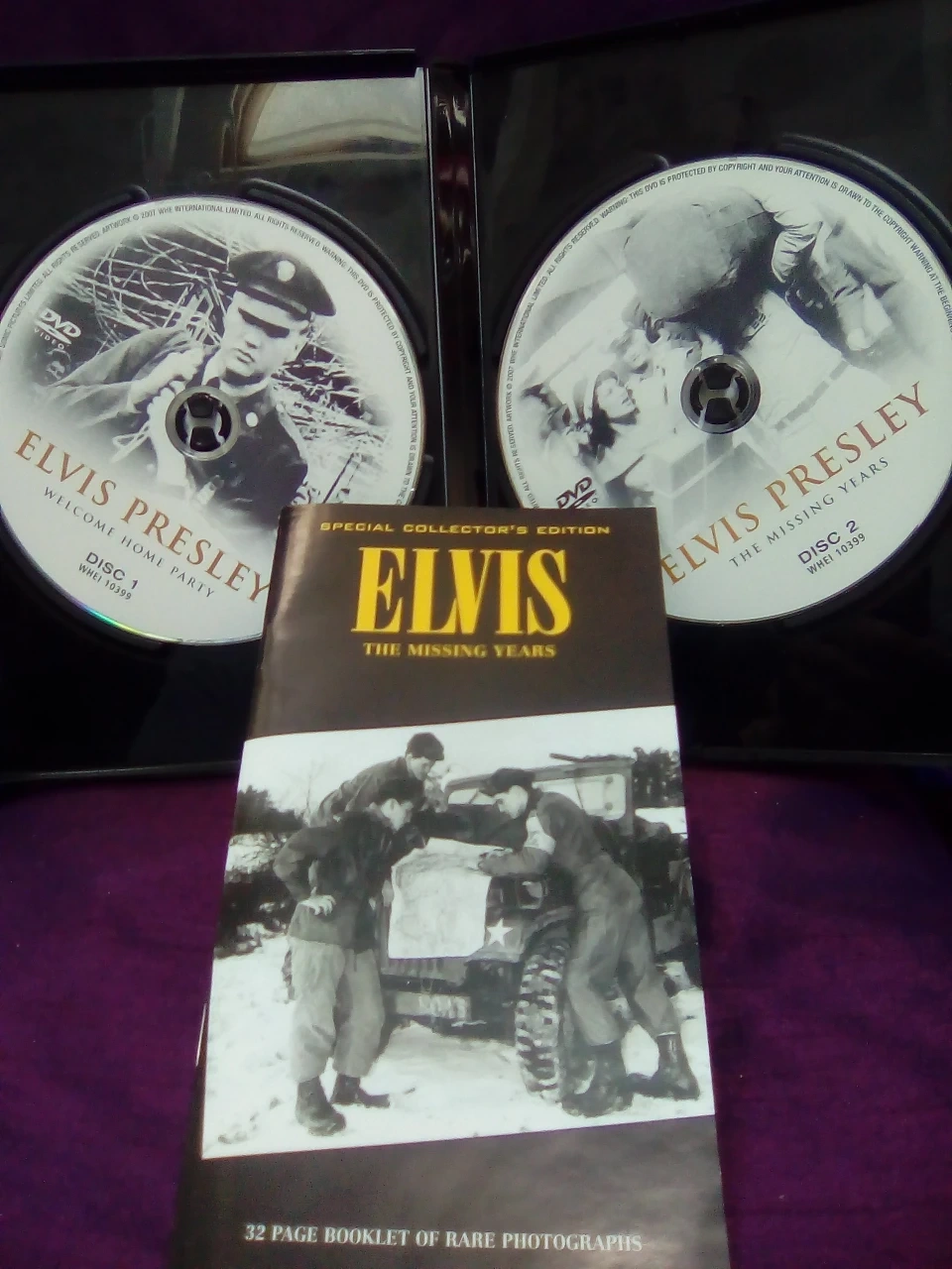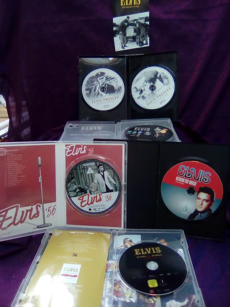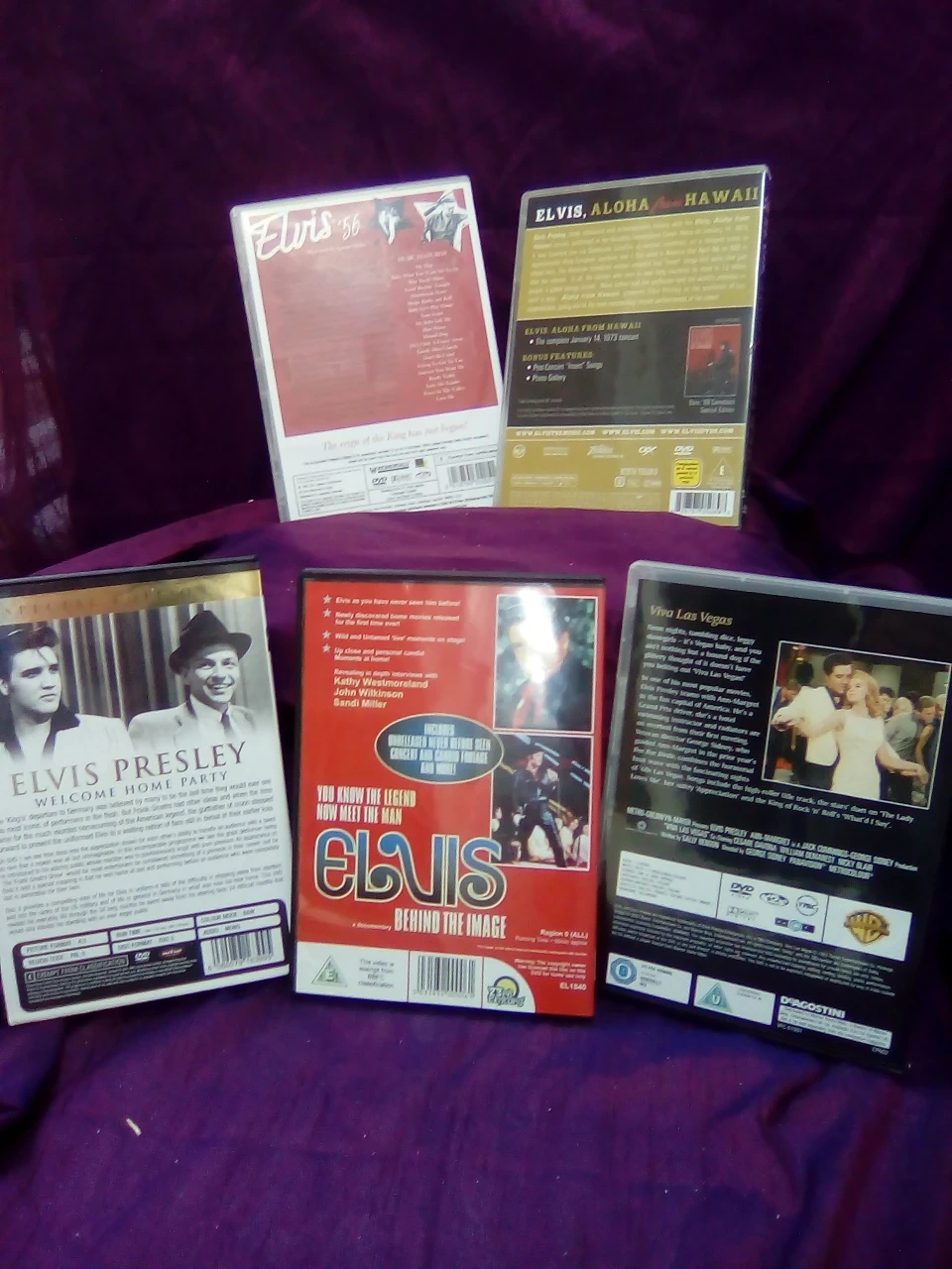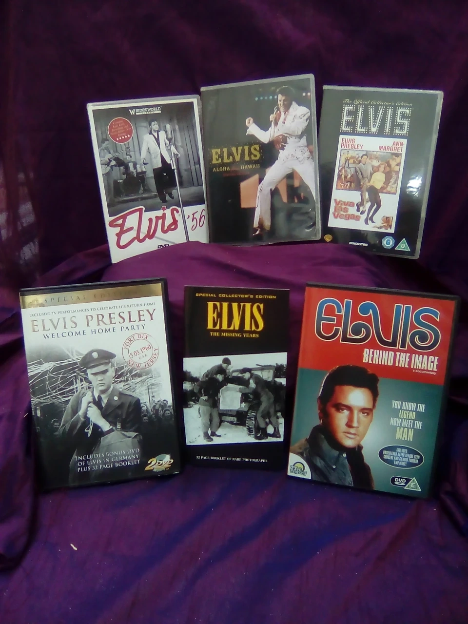 5 reviewsA collection of Six Elvis Presley DVDs, 4 singles and a Double Elvis Presley Welcome Home Party. This took place on His return home from Germany and an appearance on the Frank Sinatra Show. Please see all the Pics of the other DVDs. All Discs are original, no copies and of very good quality.
