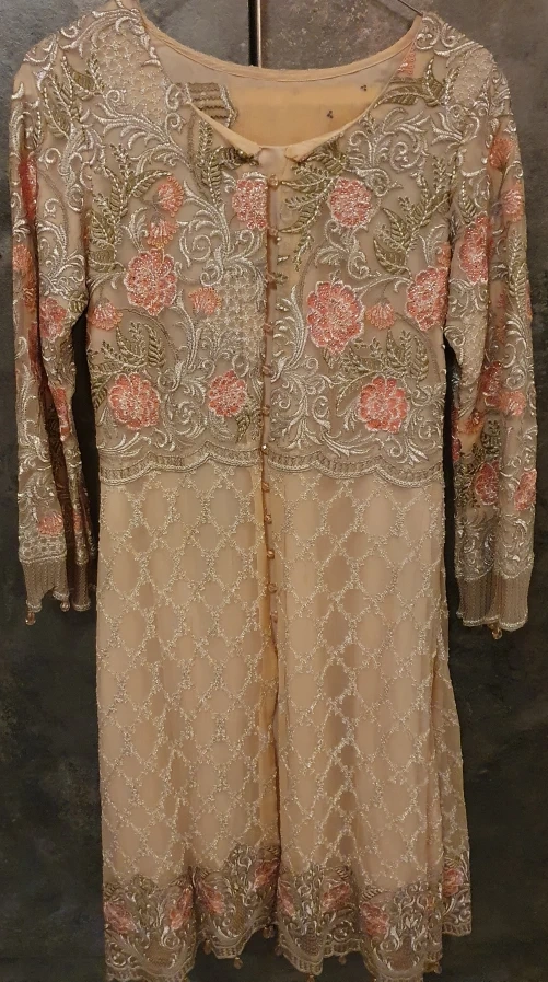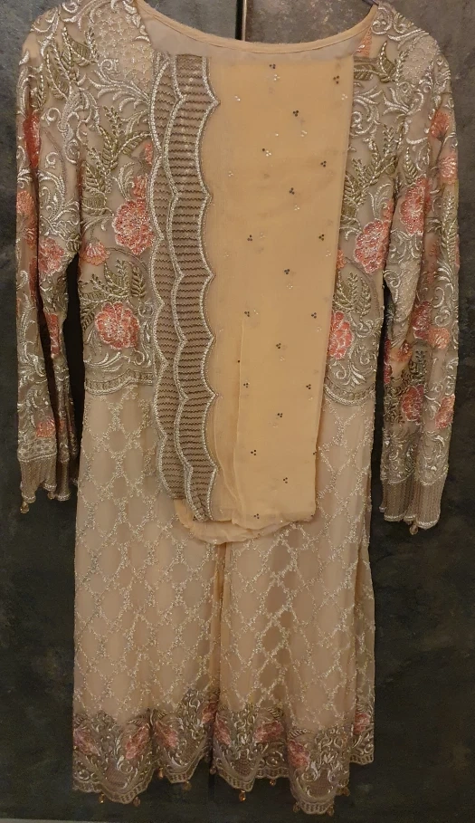 13 reviewsA lovely embroidered Asian outfit, perfect for special occasions. It features intricate detailing and a delicate colour palette. It's in excellent condition. Size 8 (Miss placed the bottom hence the price) Can be worn with any plain peach, gold, ligh pink bootoms Collection or can post for the cost of p&p No Offers Please