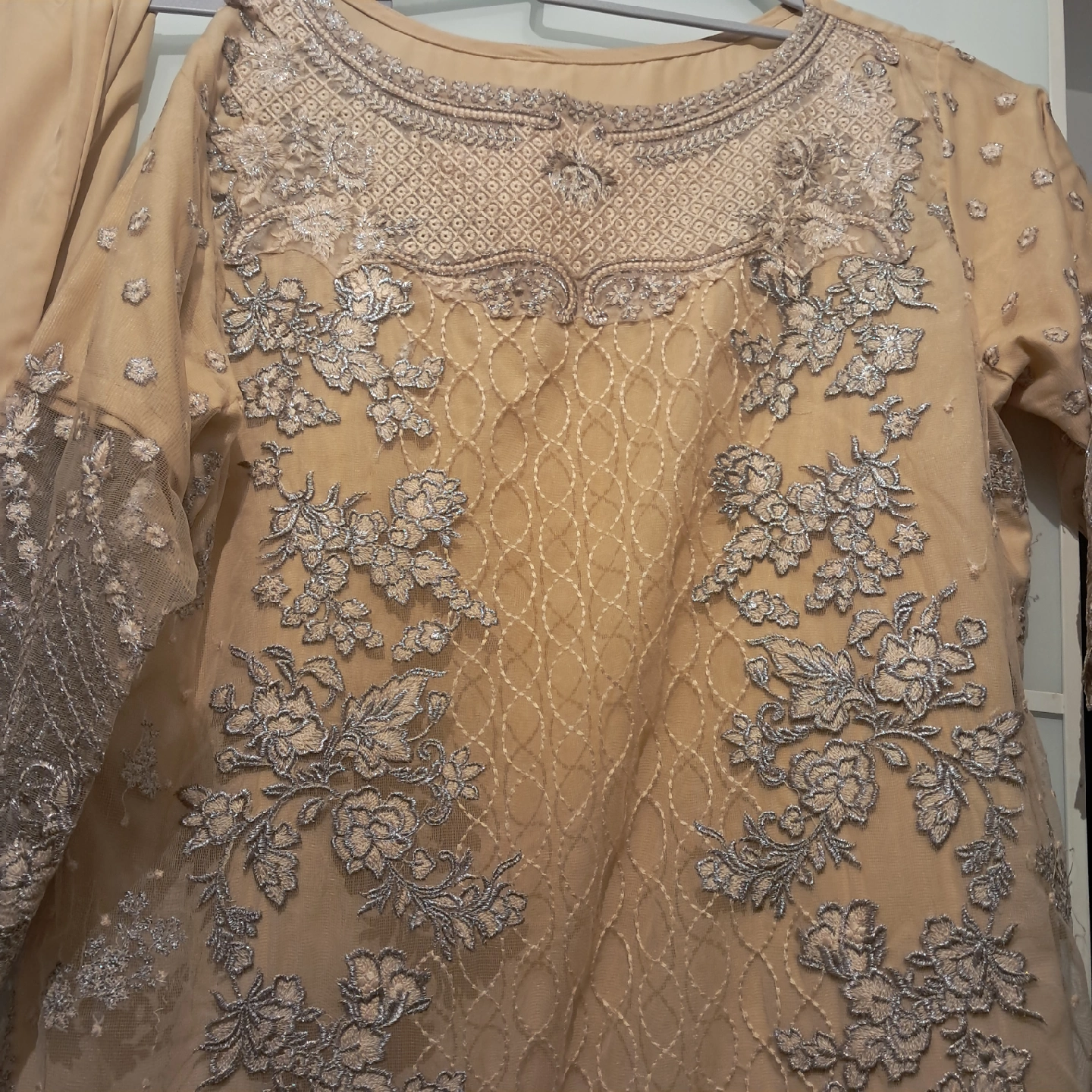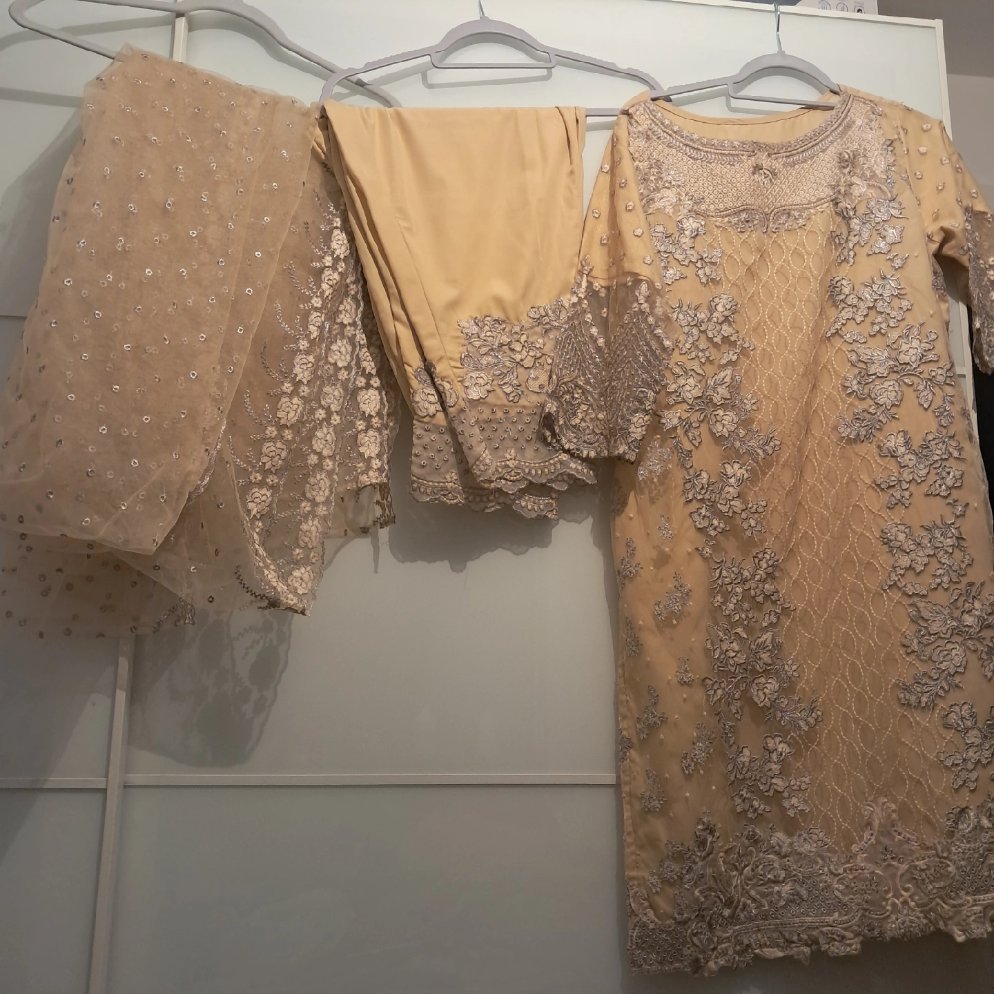 9 reviewsLovely salwar kameez suit with intricate embroidery. The set includes the kameez (top), salwar (trousers), and dupatta (scarf). It's in great condition and would be perfect for a special occasion this is a used item but good condtion ready to wear size large 14-16 womens