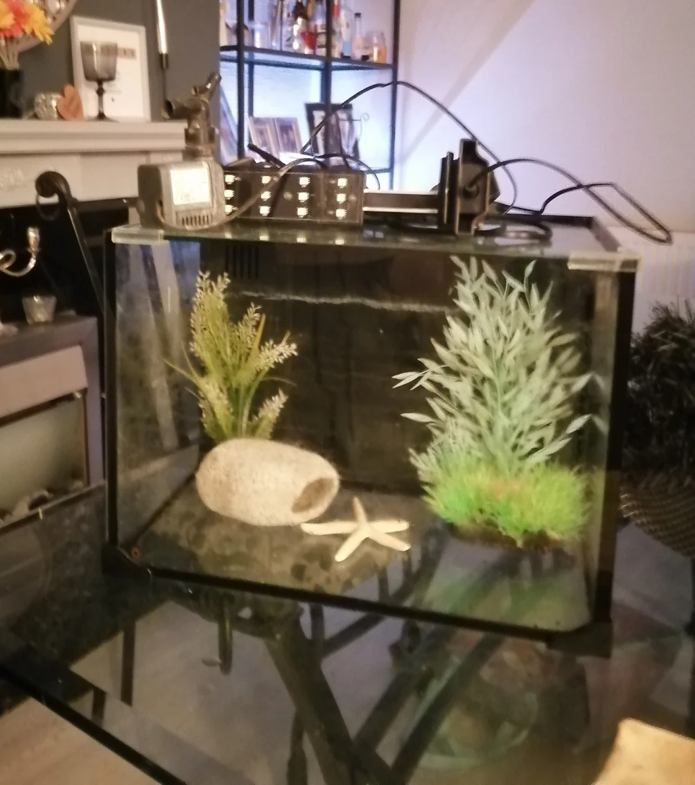 Dimensions: W14"x H10"xD10" Comes with air pump, light, ornaments and gravel. Has a glass lid you can remove completely. I have given it a wash but could do with another. Collection only.