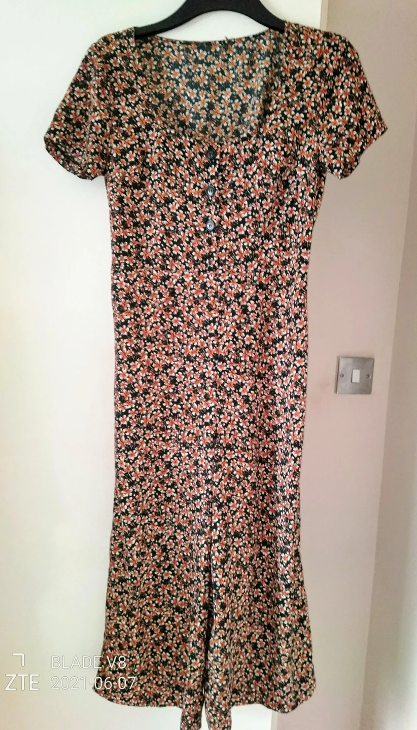 3 reviewsNew ocre floral culottes jumpsuit. lovely colours and just right for summer. it's a size 12 with short sleeves and buttons to the waist.
