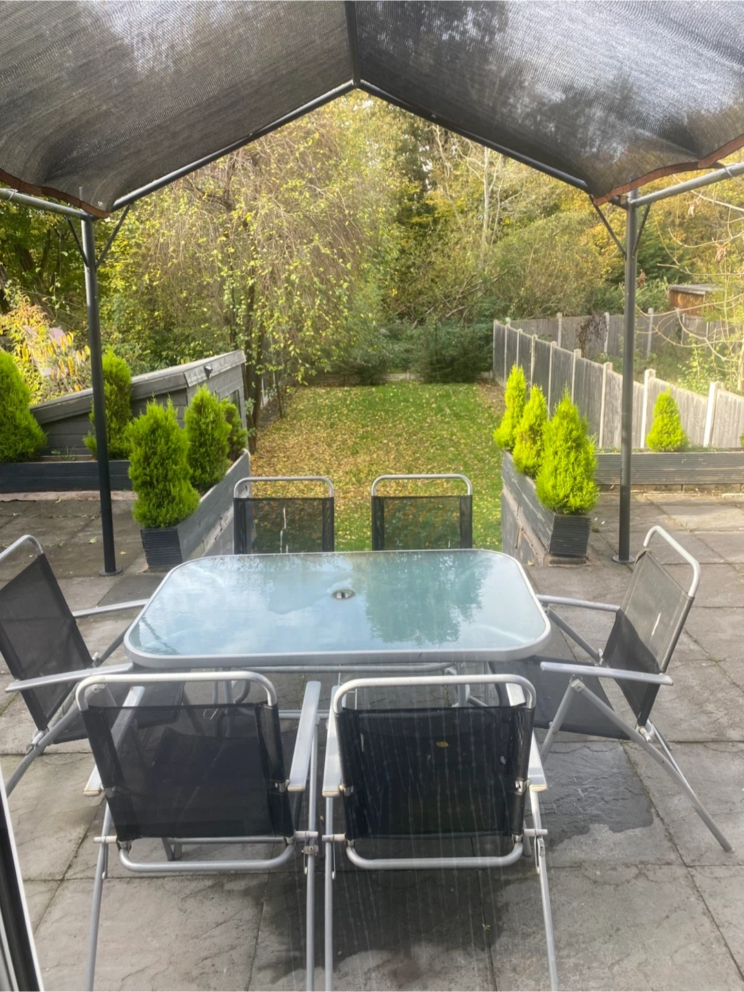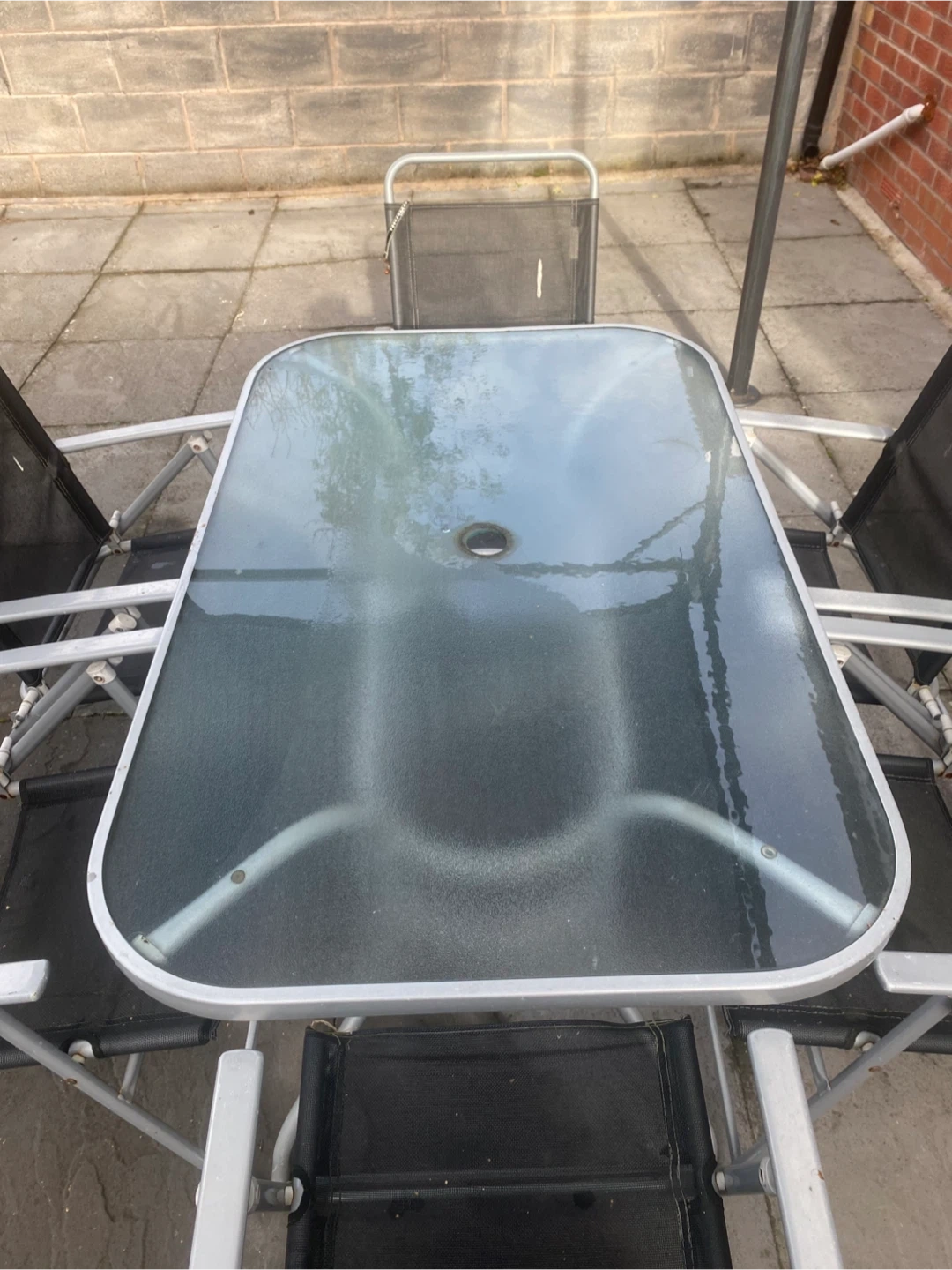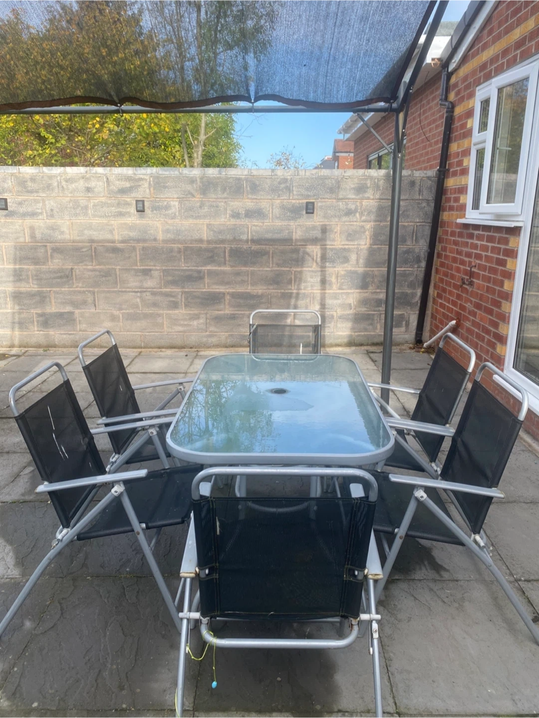 1 reviewSelling a garden table with six chairs. Perfect for enjoying the outdoors. The set features a glass table top and foldable chairs with a mesh fabric. Ideal for garden parties or a relaxing outdoor meal