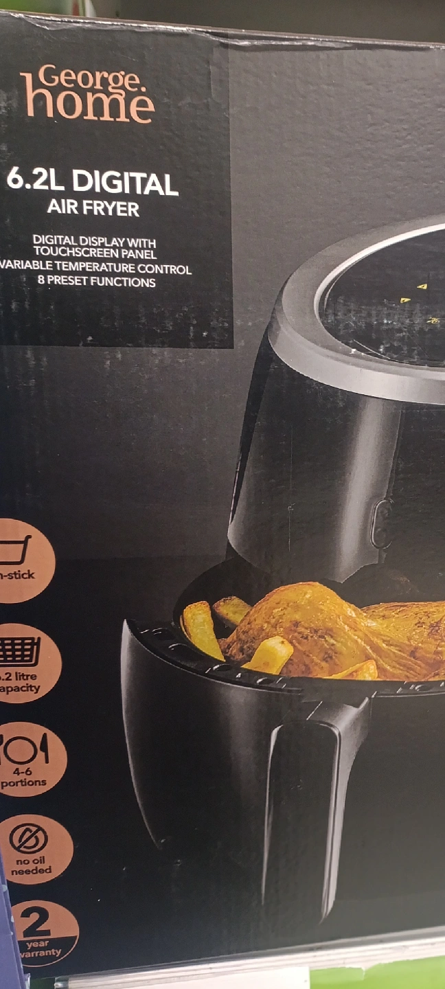 3 reviewsSelling a George Home 6.2L digital air fryer. It features a digital display with a touchscreen panel and variable temperature control. There are also 8 preset functions. It's non-stick and has a 6.2 litre capacity, enough for 4-6 portions. No oil is needed!