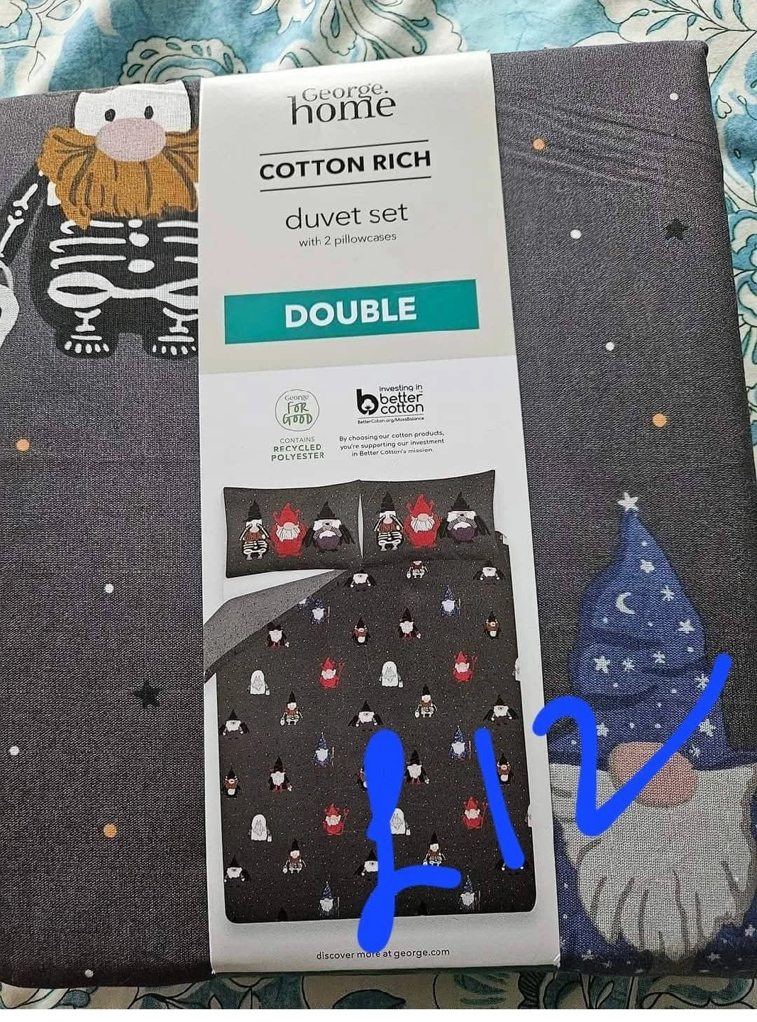 30 reviewsHere's a George Home cotton rich duvet set for a double bed, complete with two pillowcases. It's made with recycled polyester and features a fun gnome design
