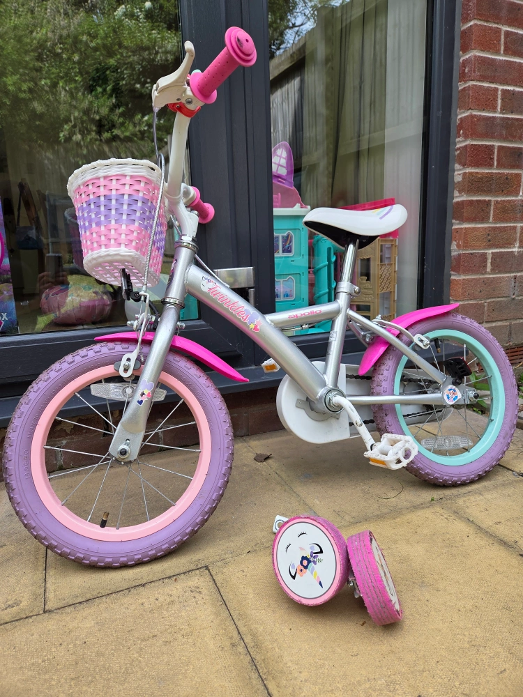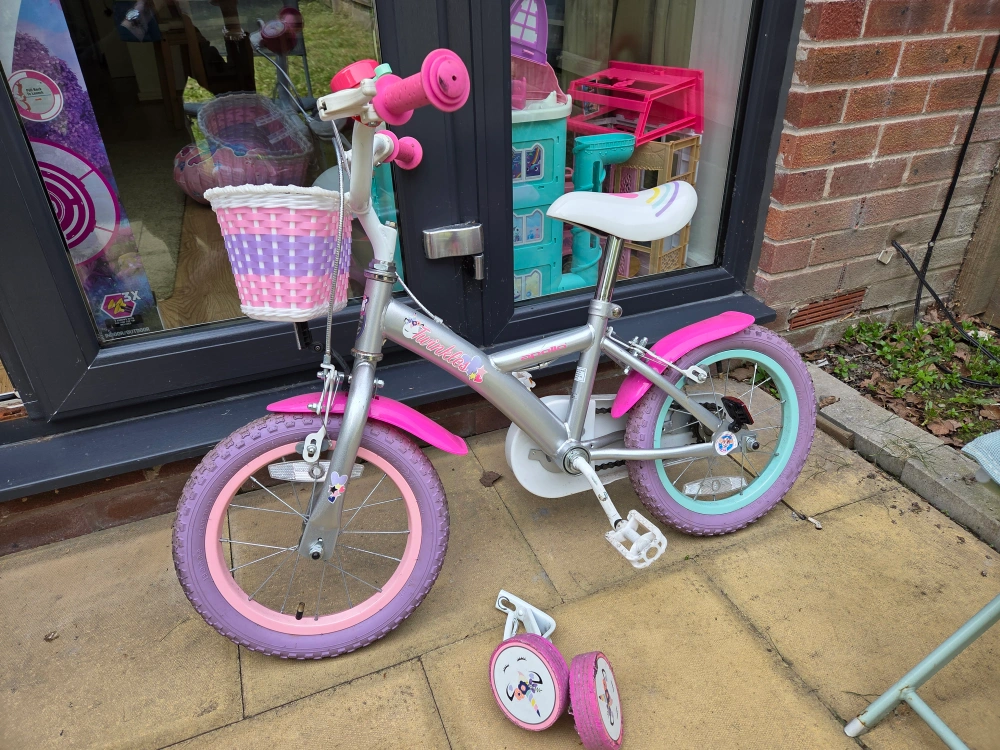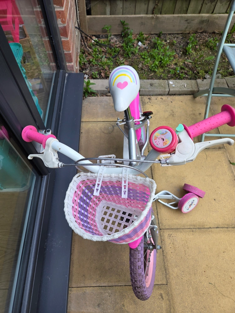 1 reviewLovely girls' bike, 12 inch wheels. Pink and purple colour scheme. Includes a front basket and stabilisers and a bell. Suitable for younger children. adjustable seat. used but in very good condition