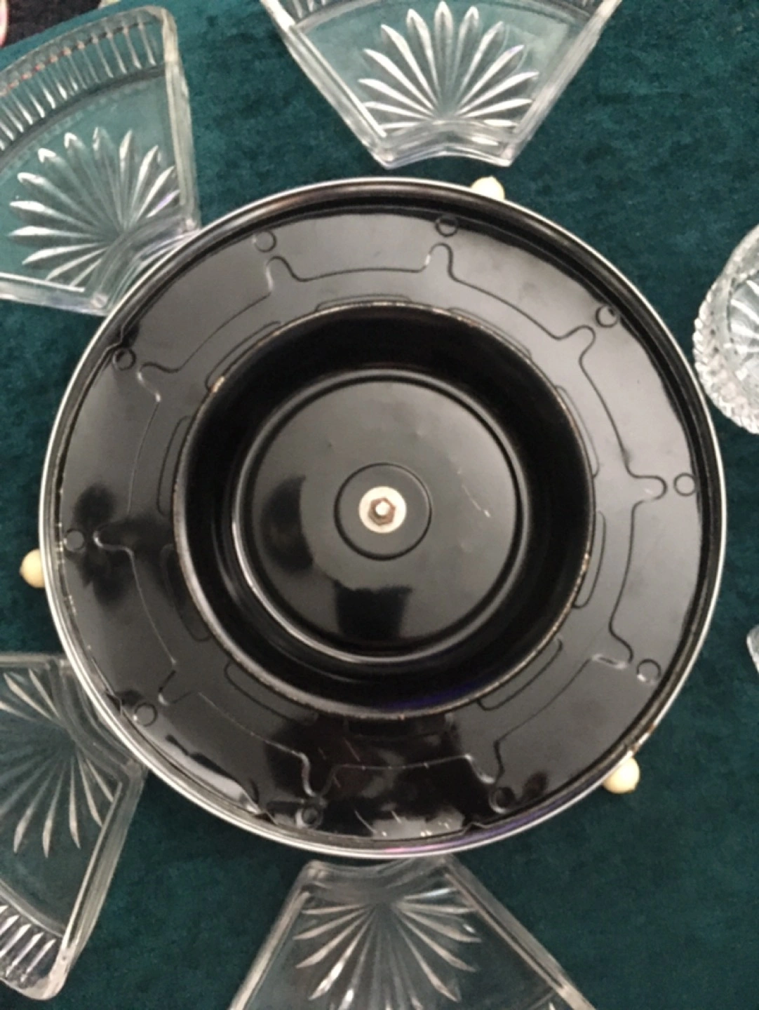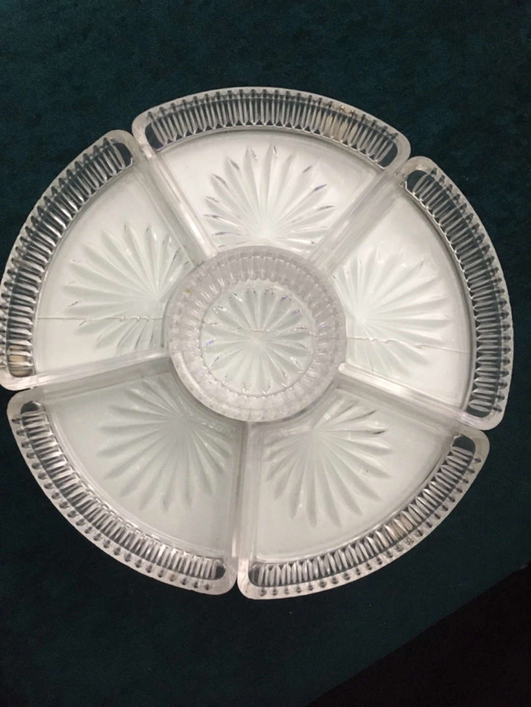 39 reviewsPriced low as there is a crack in the base lazy Susan unit. This does not affect its use. There is 1 small chip on one of the outside serving dishes, other than that it’s in great condition, considering it’s about 40 years old.