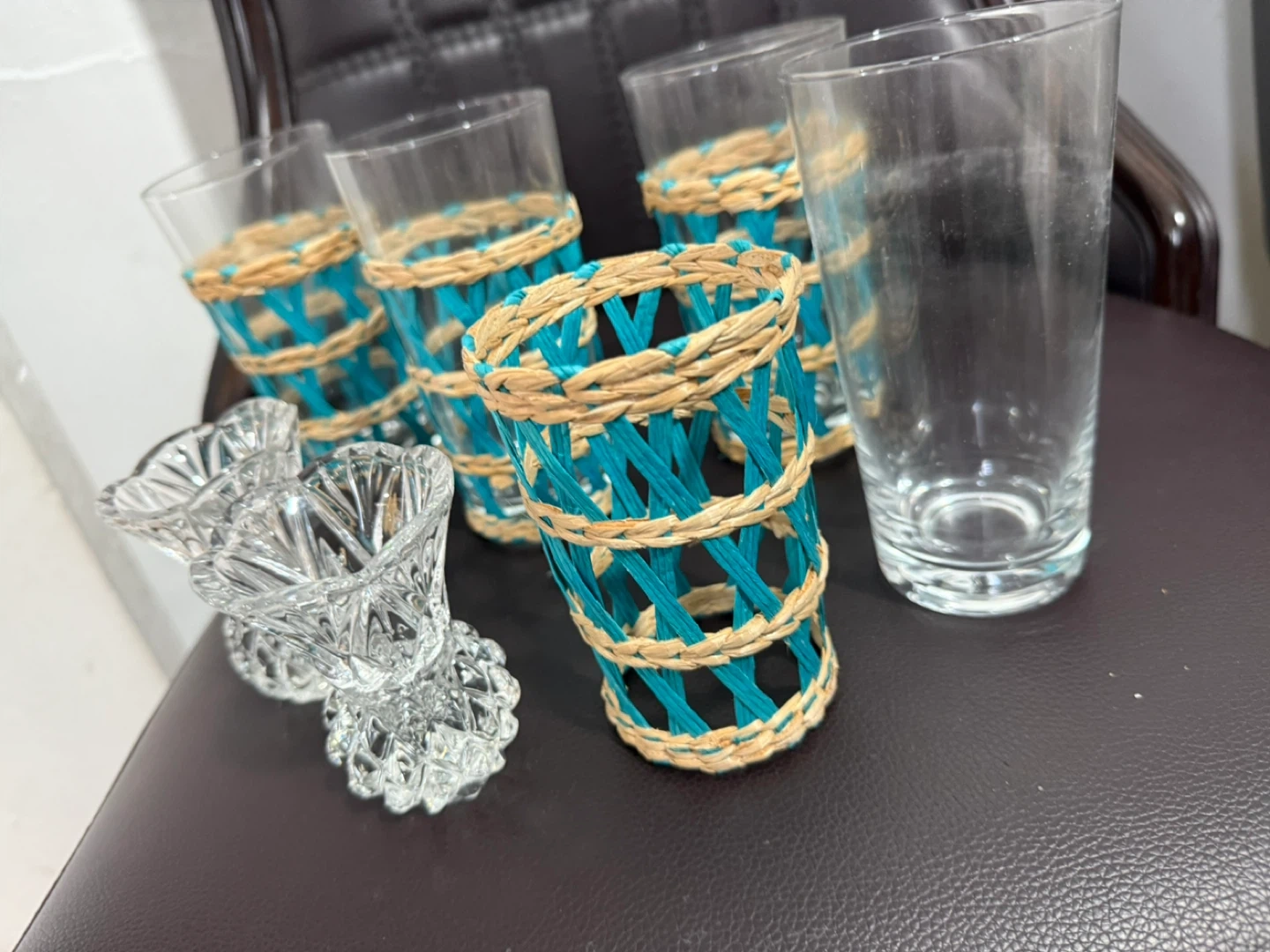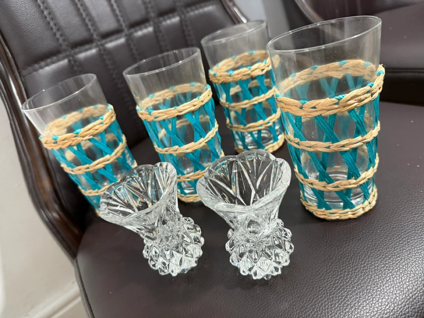 17 reviewsSelling a set of glass tumblers, each with a unique woven holder featuring a lovely turquoise and natural straw design. Also included are two small crystal vases, perfect for adding a touch of elegance to any room. These are in great condition and ready for a new home