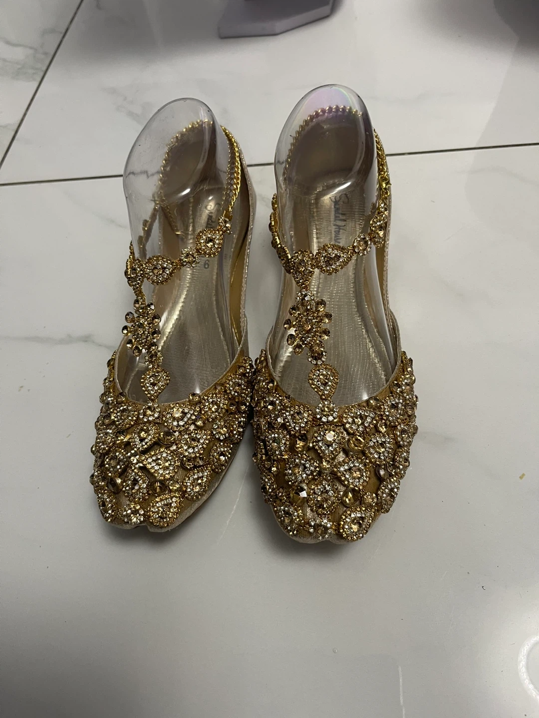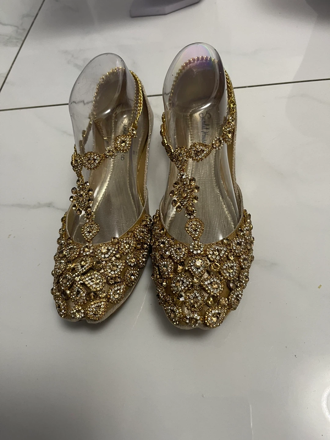 0 reviewsThese are a stunning pair of gold embellished bridal shoes, perfect for adding a touch of sparkle to your special day. Brand new it’s only For £20 original price £35