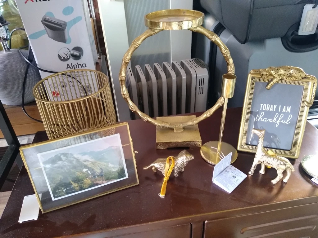 21 reviewsSelling a lovely bundle of gold-toned home decor items! Includes a decorative candle holder, a wire basket, and two picture frames. One frame has a cute 'Today I am Thankful' print, and there are also some charming animal figurines. Perfect for adding a touch of glam to your space