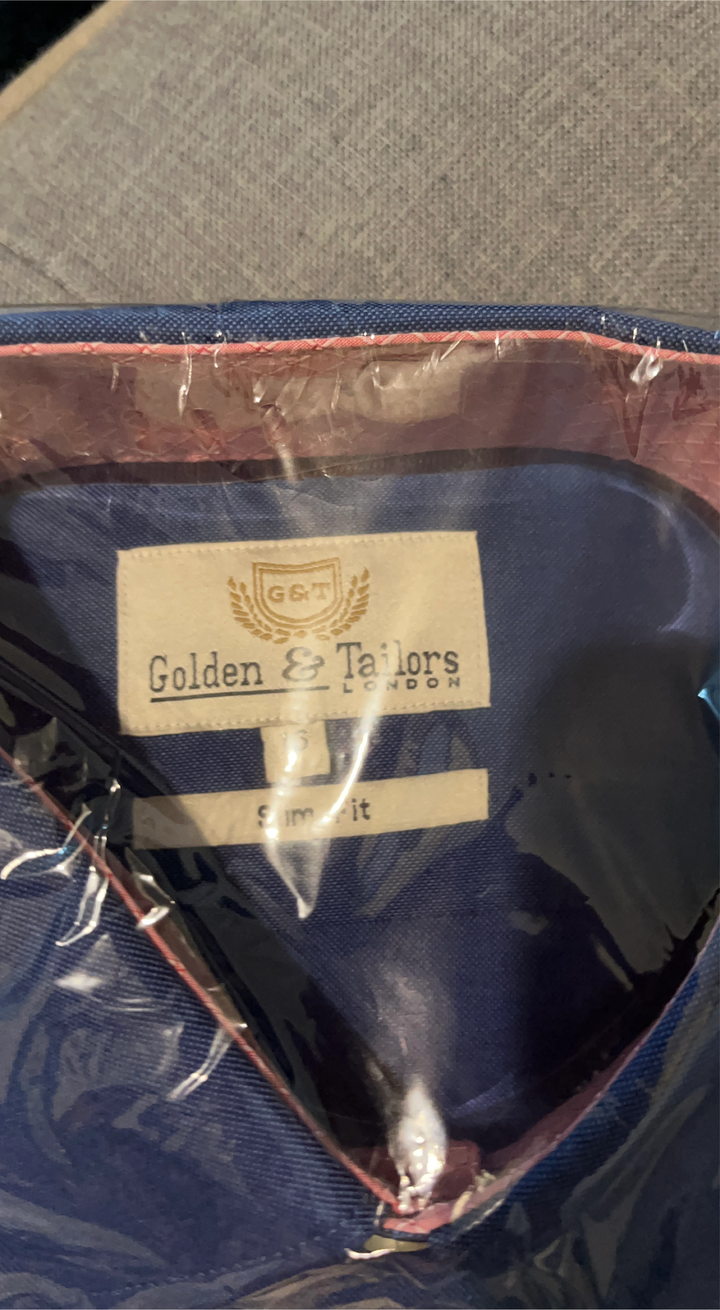 2 reviewsHere's a brand new shirt from Golden & Tailors of London. It's a size small and has a slim fit. Still in its original packaging!