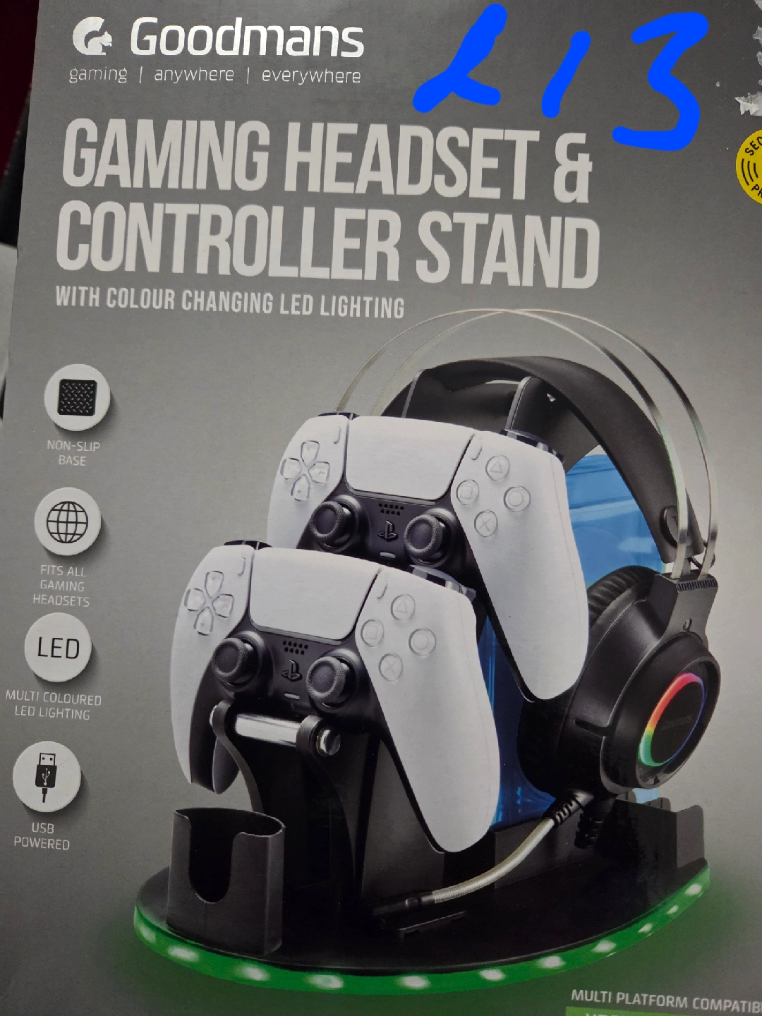30 reviewsbrand new Goodmans gaming headset and controller stand with colour changing LED lighting. It has a non-slip base and fits all gaming headsets. It's also multi platform compatible and USB powered