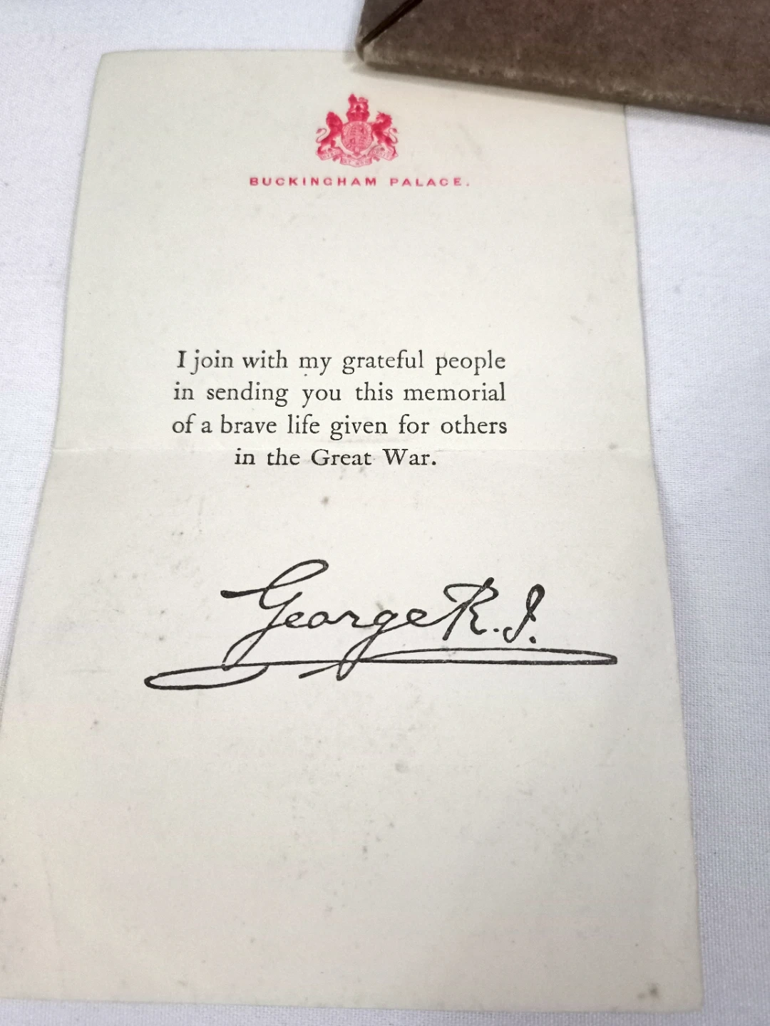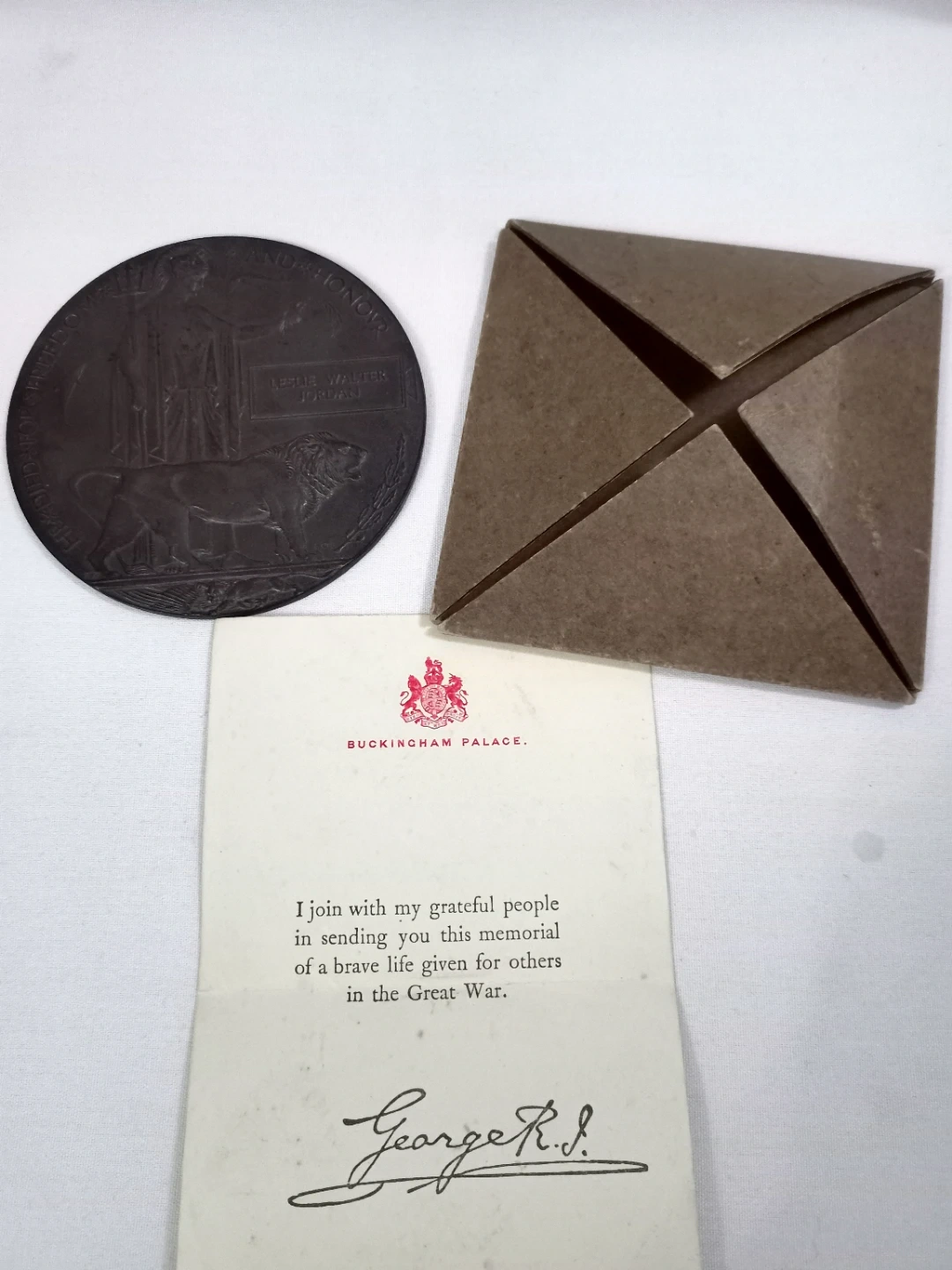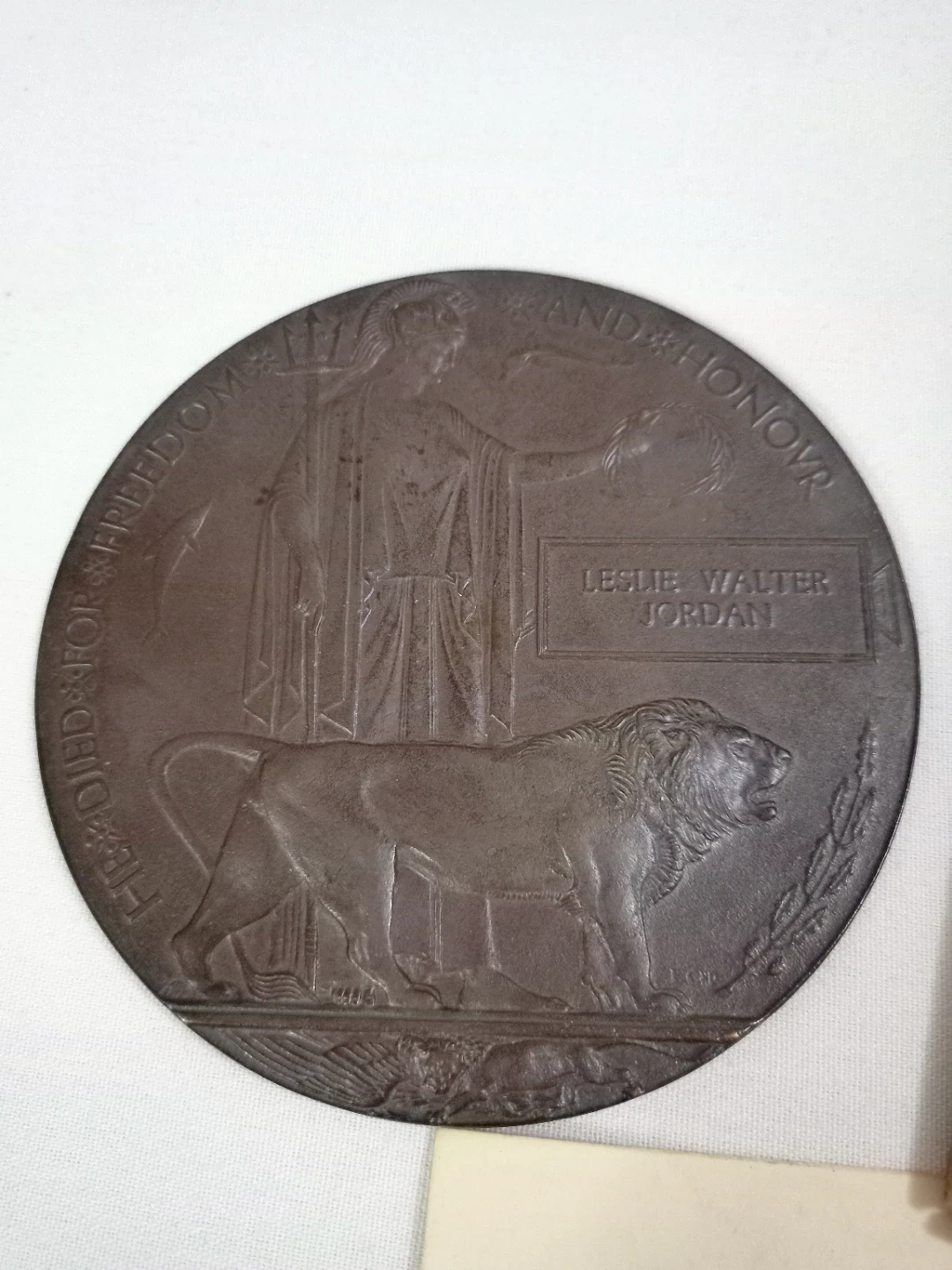 149 reviewsGREAT WAR BRONZE DEATH PENNY/ PLAQUE 4 3/4" WIDE GREAT PATINA 'LESLIE WALTER JORDAN' WITH ORIGINAL OUTER ENVELOPE PACKAGING & SHORT MEMORIAL BUCKINGHAM PALACE HEADED PAPER KING GEORGE.