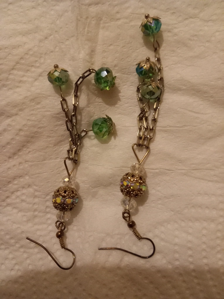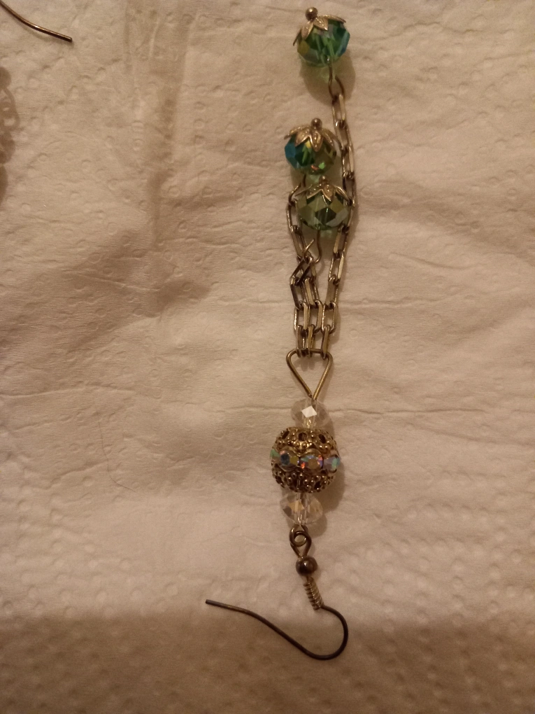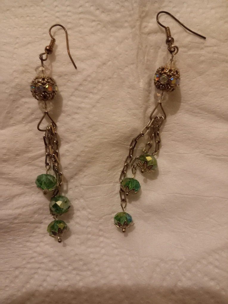 8 reviewsBeautiful handmade drop earrings. Features green crystal beads and gold-toned metal chain and beads. Elegant and eye-catching design. Perfect for adding a touch of sparkle to any outfit. Costume earrings Denton m34